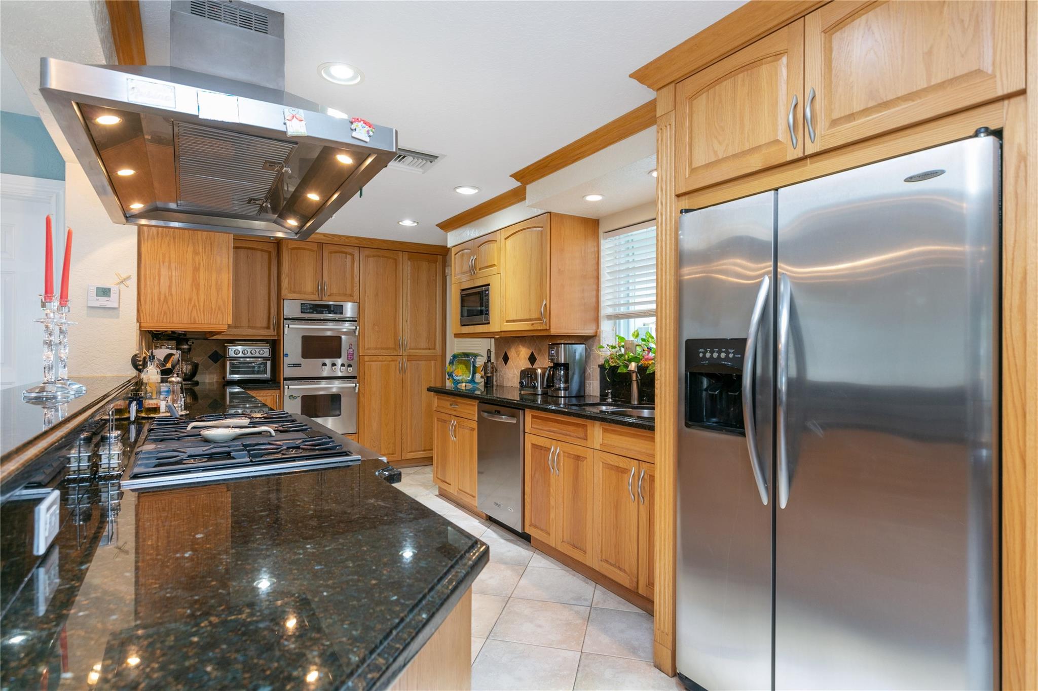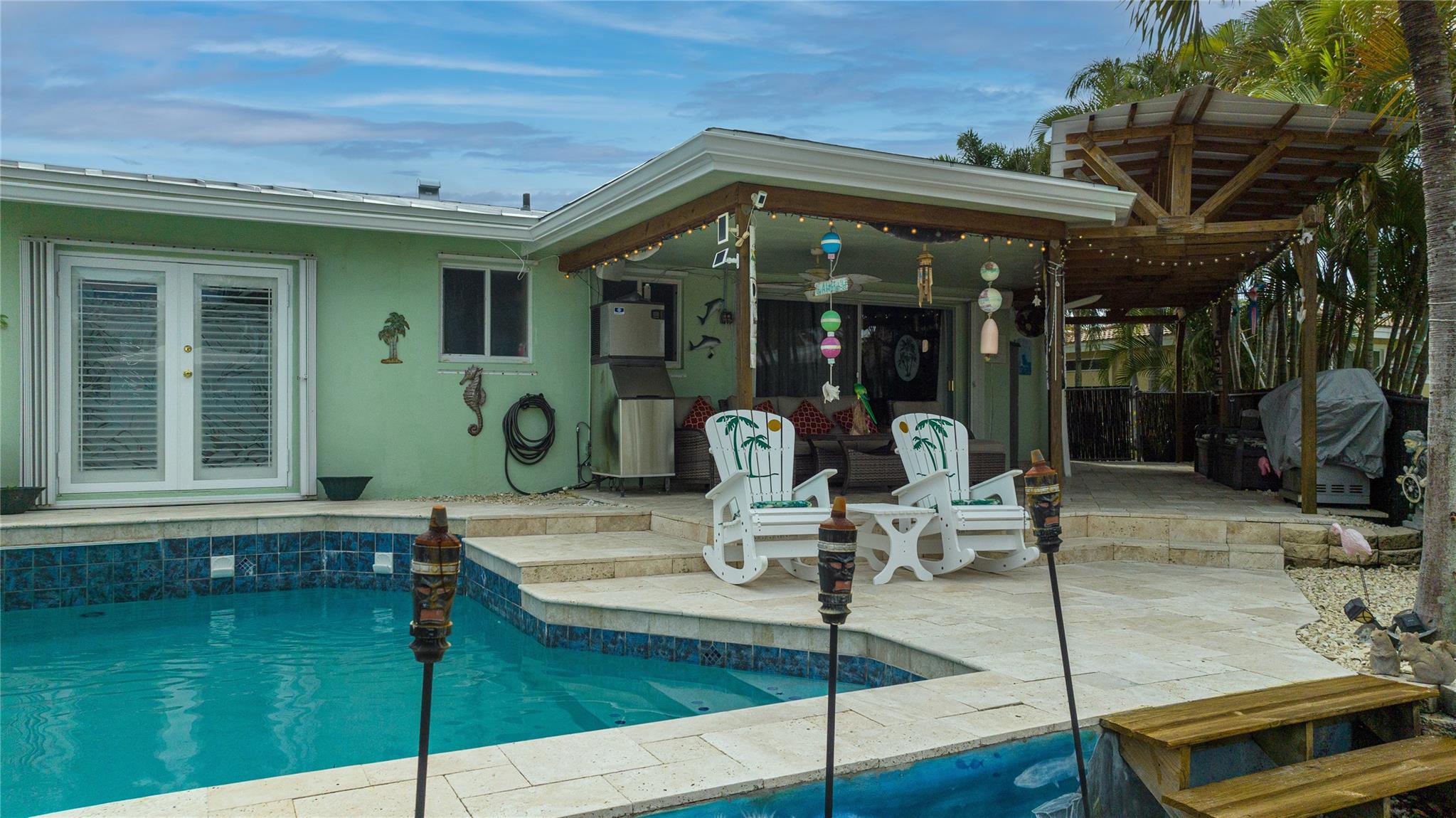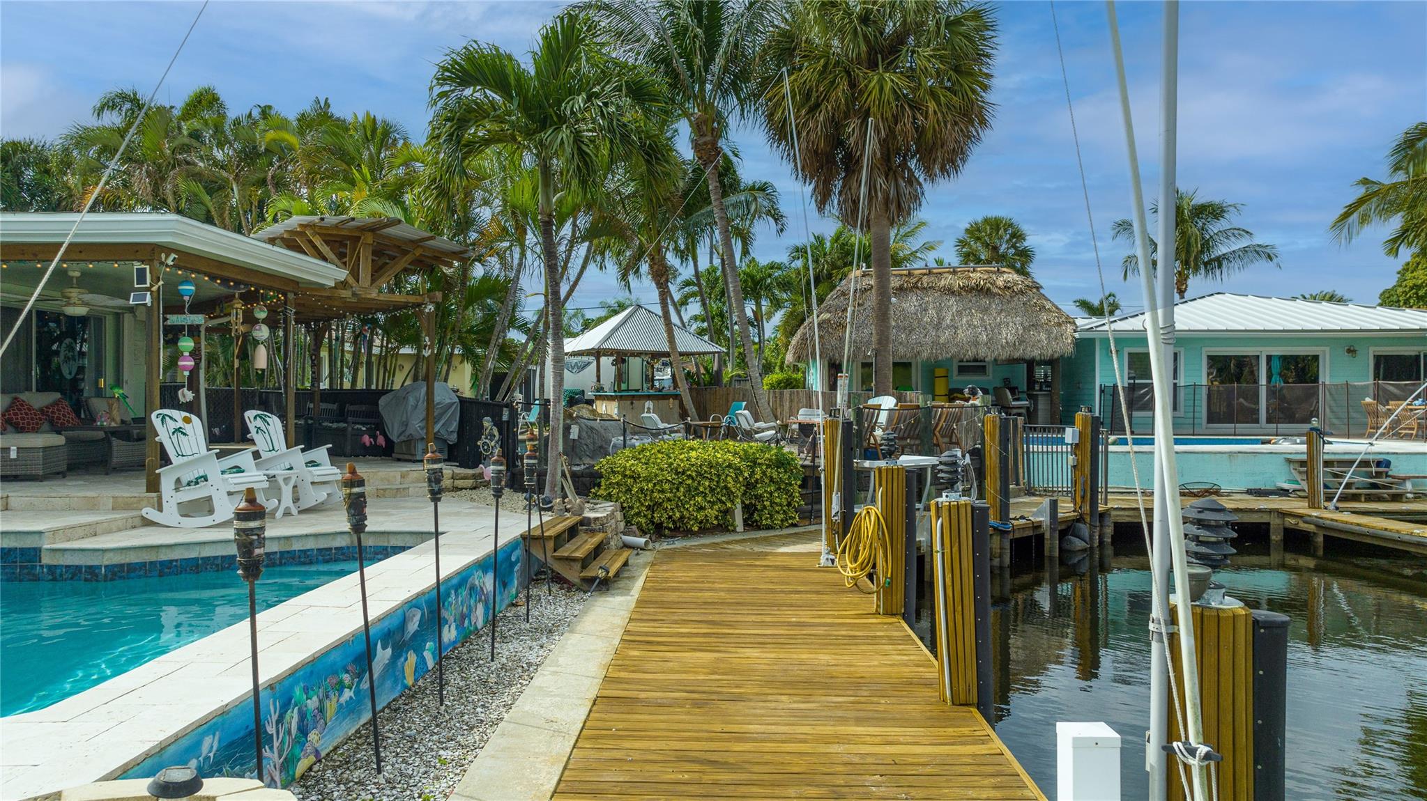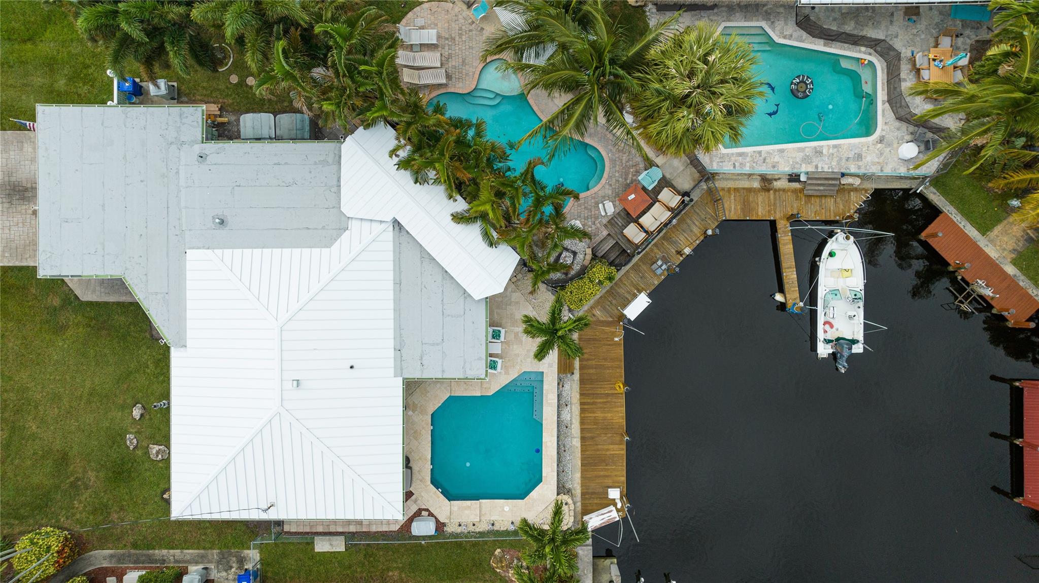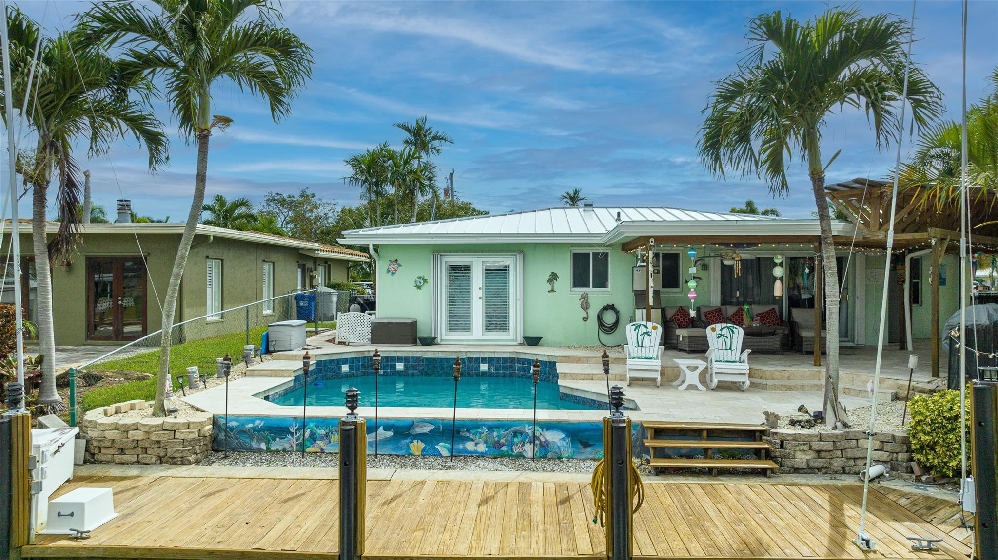 Ocean Access 3bed/2bath/pool on secluded cul de sac. Brand new metal roof, gutters, and 2 ton A/C. Hurricane Accordian Shutters/panels. Enclosed carport with garage door for golf carts, motorcycles, storage and house access. 35' Dock has pilings/bumpers, whips, lighting, electrical and dock box, fits approx 26'boat. 12' bridge clearance MHW. Updated Master bedroom with etched doors to patio, and bath with oversized shower. Updated custom kitchen solid oak cabinets, with SS appliances, double oven, dishwasher, 48" 6 burner gas cook top with exhaust hood and granite counters. Spacious laundry room with 2nd refrigerator. 2 spare bedrooms have carpet, balance tile flooring. Large sliding doors to travertine tile covered and fenced patio to pool with waterfall,AquaCal heater/chiller.