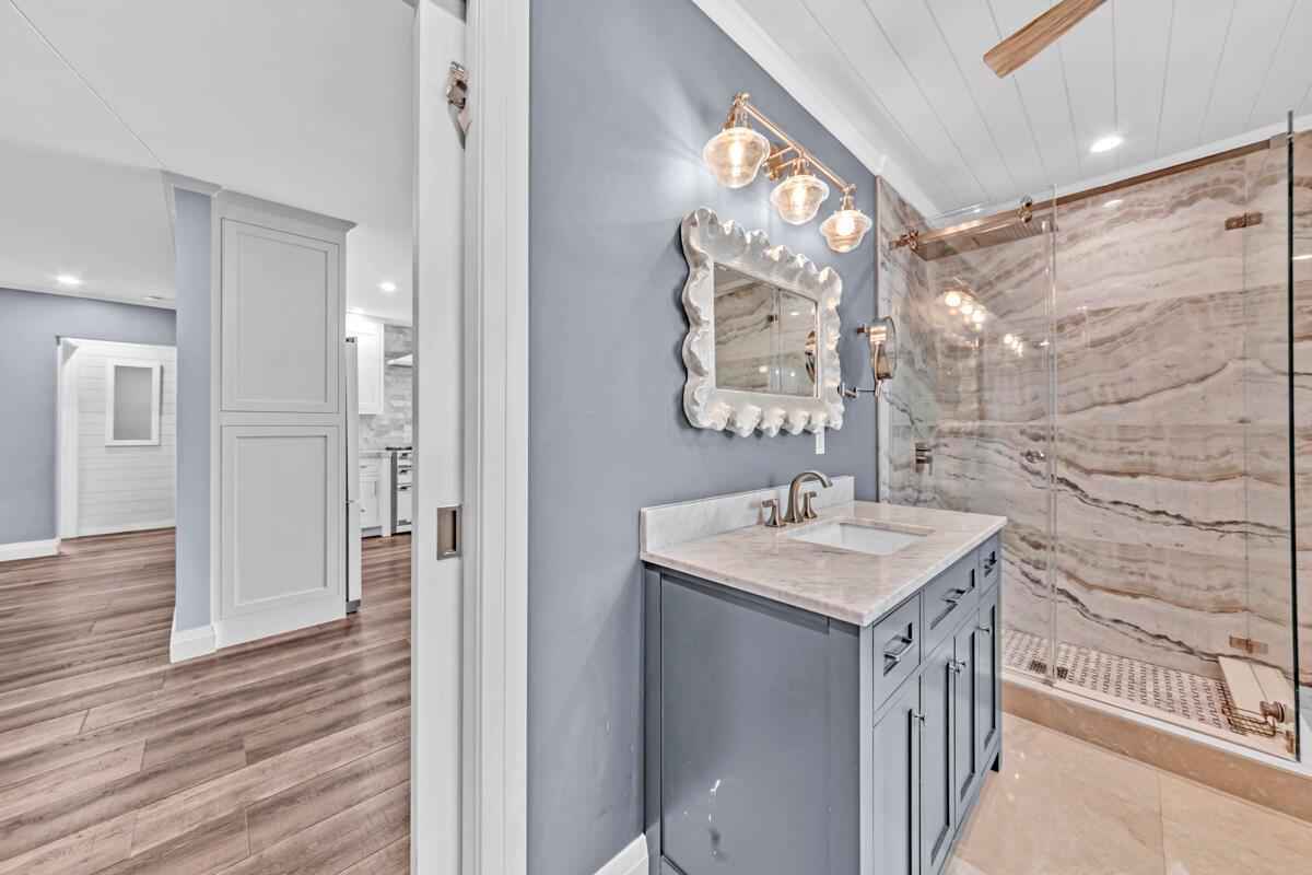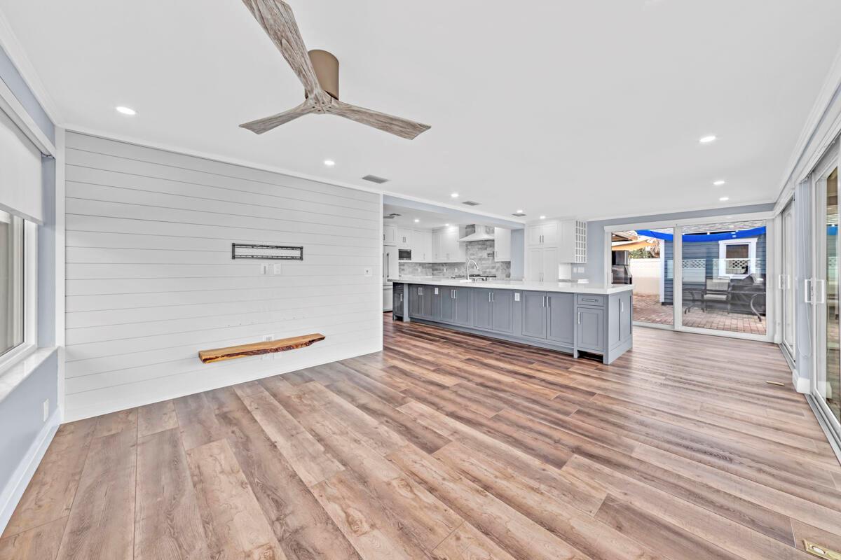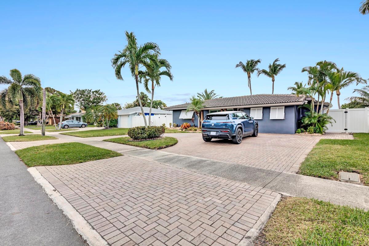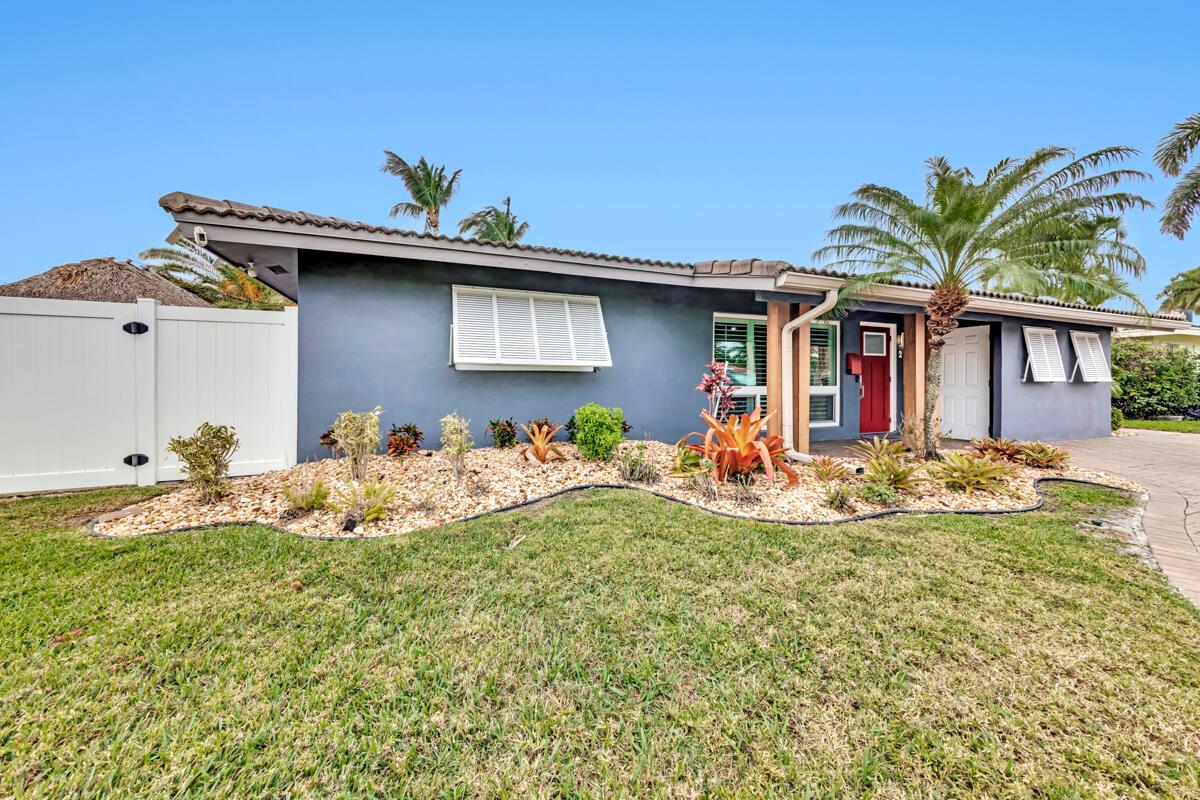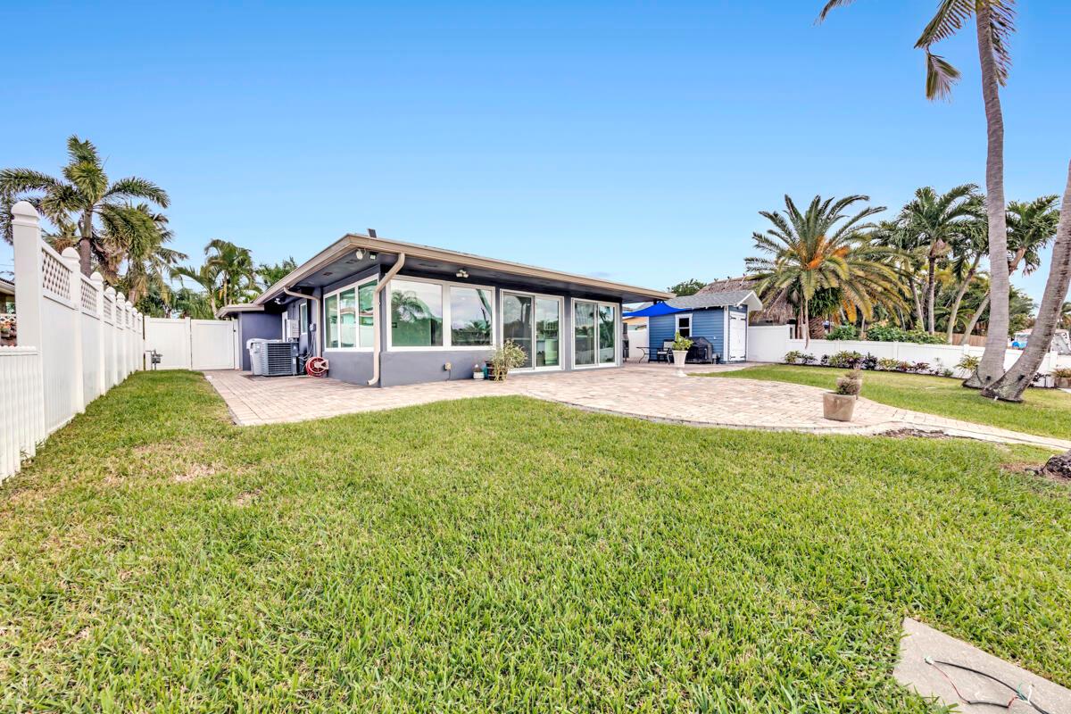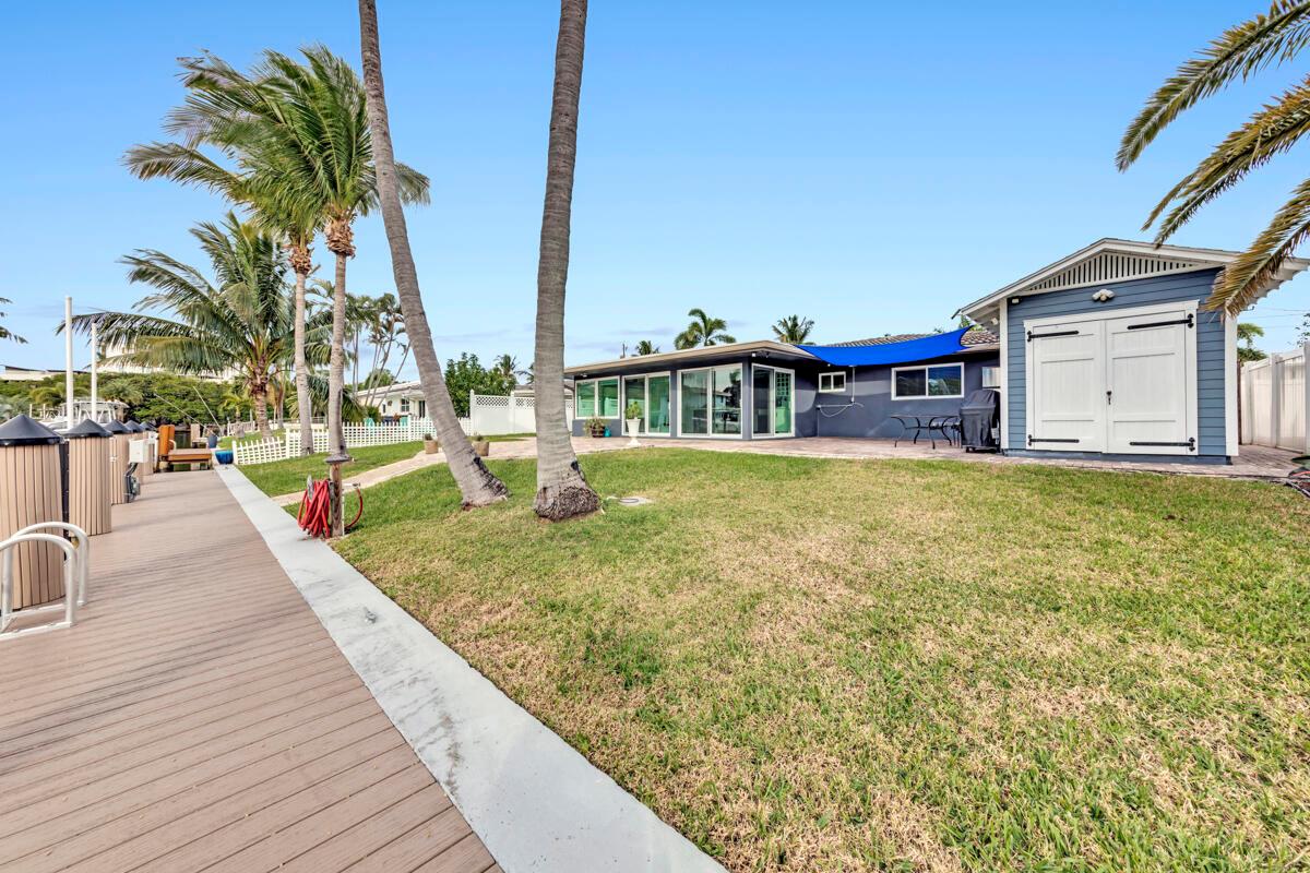 Waterfront Gem! 3 bedroom, 2 bath, waterfront Ranch just minutes to the Atlantic Ocean. Home boasts designer upgrades with Aga refrigerator and 5-burner gas stove w/ matching hood and pull-out pot filler, 2 Viking dishwashers, Kohler farmhouse porcelain sink, stone backsplash, white granite counter-top on island seats 8 people. Pull-out lower drawers, separate bar with pantry and glass-front cabinets. Impact windows throughout, custom blinds, plantation shutters and a 24 bottle wine holder. New 70' Weatherboard dock and upgraded seawall 2022/2023. New 16,500lb four post lift and Florida Historic Shed w/ electric. Plenty of storage w/ paver tiles on both sides of the home. bead board, ample high-hats, high-end ceiling fans, on-demand gas hot water heater.