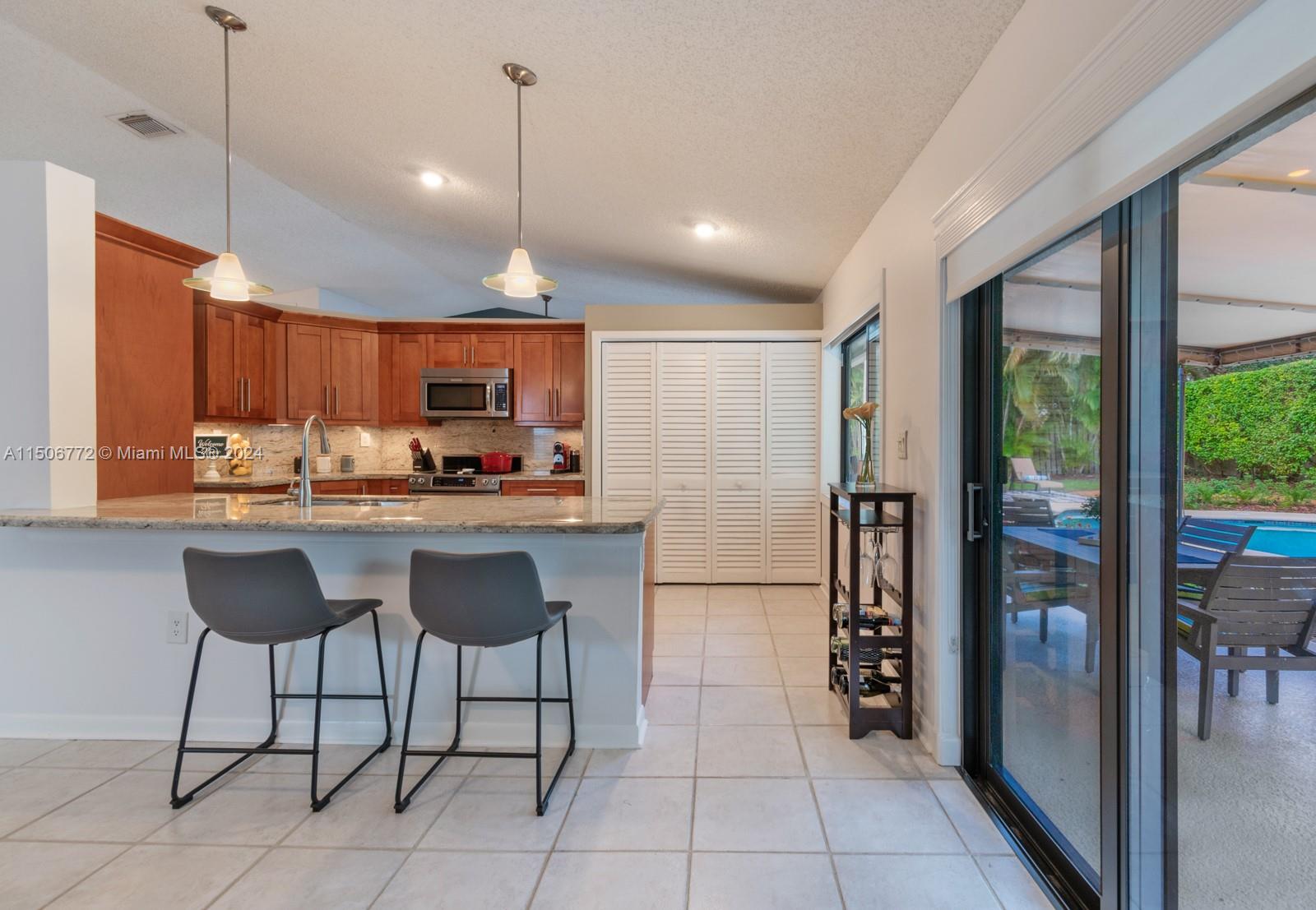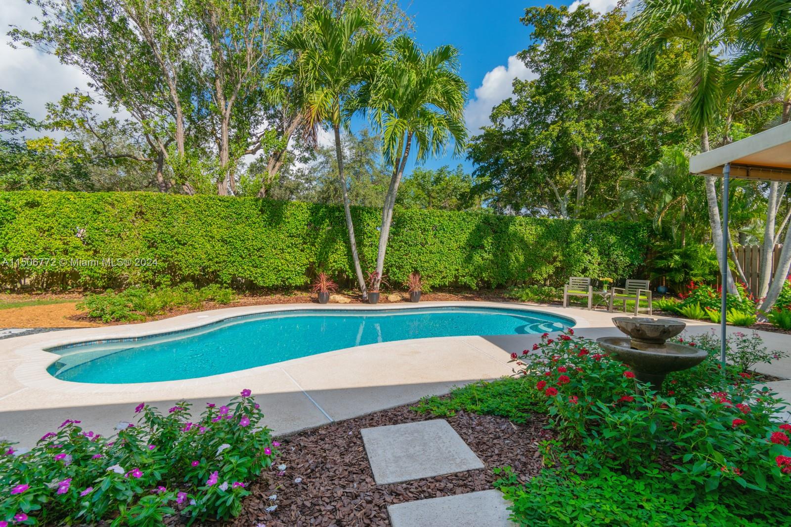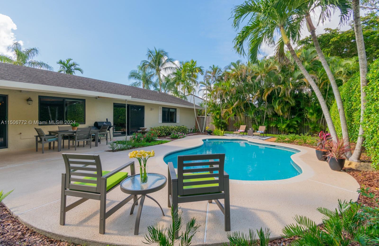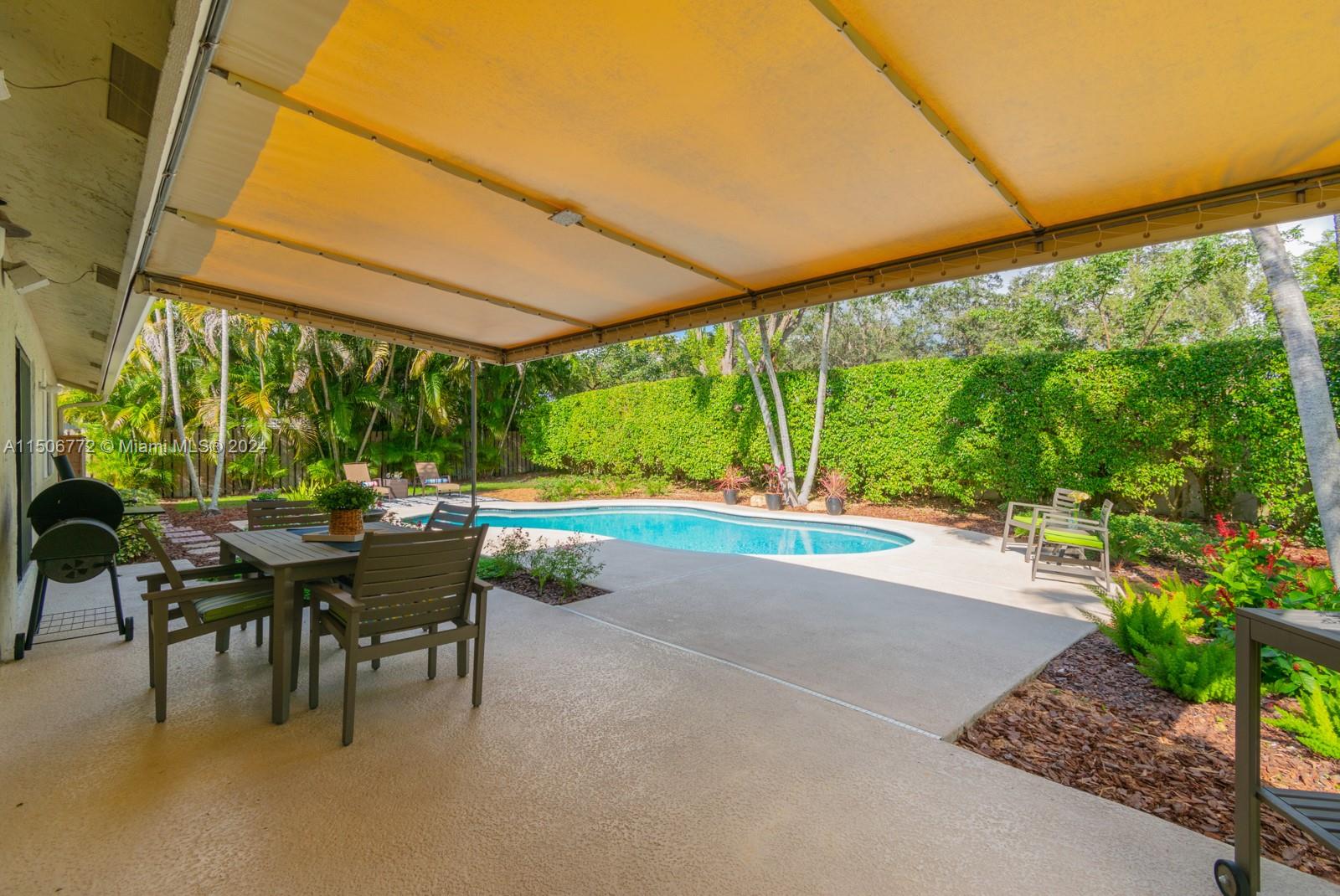 YOUR FUTURE HOME AWAITS! Spectacular 4b/2b split floorplan with LOW HOA! NEW impact windows, doors & garage. Free-form pool & deck, awning for shade, hedge along back, landscaped surroundings & fenced yard for private outdoor escape. French doors lead to primary suite with custom wood built-ins for DREAM closet. 2 separate vanity areas & step-down shower in main bath. Chef's kitchen features wood cabinets, stainless steel, granite counters & backsplash, generous pantry & recessed lights. Grand window & sliding doors for seamless interior & outdoor transition. Freshly painted accent walls & sloped ceilings enhance living atmosphere. Laminate flooring & new window treatments. Updated 2nd bath has tub/shower combo, glass sliding door, white vanity, granite top. AC 2019, Water H 2020, W/D 2021