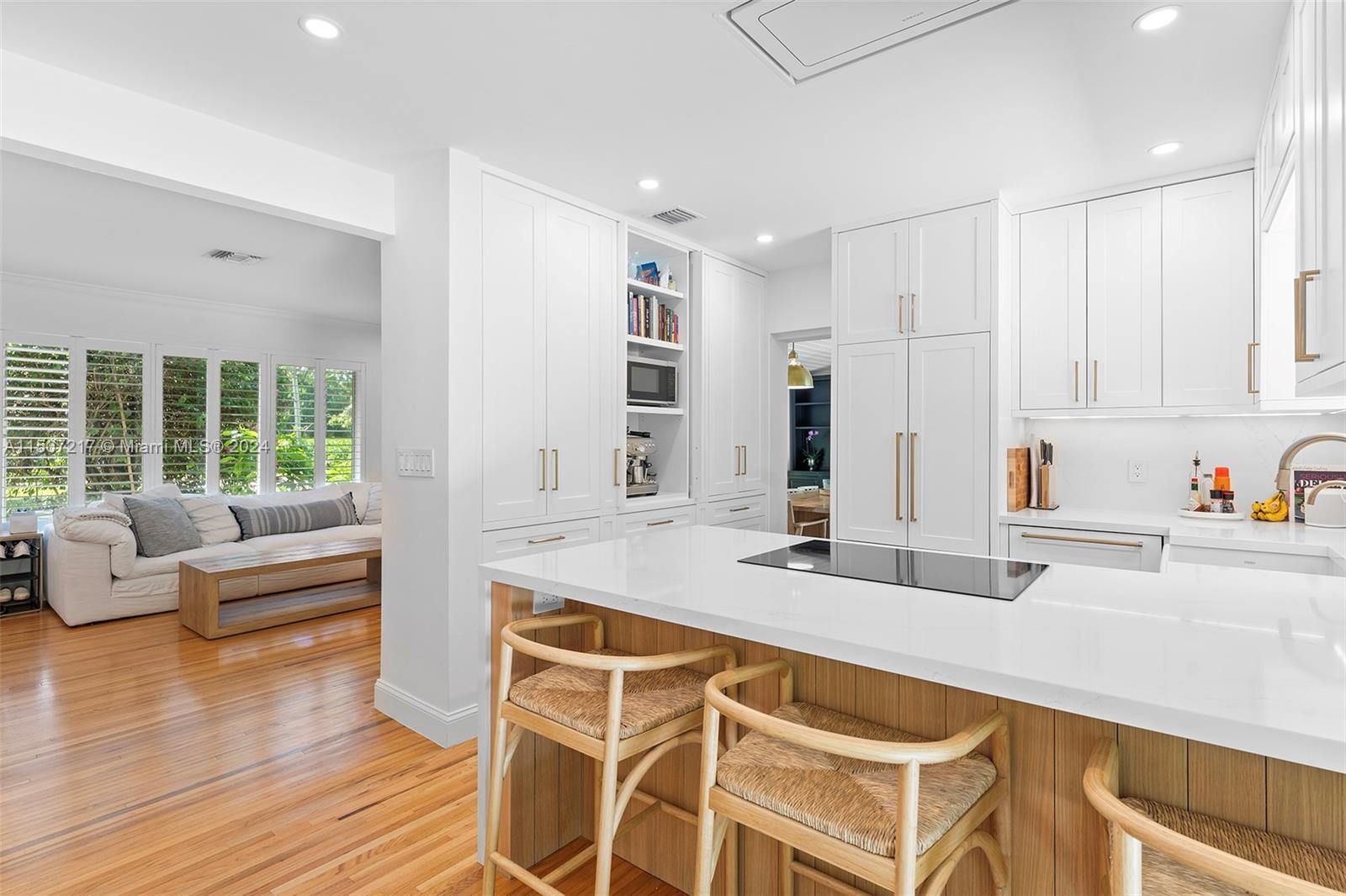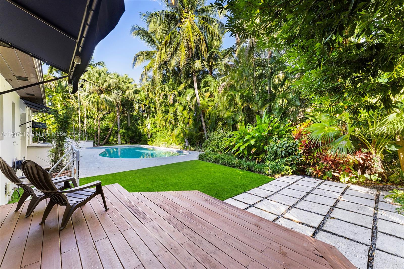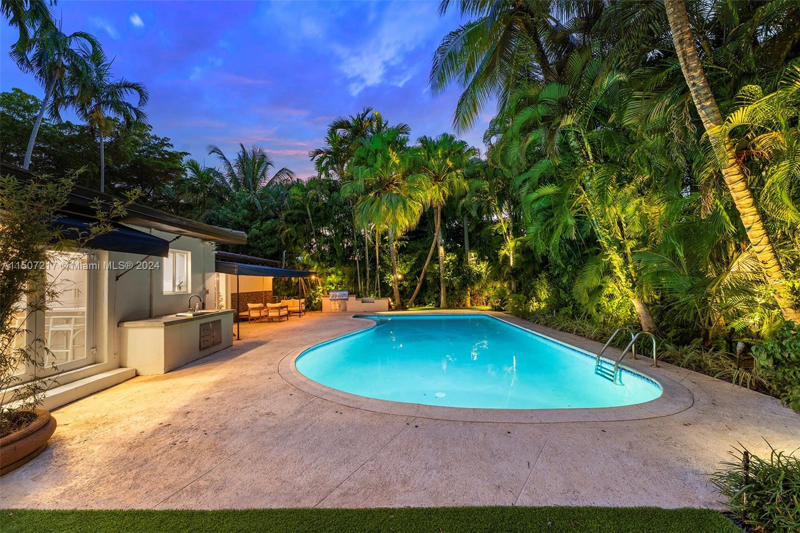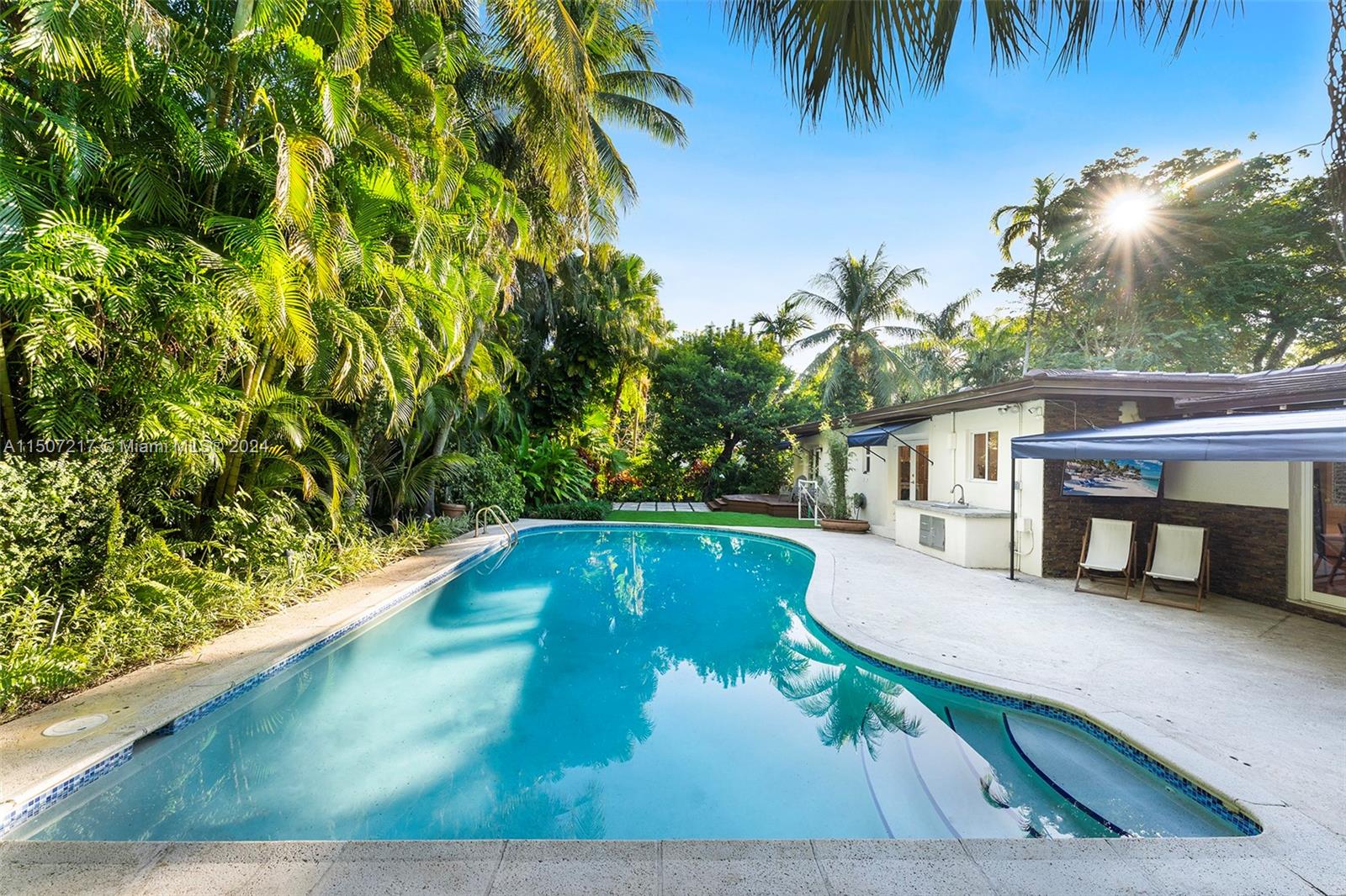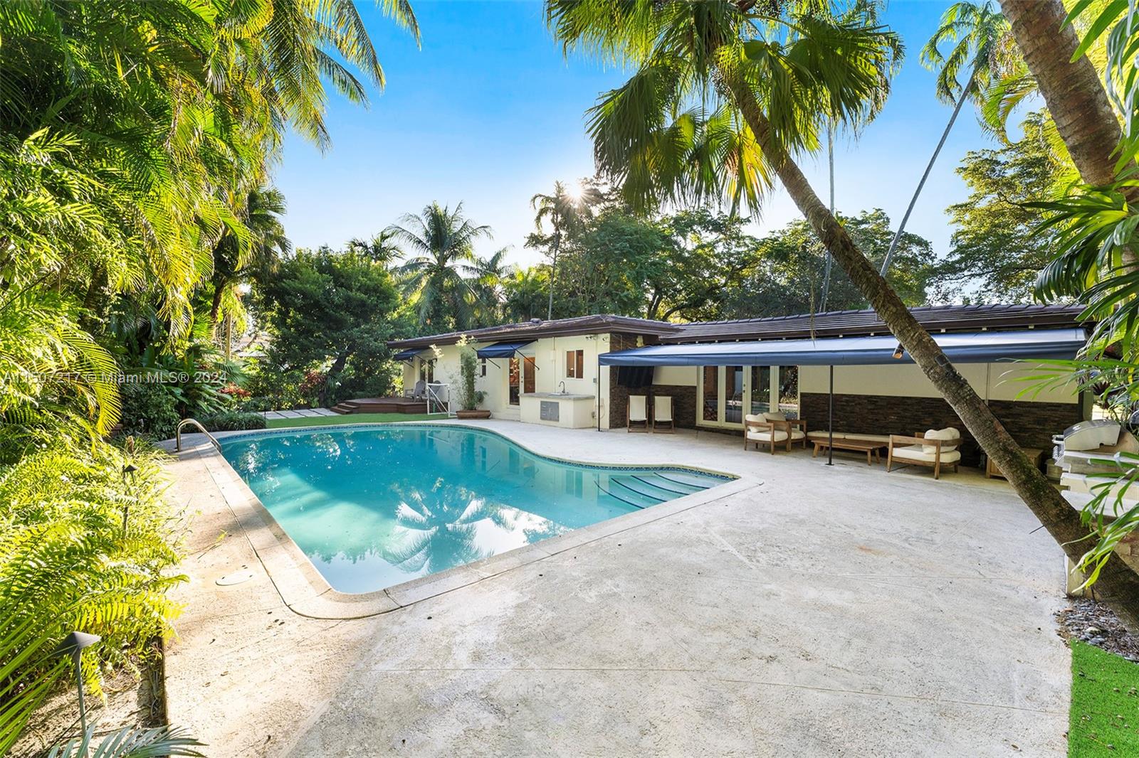 Brand new roof, awnings, gutters, and impact doors! Stunning residence in the heart of Coral Gables set just 1 block from the Gables Youth Center and Library. This timeless Gables residence is gracefully positioned on a generous 10,000 sqft lot with impact windows, new kitchen and brand-new roof, awnings, and gutters. Entering from tree-lined Aledo Ave, the light and bright living room with original hardwood floors leads to an expansive dining area, custom kitchen, large office/den, and captivating pool views from every angle. Lushly landscaped grounds extend a warm invitation to your own secluded pool sanctuary. Outdoor living spaces include covered terrace, outdoor kitchen, and deck off the primary suite offering ample opportunities to entertain and unwind poolside.