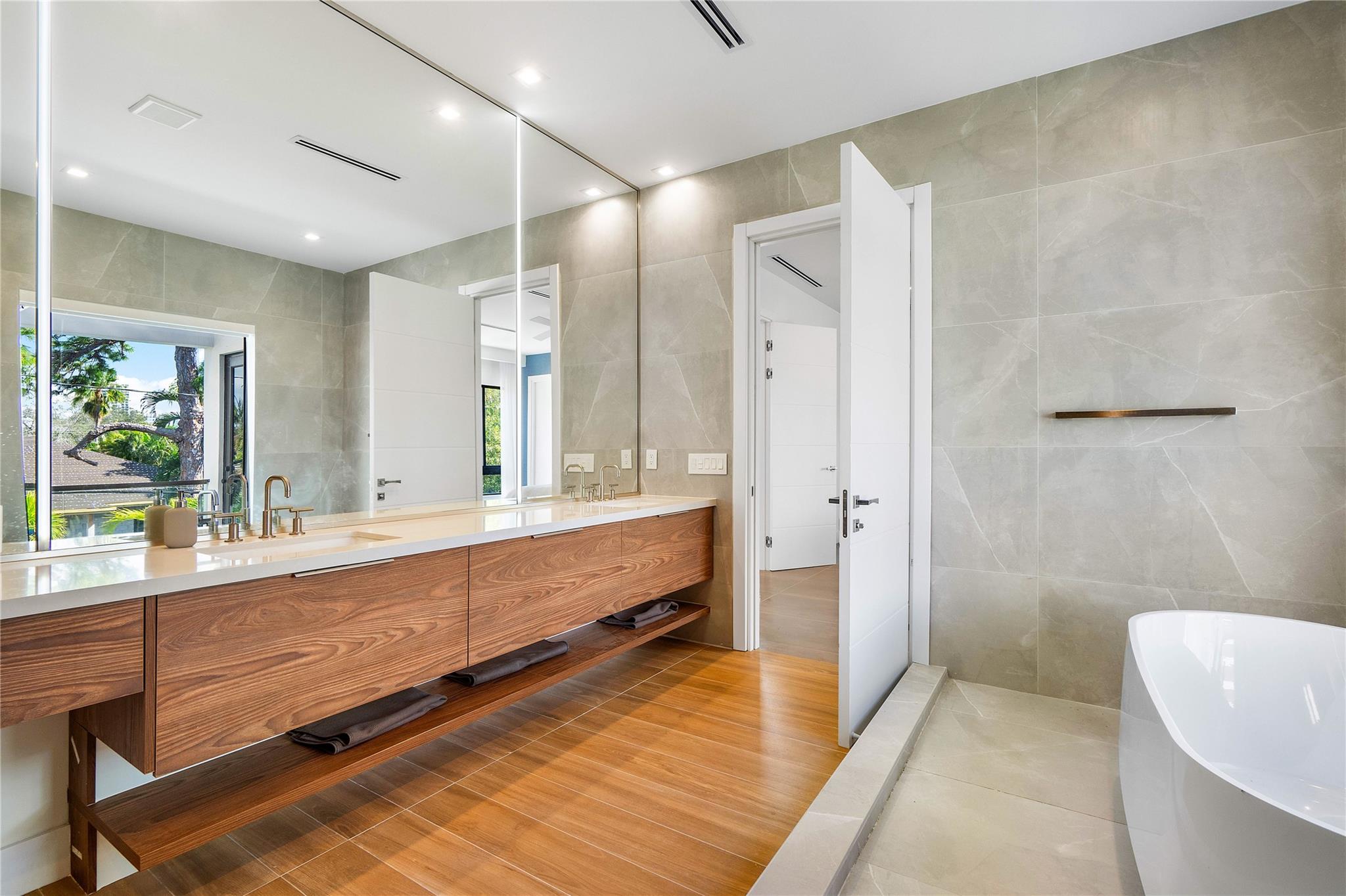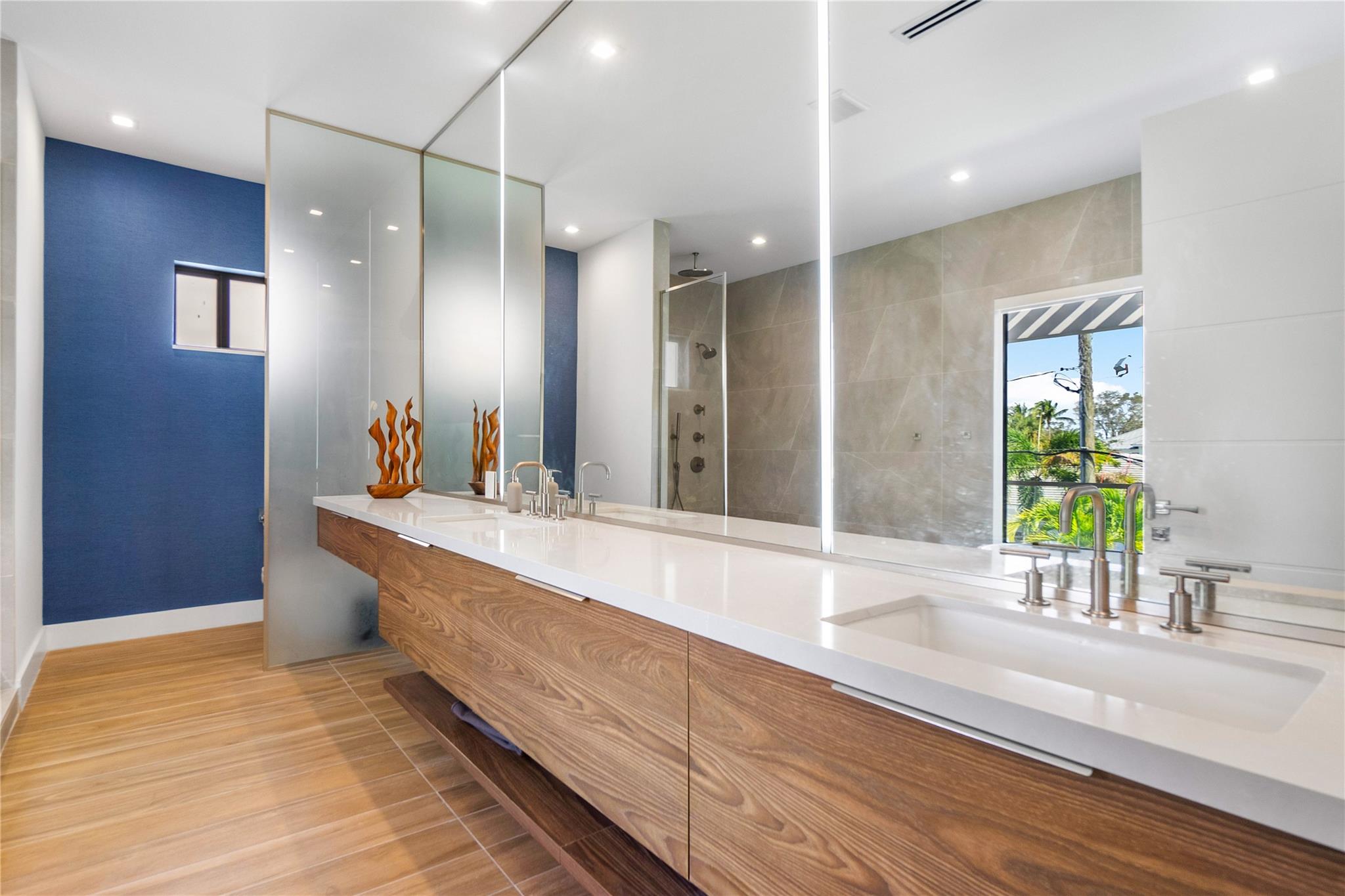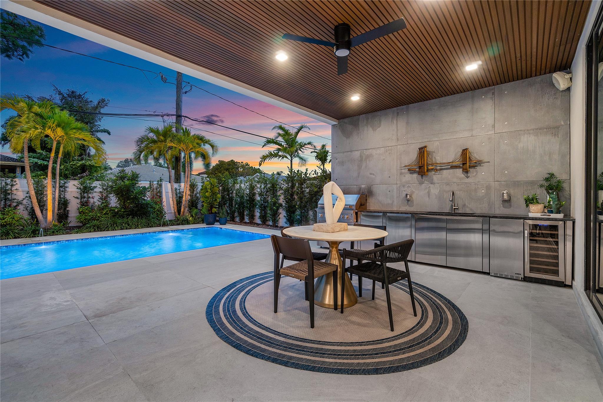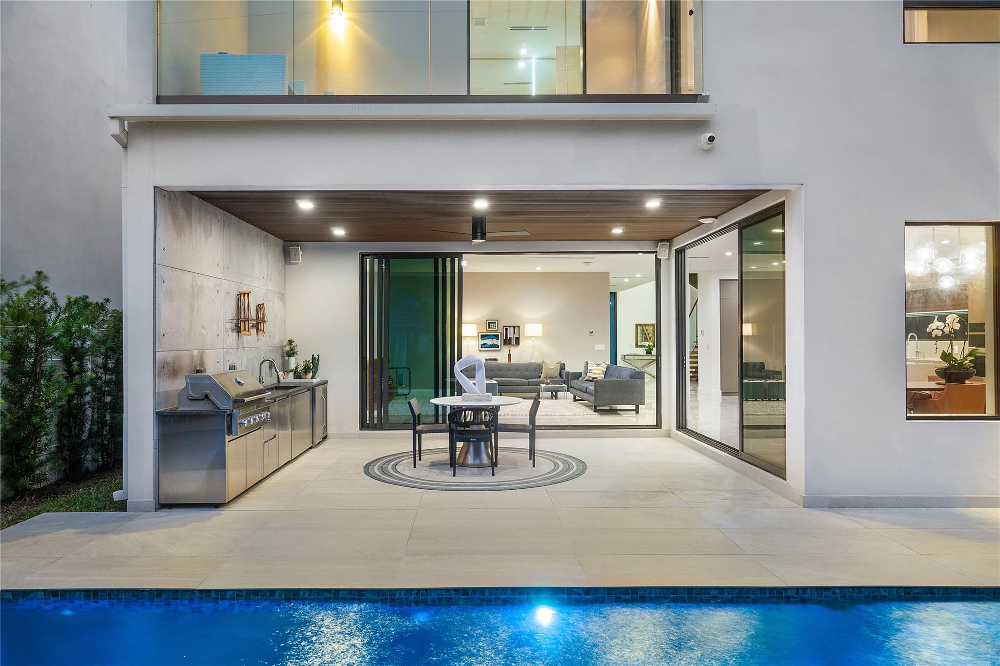 Victoria Park Perfection! This 2-story home redefines upscale living in Victoria Park. Spanning 3,756 sq ft under air, 4 large bedrooms and 4 1/2 bathrooms. The open-concept first floor features a chef's kitchen, a living and dining area that opens to a private yard with a heated saltwater pool, summer kitchen, and covered patio. The lower level includes one bedroom with a cabana bath, a half-bath, and a 2-car garage. Primary bedroom has balcony overlooking pool, double custom walk-ins and bathroom with double-sink floating vanity, soaking tub, and dual-head shower. Second floor has bonus room ideal for a den, office, or media room, along with a laundry room. High ceilings and impact windows offer natural sunlight, complemented by a dramatic floating staircase. Attached features sheet.