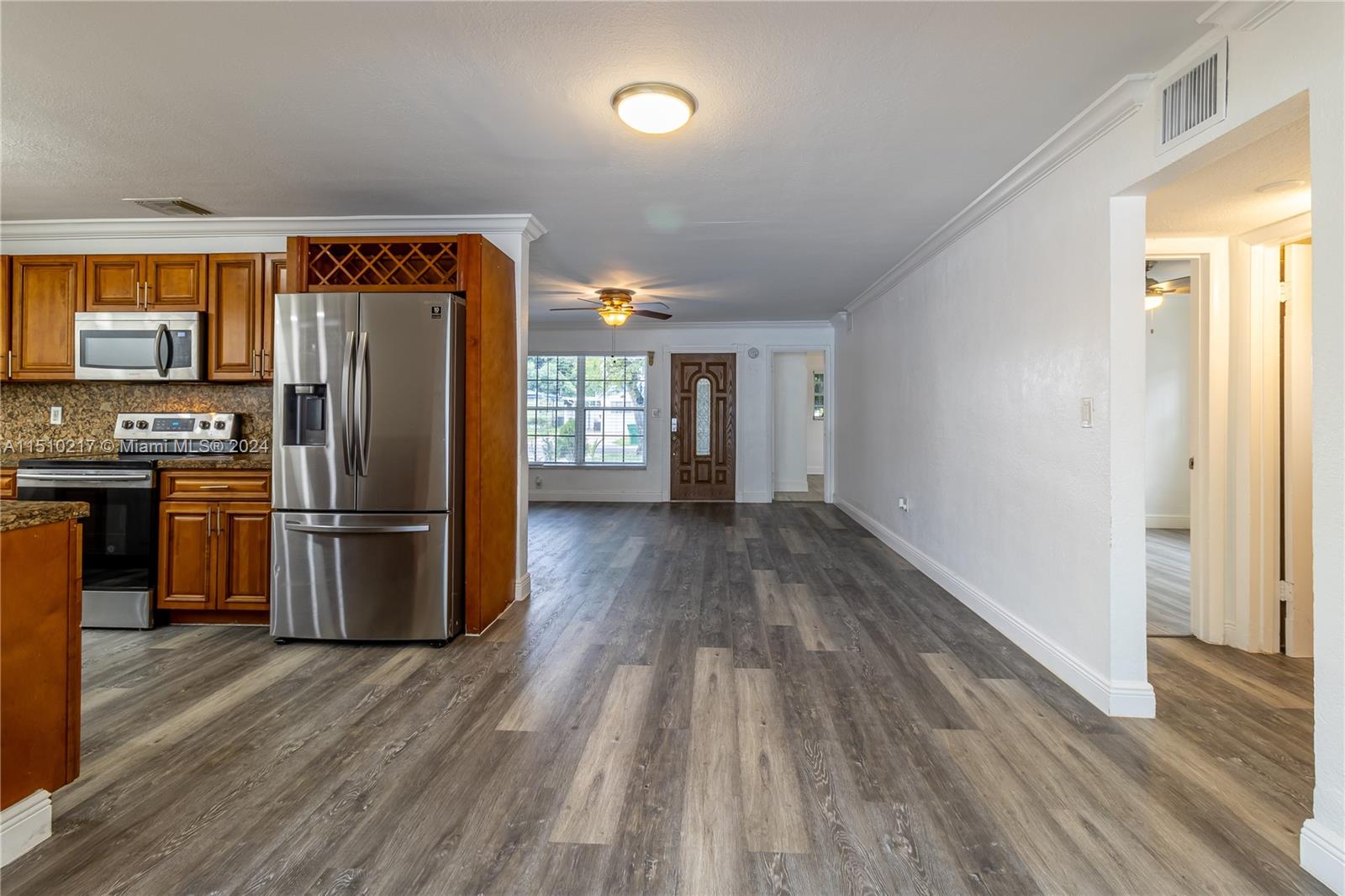 Honey, stop the car!! Remodeled single-family 4-bedroom, 3-bath pool house with gazebo in historic Miramar. The garage was converted. NO HOA!!! Updated kitchen with stainless steel appliances, remodeled bathrooms, and wood flooring throughout. The gazebo, enclosed patio, and pool are perfect for outdoor dining, relaxing, and entertaining. Other features include a long driveway for multiple cars, RVs, and boats—a bonus mango tree for all my mango lovers.