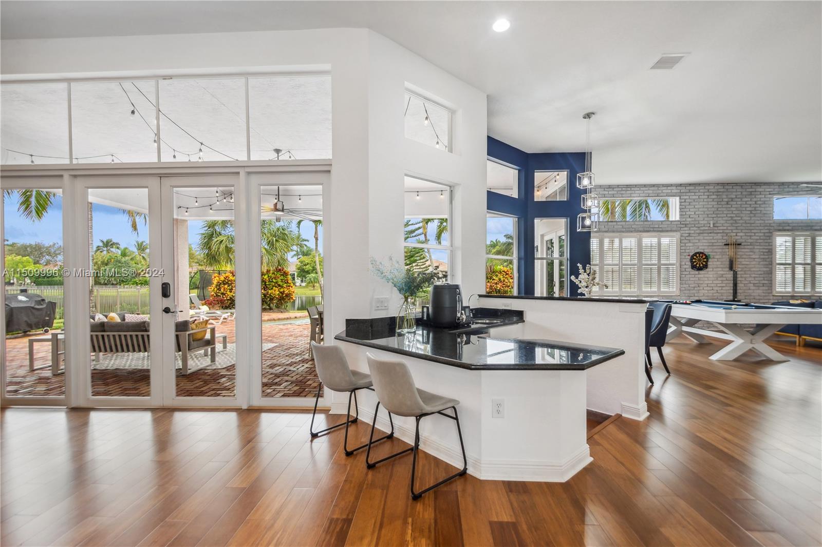 Spectacular 1-Story Home on a Builder’s Acre w/Circular Driveway & BRAND NEW ROOF in the Manned Exclusive Guard Gated Community of Riverstone, Davie. 5 Bed/5 Bath +Den/Offc, 12' ceilings w/Open-Concept design that connects Living, Dining, Family, Wet Bar, Breakfast & Gourmet Kitchen w/Large Pantry & Plenty of Cabinet Space, Granite Counter Tops & SS Appl w/air vent & double oven. New Engineer Wood Floors in Social Area & Ceramic in Bedrooms, Chicago Brick Wall, Plantation shutters, French Doors! Step outside to Covered Patio surround w/Lush Landscape, Fence & Pool offering plenty of room for both Entertaining & Everyday living w/Peaceful Lake Views. Basketball & Tennis Courts,Playgrounds,Pavilion. Great School District, Minutes from The Airport, Major Highways, Hospitals, Parks & Beaches!