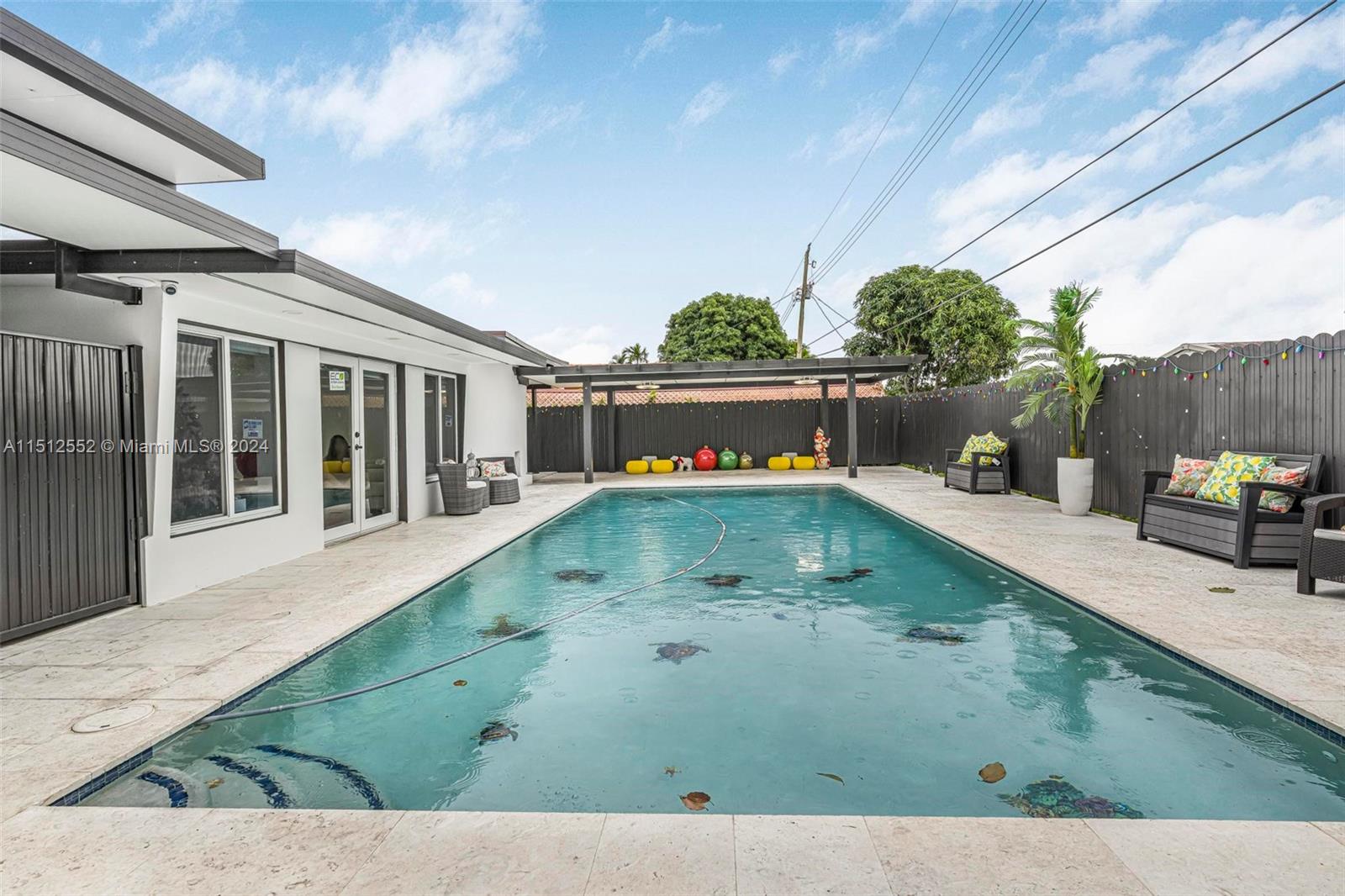 Recently renovated single family home with 3 bedrooms and 2 interior full bathrooms. Back patio has a big pool along with covered built-in-BBQ and exterior bathroom with shower. Patio also includes covered terrace on the left side and right side of the house. Side of the house also has an efficiency with private entrance and another full bathroom. Home has a new aluminum roof along with storm proof windows all throughout the home. The family room has built in speakers perfect for entertaining. Entire house also has recessed lighting with optional multi-colors which can be individually controlled via bluetooth. Make sure to schedule your showing today!