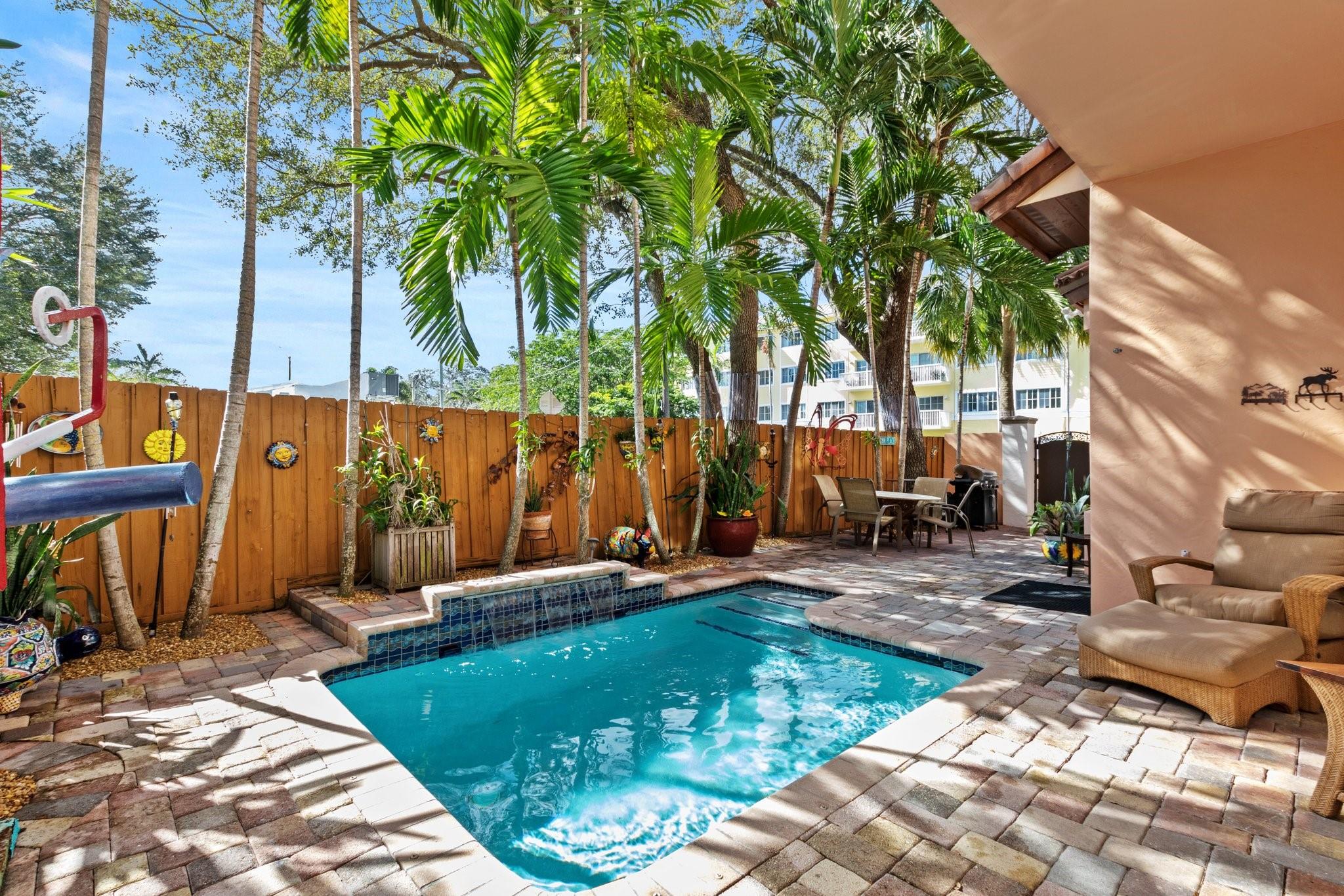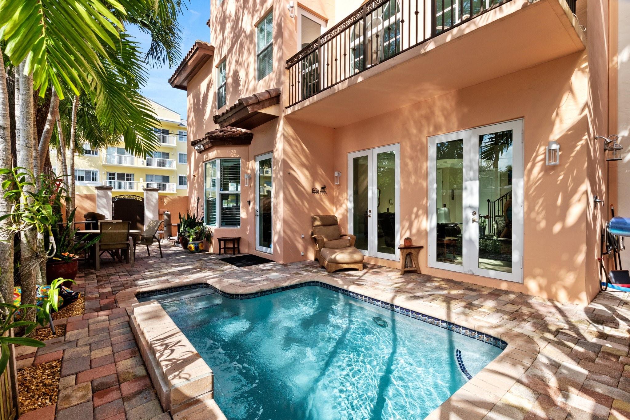 Price Improvement! This magnificent 3 bedroom, 3.5 bathroom townhome in Victoria Park features private outdoor living areas w/ heated pool, 2nd floor balcony, & 3rd floor sundeck. 1st floor features an elegant kitchen w/ stainless appliances & large family room w/ wood fireplace. Take elevator or stairs to the second floor which has 2 bedrooms w/ en suites plus an open area loft & laundry room. Continue to the 3rd floor to the primary bedroom suite. This large bedroom has a fireplace that is two sided, shared w/ the primary bathroom which boasts a separate shower & spa tub with jets & double vanity. The third floor also has a mini kitchen which leads out to the 3rd floor sundeck. Impact windows/doors, 2 car garage w/ parking for 5+ cars. Includes 5 TVs. Only 2 townhomes & NO HOA/fees!