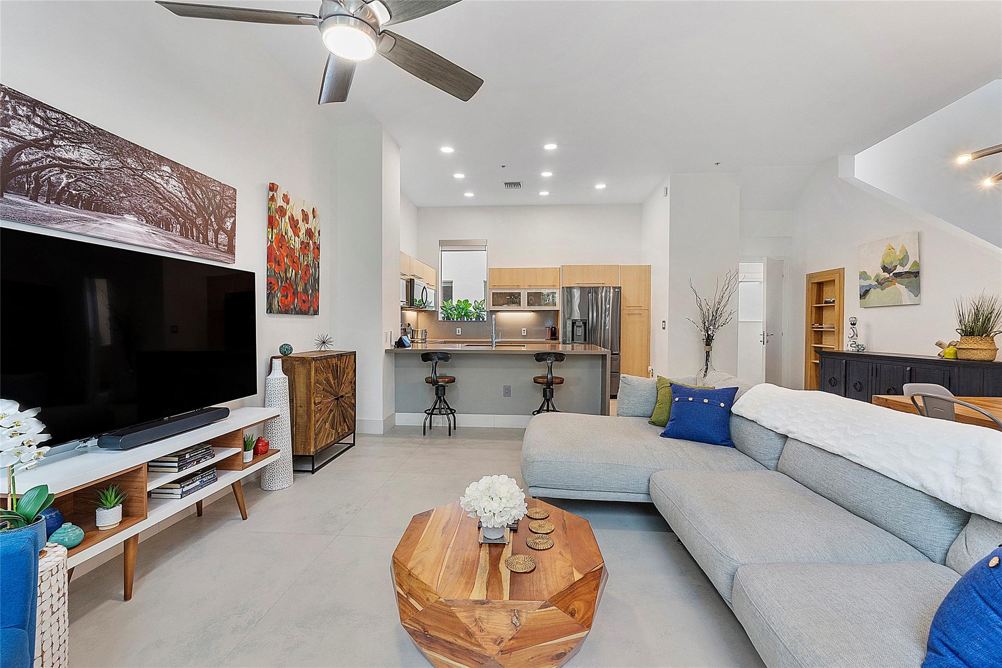 Welcome to Bamboo Flats Townhomes in the Heart of Flagler Village. This rarely available pool unit features an oversized rooftop terrace with amazing views of downtown, ready for a hot tub or outdoor kitchen. On the ground floor you will find space for an office or a guest bedroom & a full bathroom. Open concept kitchen with a quartz waterfall countertop is perfect for entertaining, walk out to your balcony & enjoy your morning coffee with a nice courtyard/pool view. Custom 1x1 meter Italian porcelain floors in the main living area & espresso wood floors throughout the rest of the home. A very open & lofty feel with an abundance of natural light. 9, 10 & 11-foot ceilings, custom shades, & built-in closets throughout. 2 car garage with plenty of storage space for your cars & your tools.