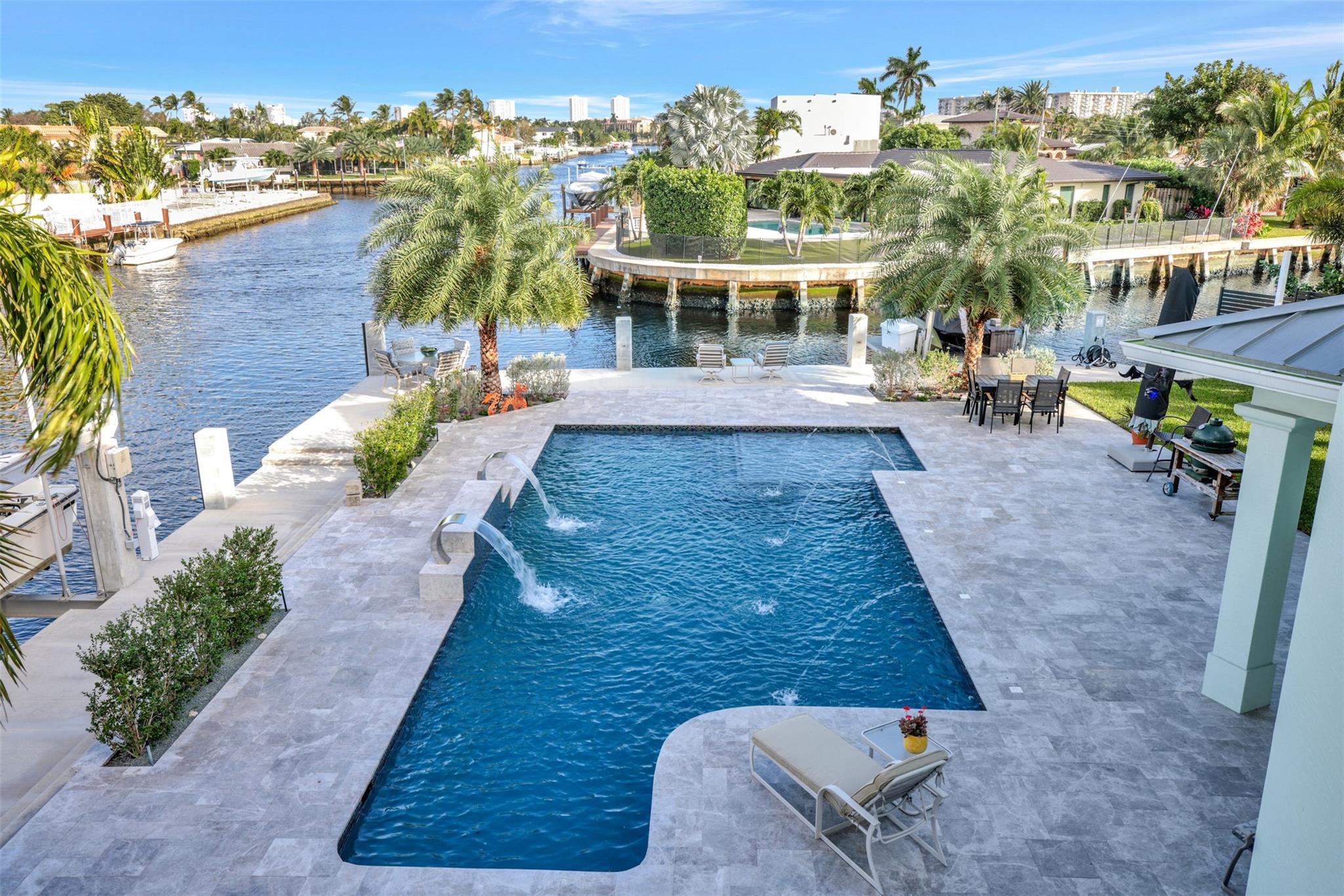 Welcome to the home of your dreams-ALL you need for family-oriented resort-style in/outdoor living in beautiful Pompano Beach,SoFlo–2-story custom built Key West/Old Florida style home-185’ of WF on wide canal,new seawall cap & batter pilings+100’of concrete dock, 16,000 lb. boat lift plus jet ski/kayak platform lift. Newly renovated pool/patio area with 2 sheer descent waterfalls & 4 deck jets,Jacuzzi. East exposure for year-round enjoyment.4 beds,4-½ baths+office+media room.2ND floor master suite enjoys a balcony overlooking pool/patio area with expansive water views;master bath his/her vanities,jetted tub,steam shower & private toilet+bidet room,large master closet. Kids/guests will fight over the bedroom large balcony overlooking pool/canal. 4-car garages with space for all cars+toys.