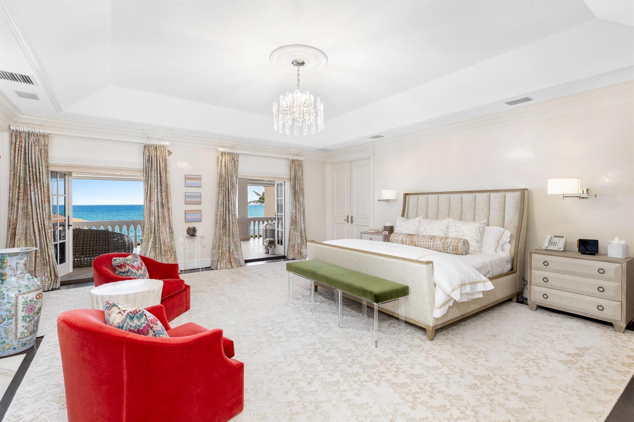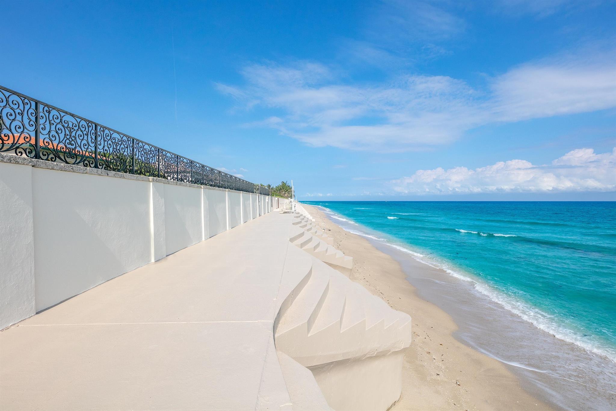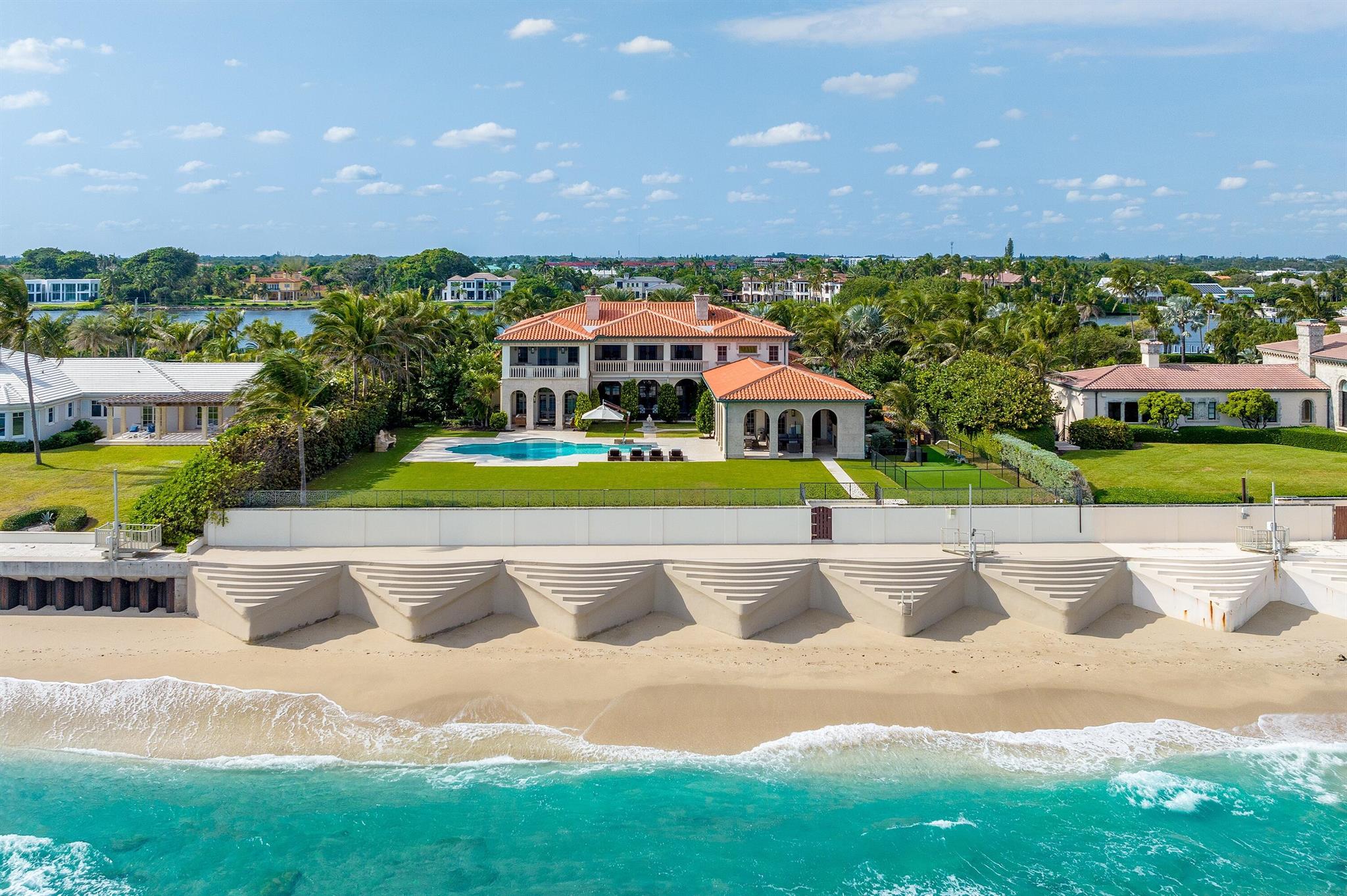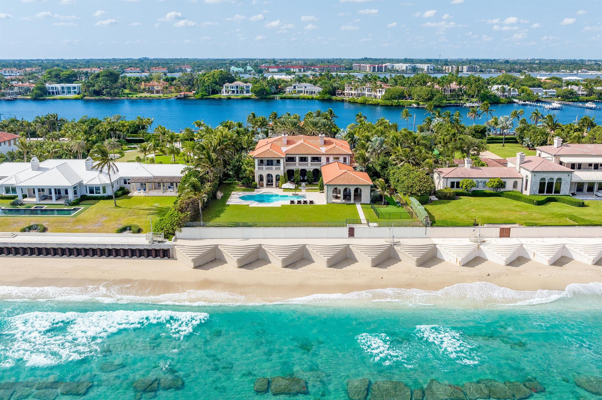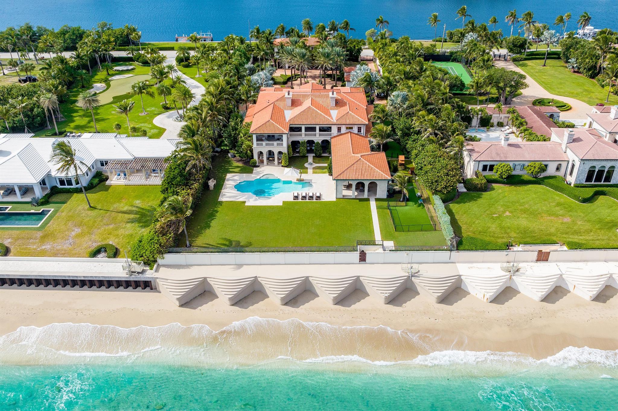 Spectacular Ocean-to-Lake Light and Bright Modern Mediterranean Compound with 9BR/11.3BA and 150 feet +/- of Ocean and Intracoastal frontage. This one-of-a-kind estate features rich details, intricate millwork, and sophisticated finishes. From spectacular reception to oversized living spaces and gorgeous formal dining room, this home is perfect for entertaining. Stunning wrought iron entryway opens to welcoming foyer with sweeping, detailed ceilings, beautiful imperial staircase, and crystal chandelier. Pristine estate with great natural sunlight throughout. Eat-in kitchen with island, china and silverware closet, and butler's pantry. Fabulous theater room connects to pub room with full bar. Paneled library with detailed fireplace. Expansive second floor primary wing with fireplace,