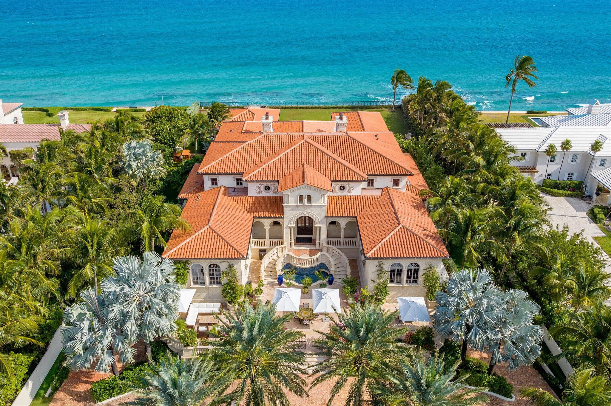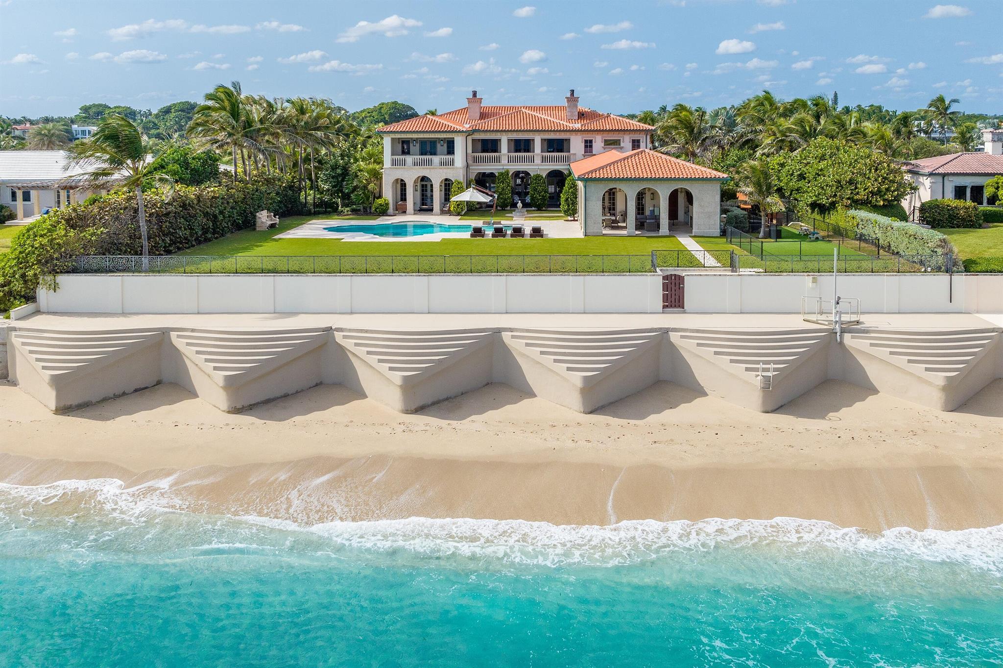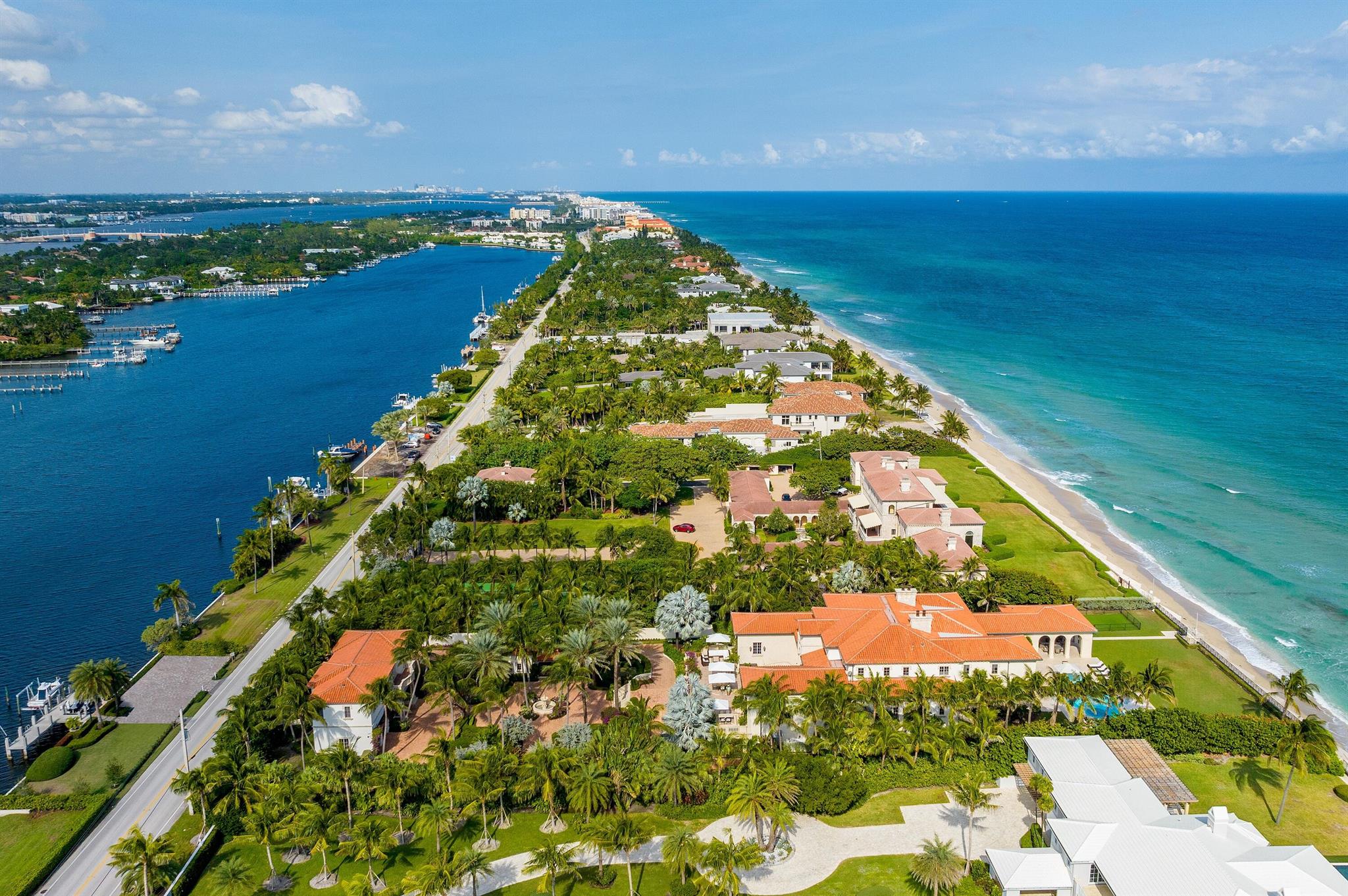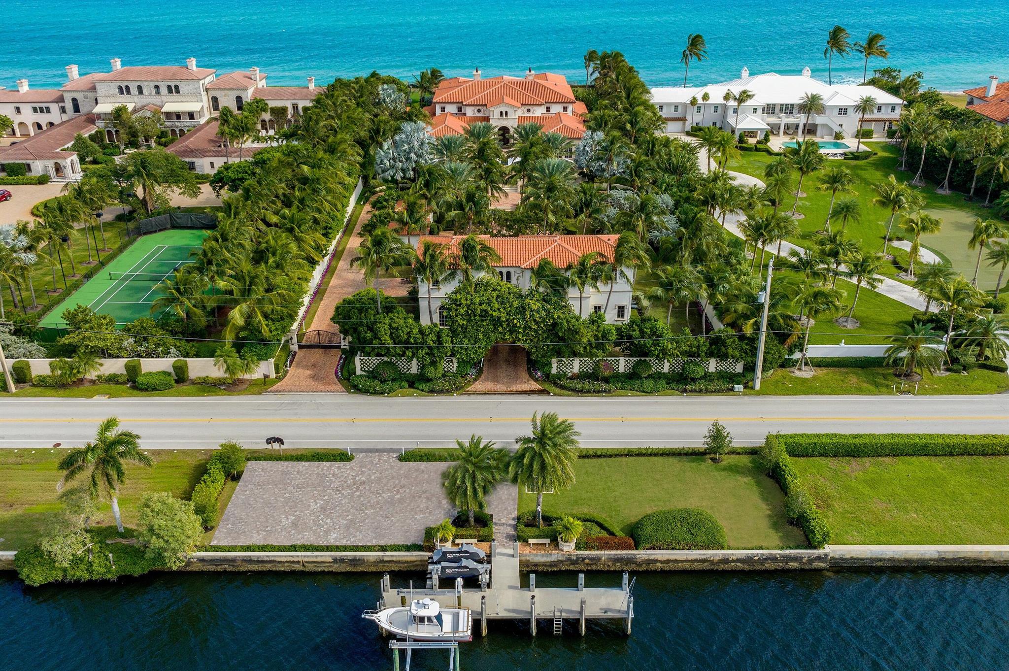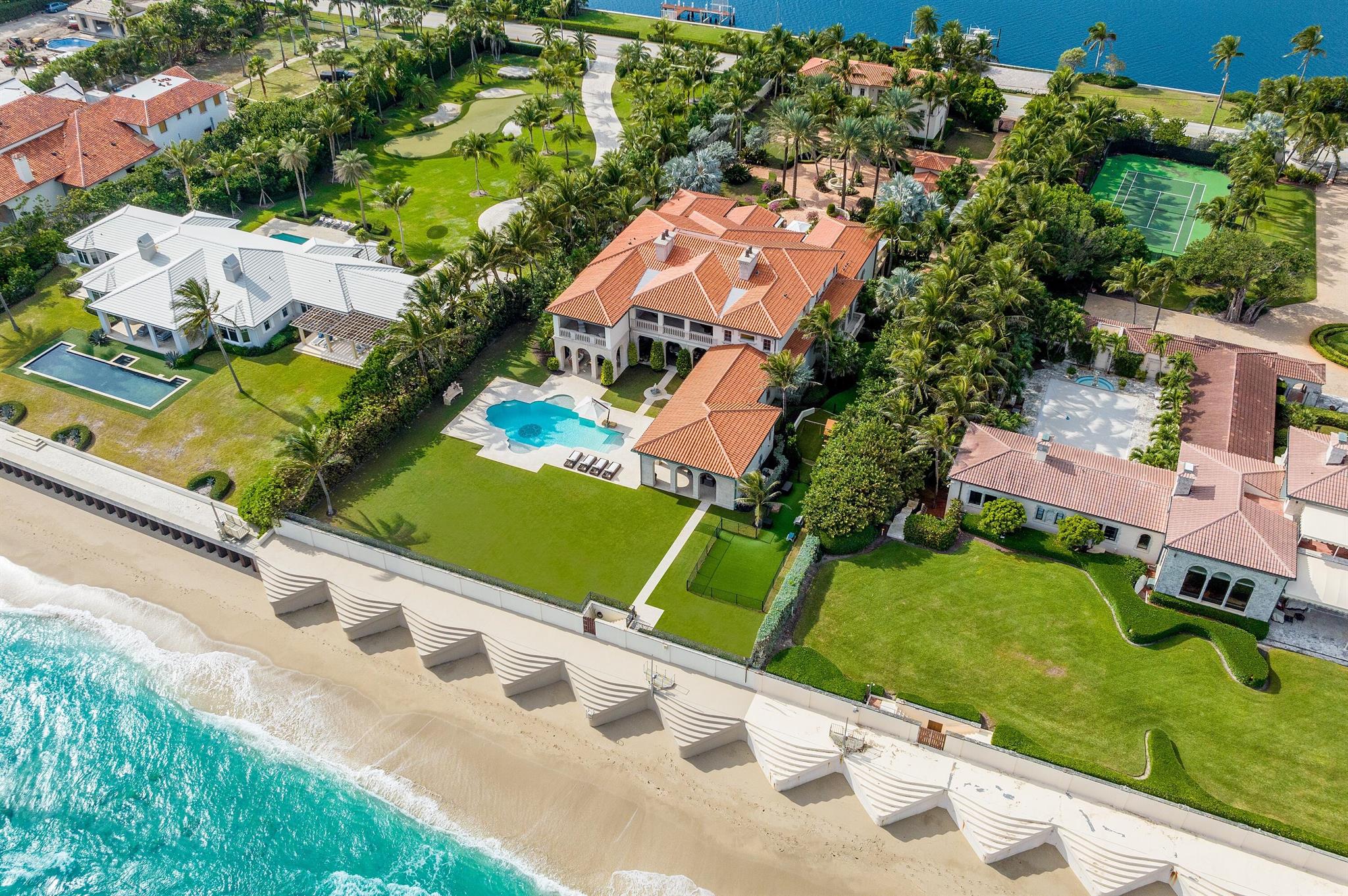 Spectacular Ocean-to-Lake Light and Bright Modern Mediterranean Compound with 9BR/11.3BA and 150 feet +/- of Ocean and Intracoastal frontage. This one-of-a-kind estate features rich details, intricate millwork, and sophisticated finishes. From spectacular reception to oversized living spaces and gorgeous formal dining room, this home is perfect for entertaining. Stunning wrought iron entryway opens to welcoming foyer with sweeping, detailed ceilings, beautiful imperial staircase, and crystal chandelier. Pristine estate with great natural sunlight throughout. Eat-in kitchen with island, china and silverware closet, and butler's pantry. Fabulous theater room connects to pub room with full bar. Paneled library with detailed fireplace. Expansive second floor primary wing with fireplace,