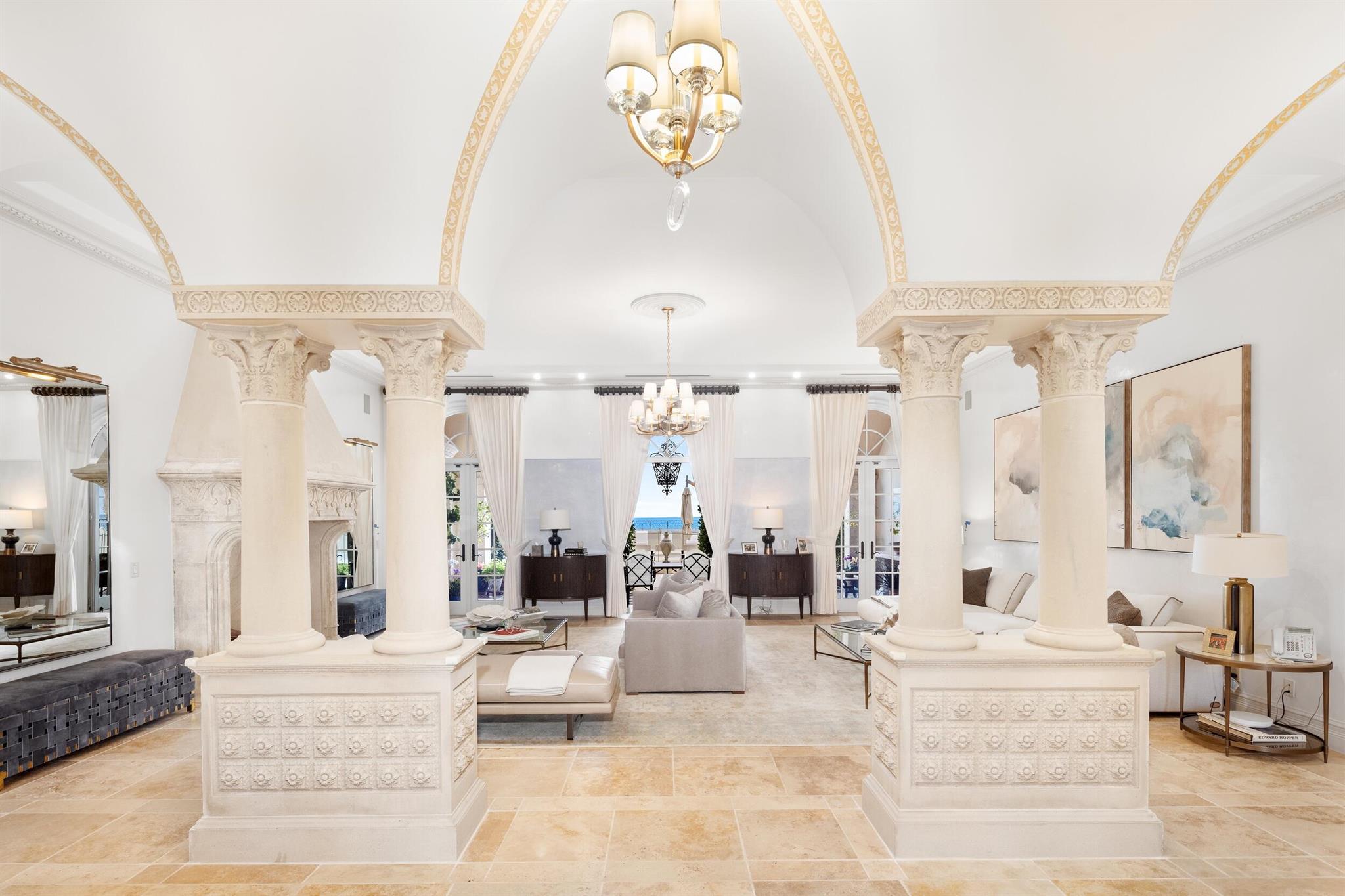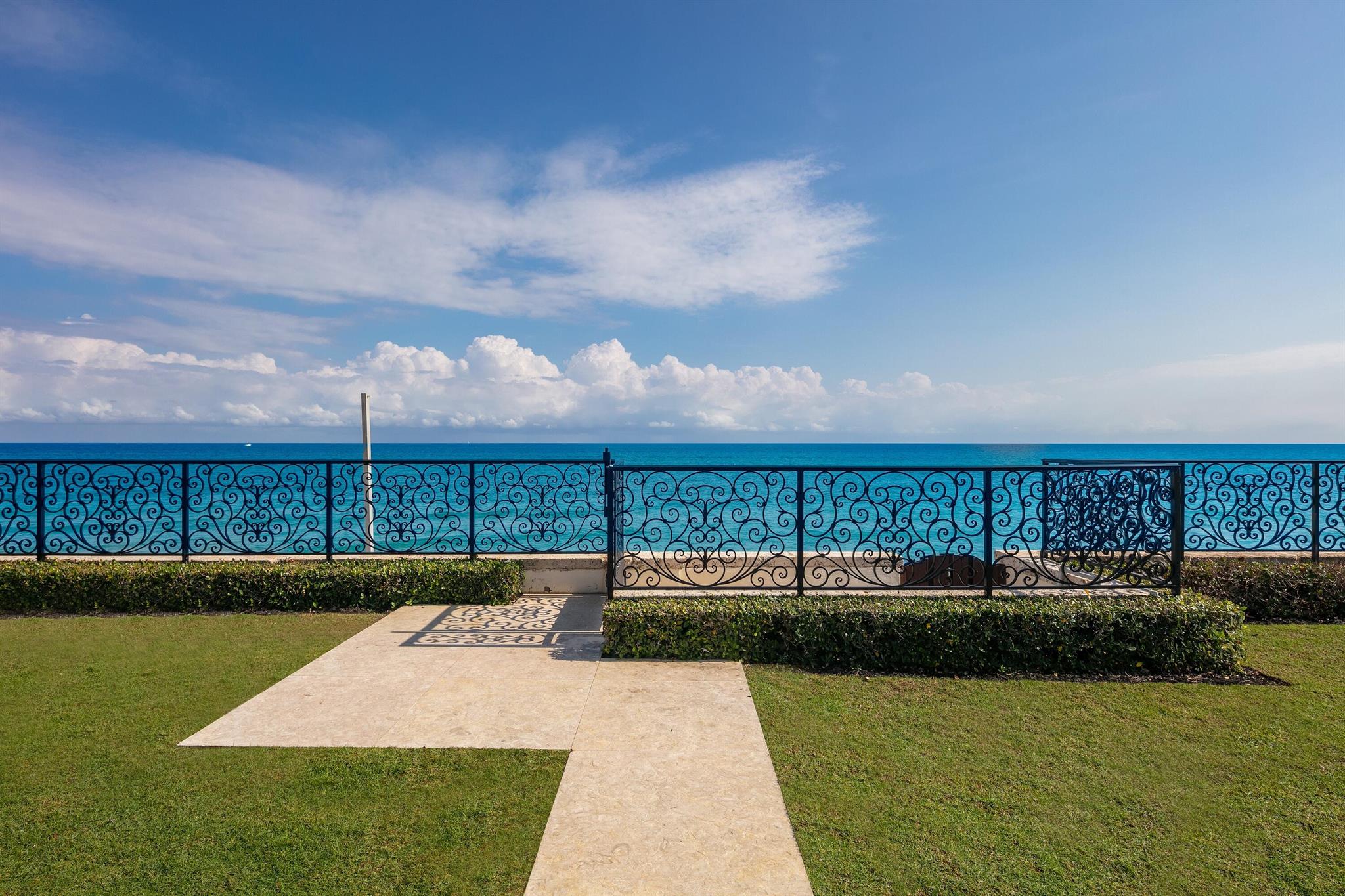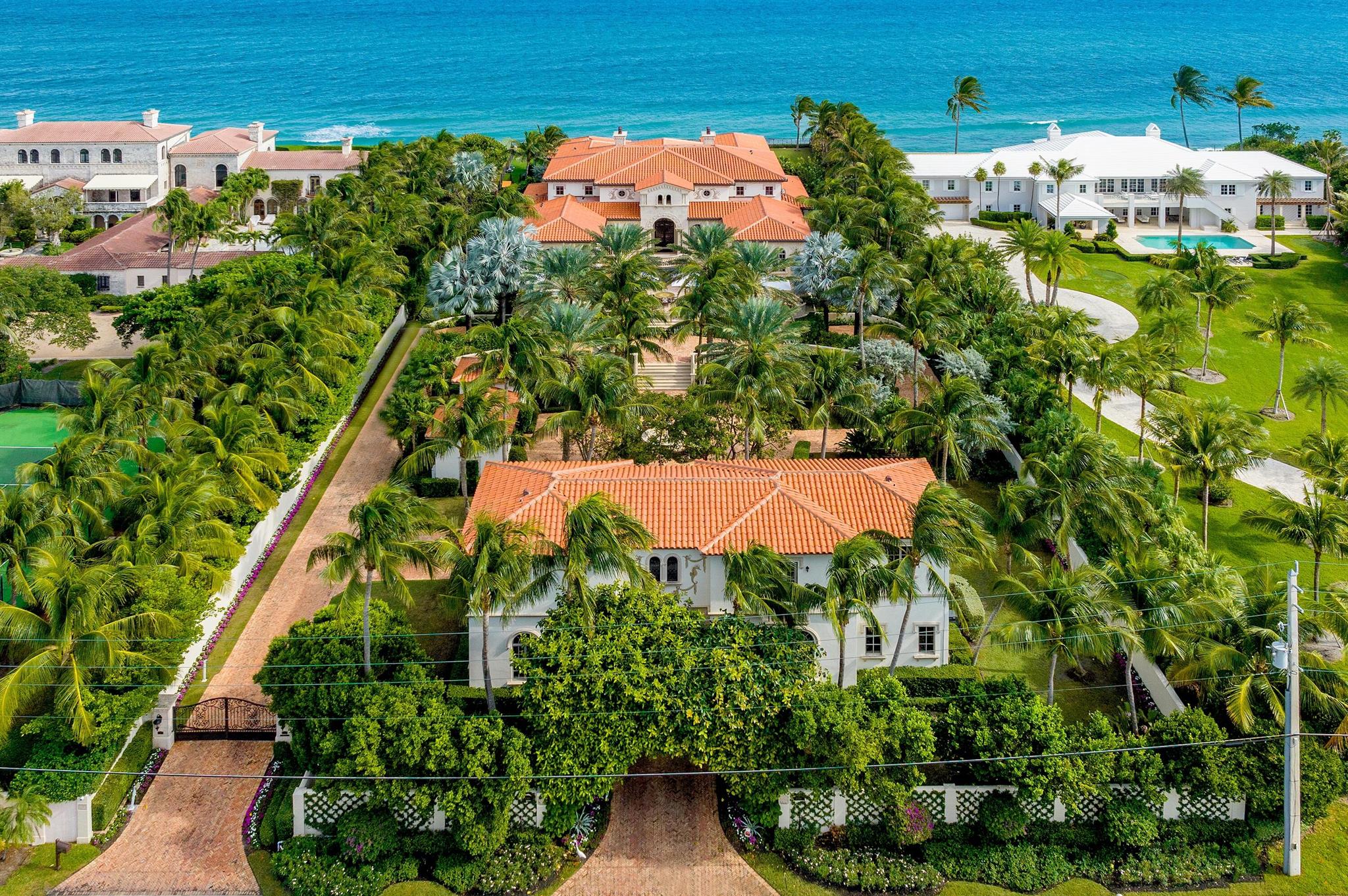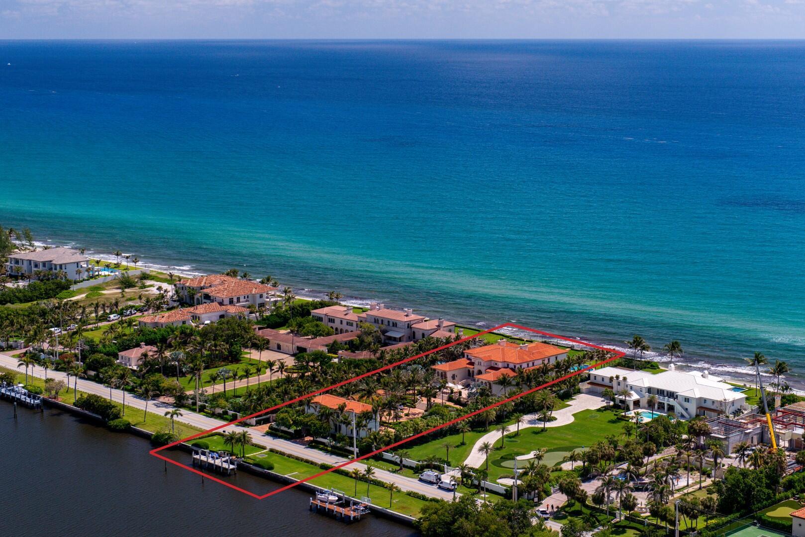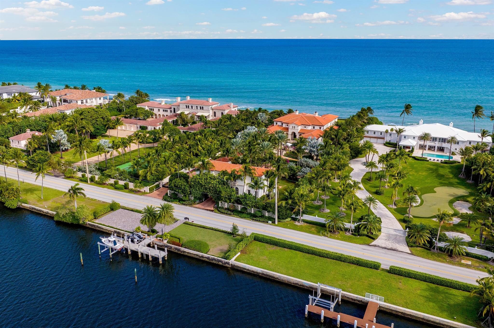 Spectacular Ocean-to-Lake Light and Bright Modern Mediterranean Compound with 9BR/11.3BA and 150 feet +/- of Ocean and Intracoastal frontage. This one-of-a-kind estate features rich details, intricate millwork, and sophisticated finishes. From spectacular reception to oversized living spaces and gorgeous formal dining room, this home is perfect for entertaining. Stunning wrought iron entryway opens to welcoming foyer with sweeping, detailed ceilings, beautiful imperial staircase, and crystal chandelier. Pristine estate with great natural sunlight throughout. Eat-in kitchen with island, china and silverware closet, and butler's pantry. Fabulous theater room connects to pub room with full bar. Paneled library with detailed fireplace. Expansive second floor primary wing with fireplace,