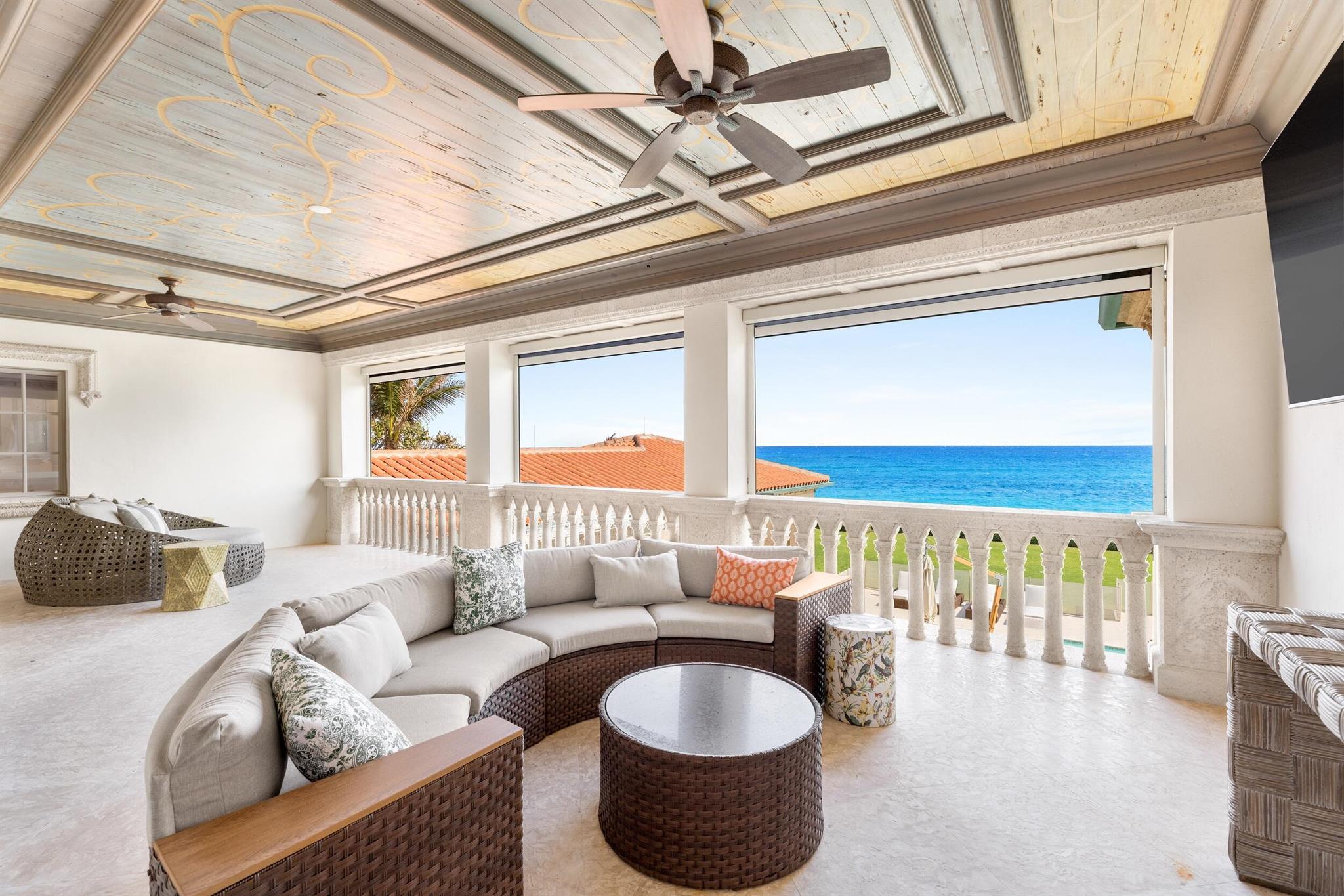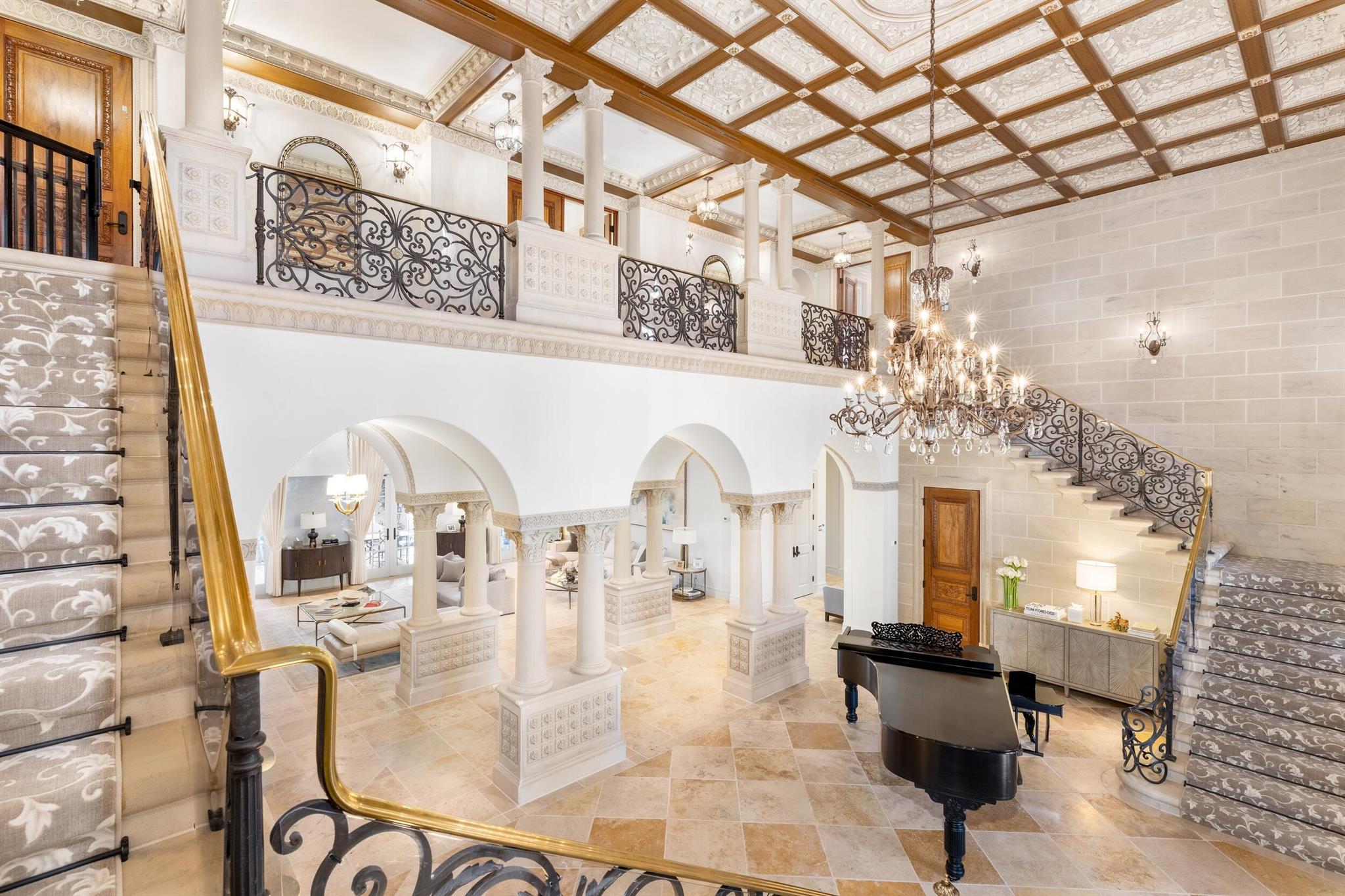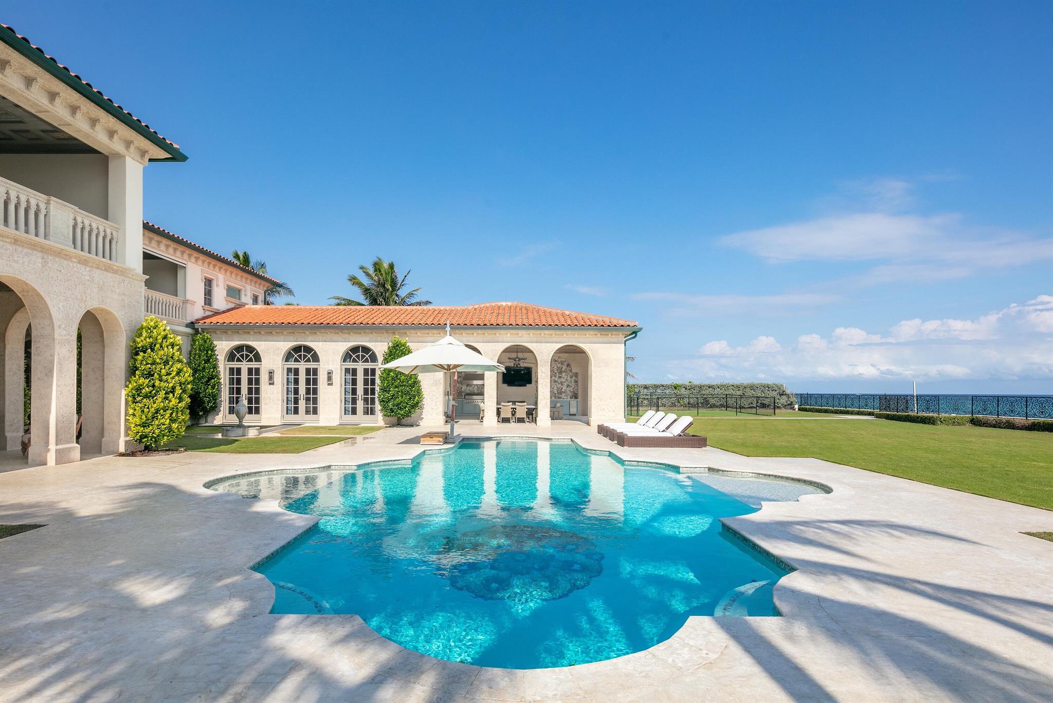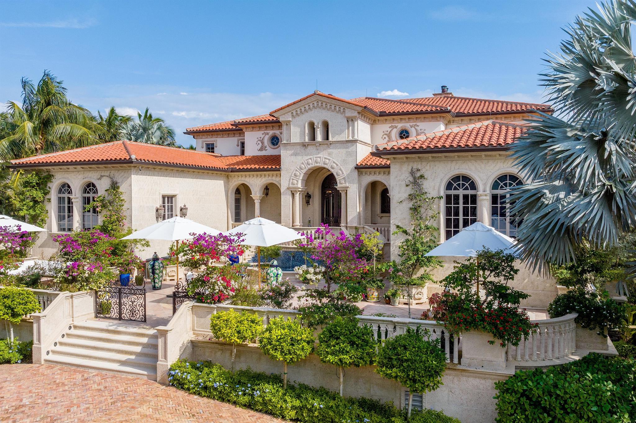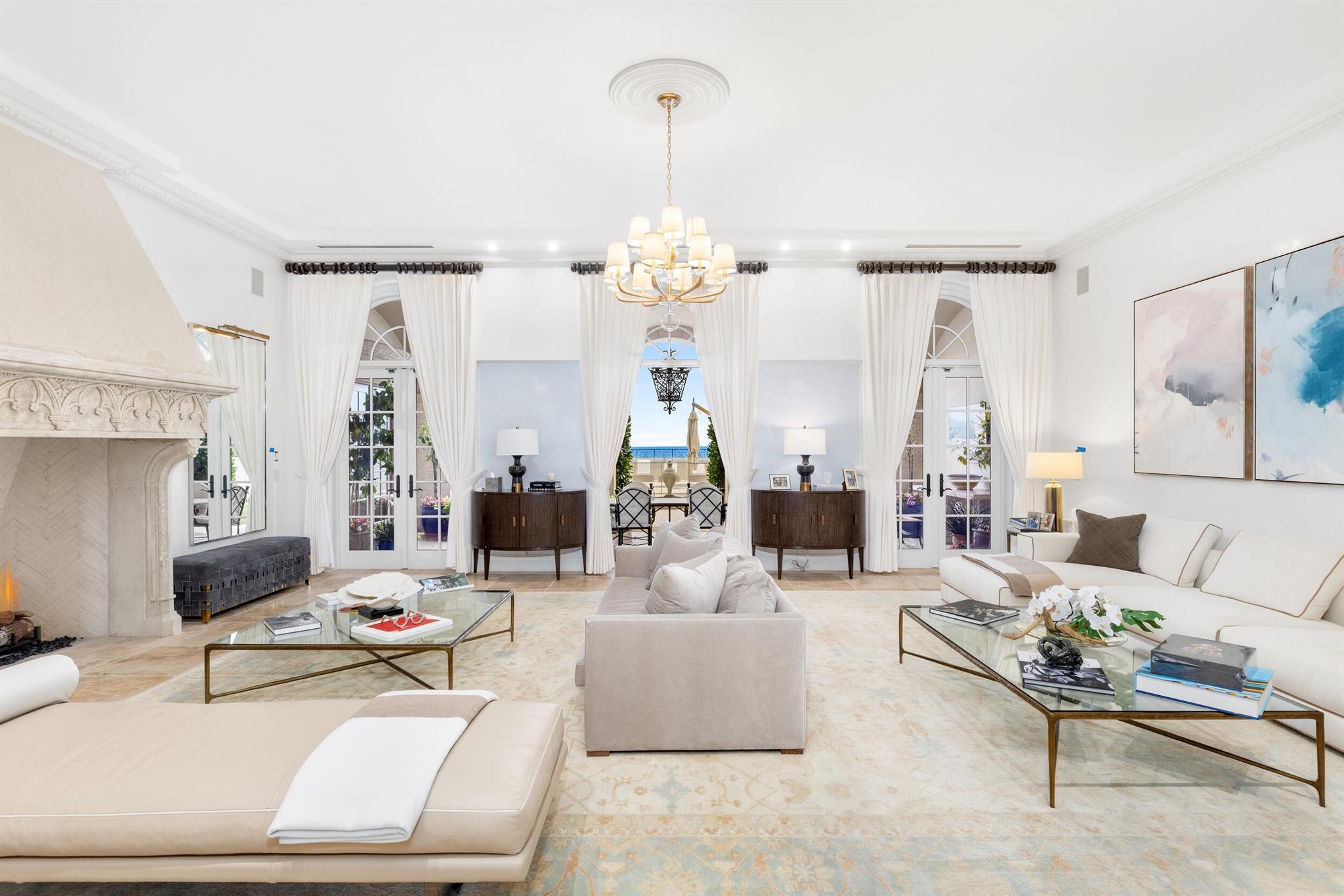Spectacular Ocean-to-Lake Light and Bright Modern Mediterranean Compound with 9BR/11.3BA and 150 feet +/- of Ocean and Intracoastal frontage. This one-of-a-kind estate features rich details, intricate millwork, and sophisticated finishes. From spectacular reception to oversized living spaces and gorgeous formal dining room, this home is perfect for entertaining. Stunning wrought iron entryway opens to welcoming foyer with sweeping, detailed ceilings, beautiful imperial staircase, and crystal chandelier. Pristine estate with great natural sunlight throughout. Eat-in kitchen with island, china and silverware closet, and butler's pantry. Fabulous theater room connects to pub room with full bar. Paneled library with detailed fireplace. Expansive second floor primary wing with fireplace,