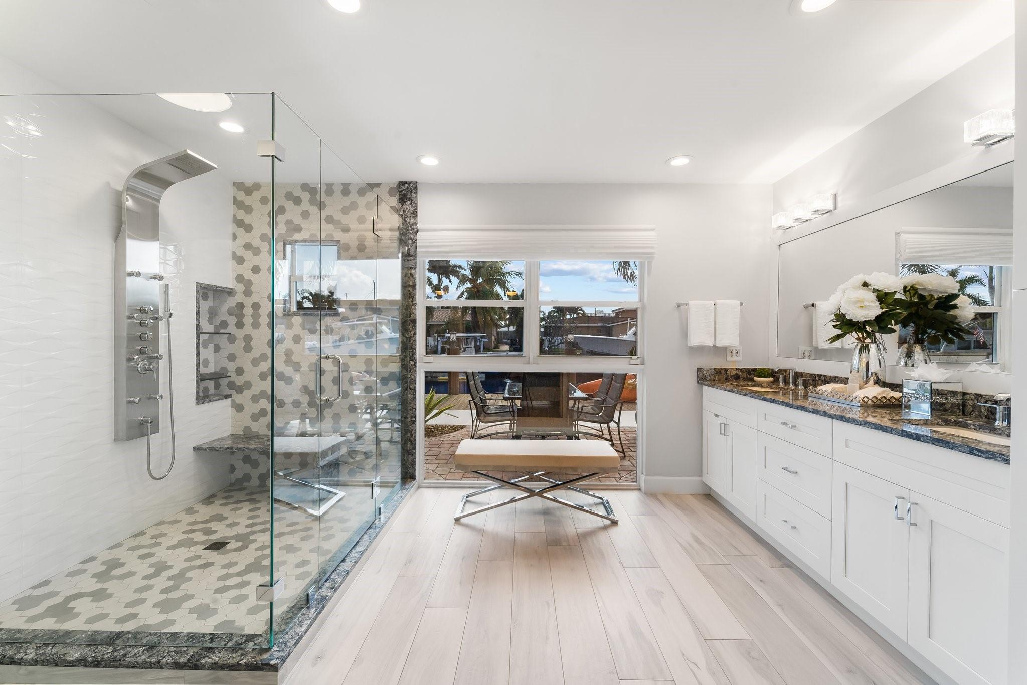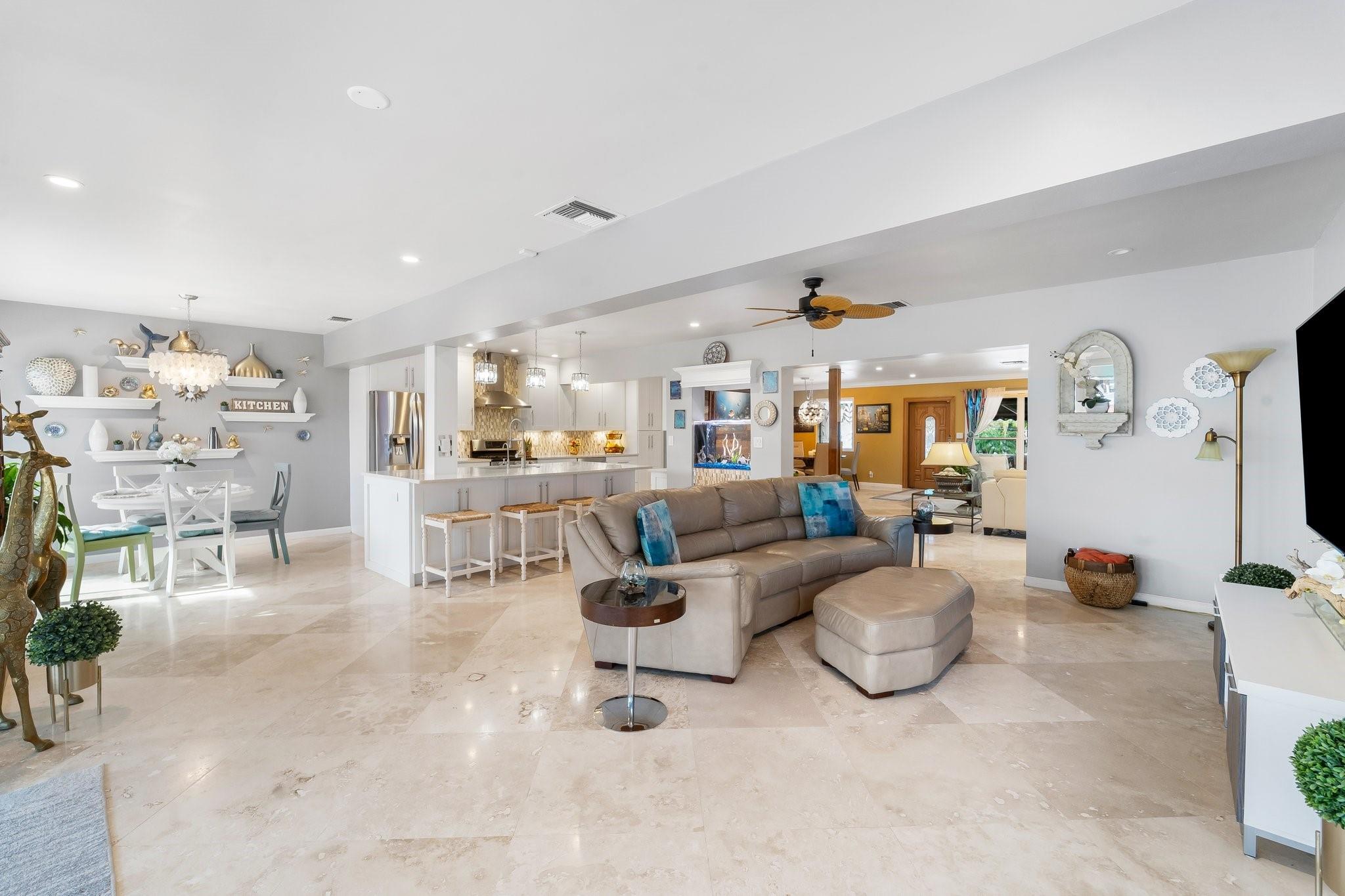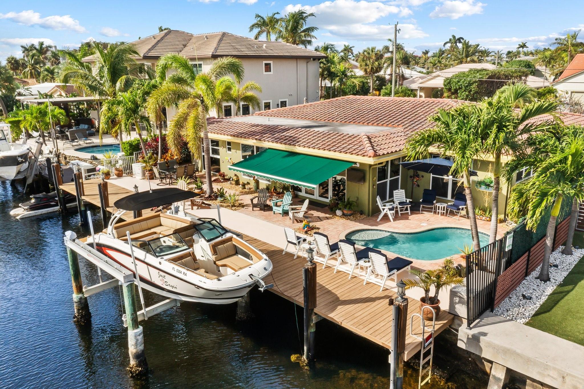 Boaters - Deepwater-No fixed bridges! 2408 sq. ft. 3/2 renovated decorator pool home with 75' on the water. Seawall reinforced with 2 feet of additional height and width. Shows beautifully with remodeled bakers kitchen, dining, living room, breakfast, bathrooms, bedrooms and entertainment areas. Reverse osmosis water purification system. Natural gas inside and out.. Full Impact glass and tile roof. Circular paver driveway with additional parking. Newer dock with reinforced pylons and 13k lb boat lift. Heated salt water pool on the patio with retractable sun shades front and back. 22kw generator and additional storage sheds. Epoxy floor in the garage. Click on the the drone video of the area.