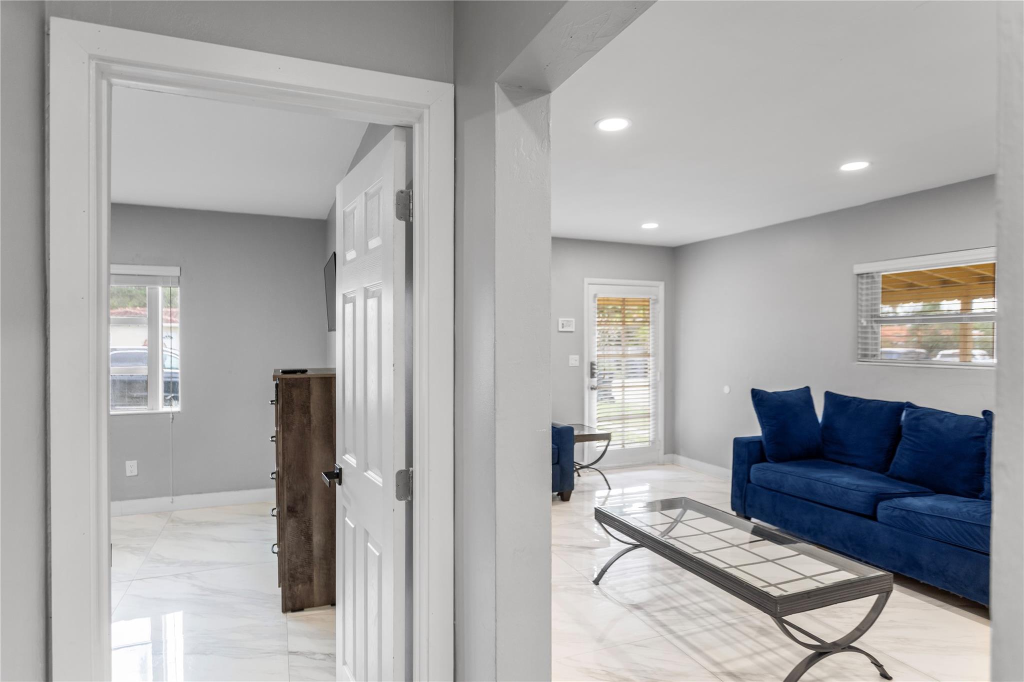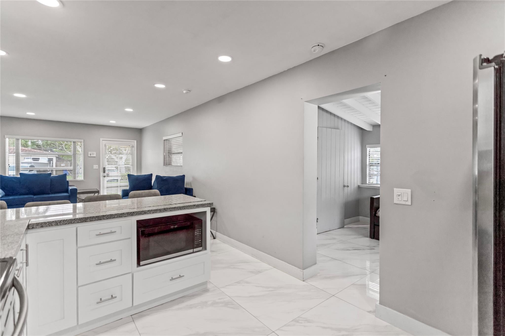 Open and spacious with a gorgeous, sleek and modern interior remodel featuring large porcelain tiled flooring throughout, large open concept kitchen with breakfast bar, stainless steel appliances, undercounter microwave, family room plus extra Florida room could be third bedroom, office, gaming room. Nicley sized bedrooms with stylish finishes and features. Beautiful completely updated and modern bathroom with custom tiled walk-in shower. Huge, fenced backyard with inground free-form pool. Central Fort Lauderdale location close to beaches, nightlife, dining, and downtown!