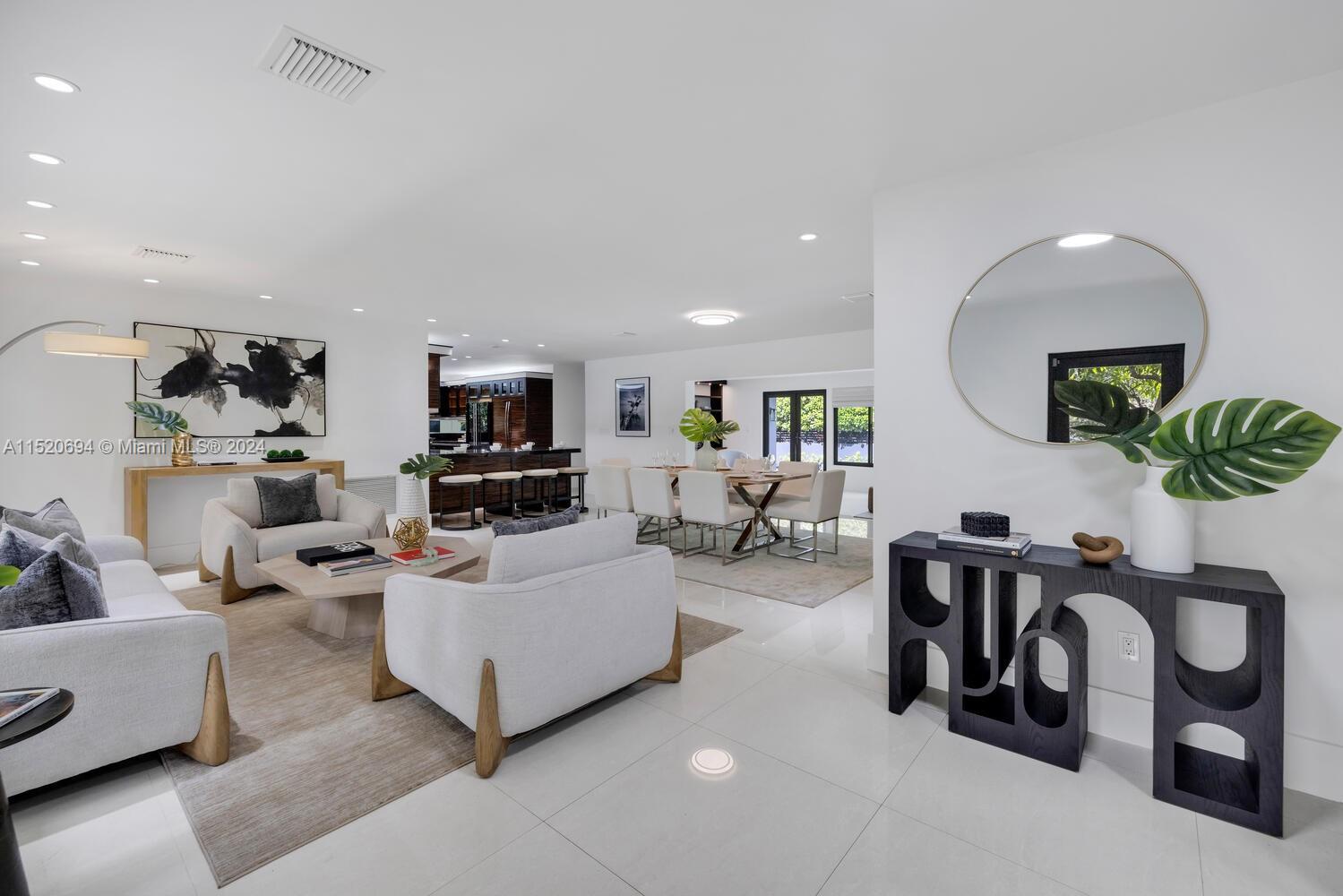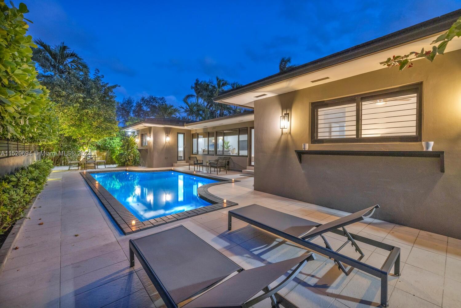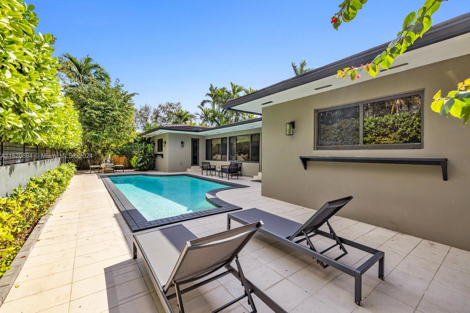 Welcome to Vila Brio! Come experience carefree luxe living in this beautifully updated sprawling mid-century modern designer pool home. Spectacular open-flow living, formal dining, grand media room and incredible double-sized custom eat-in dual-island gourmet kitchen with storage galore. Three spacious bedrooms in the main house, plus a fourth private entrance bedroom/legal in-law quarters with its own bath. Escape outside to the cleverly curated resort garden paradise with a sparkling pool, mature privacy landscaping, entertainment patios and space for relaxation. Totally turn-key: impact windows-doors; updated kitchen, baths, plumbing, electric, and porcelain tile floors; plus new A/C and pool equipment. All in Miami Shores' most prestigious neighborhood, on a quiet cul-de-sac