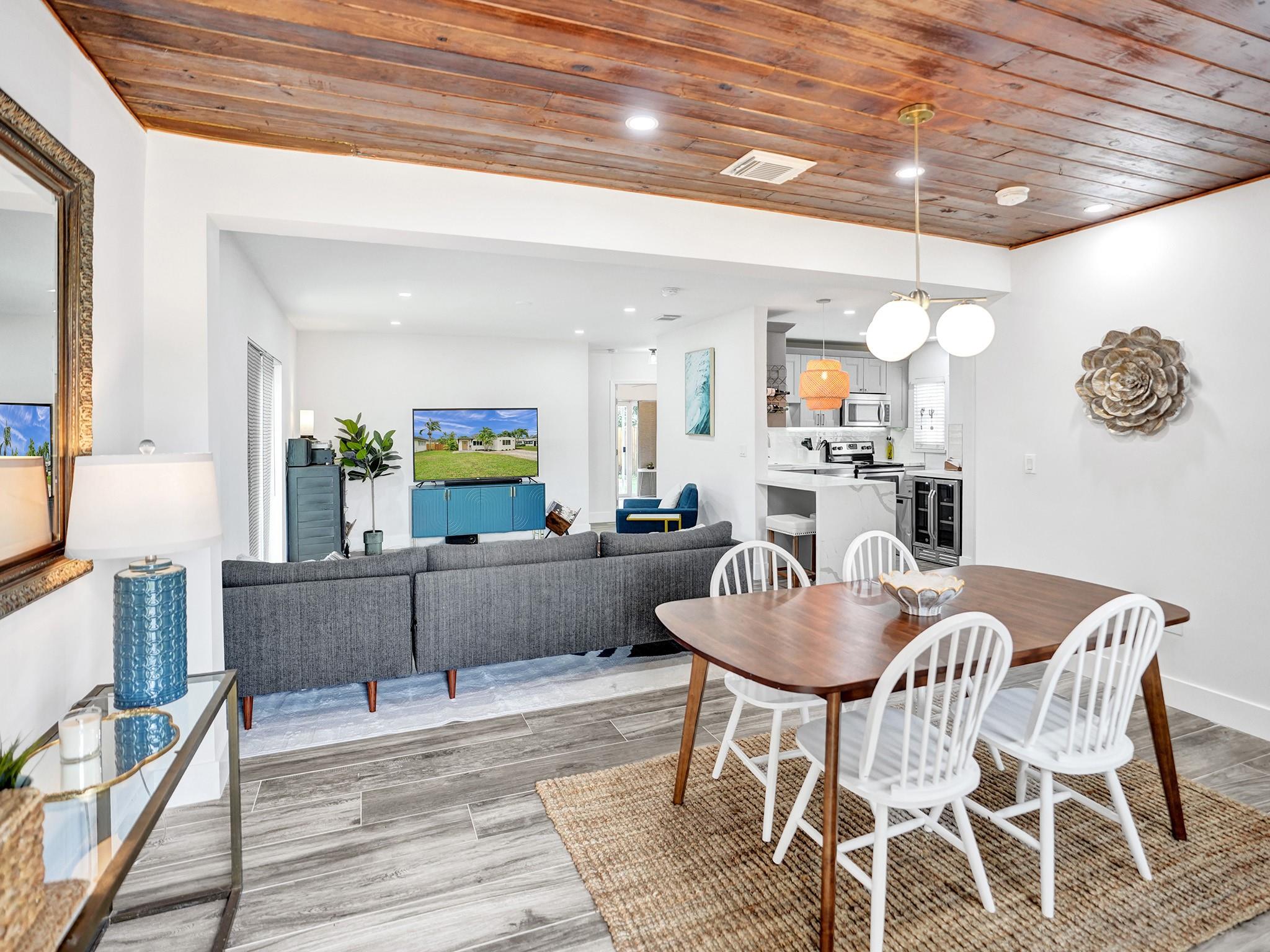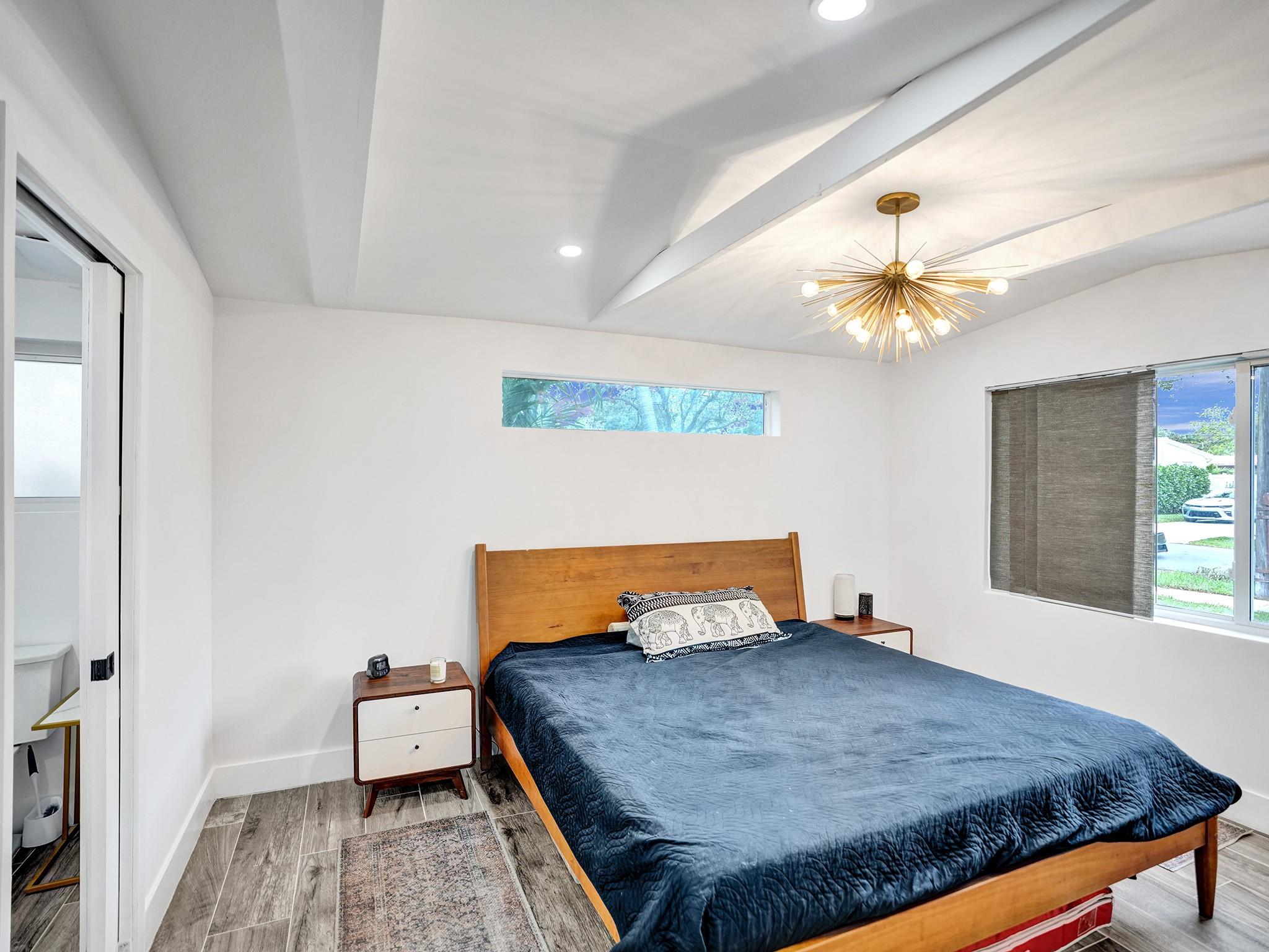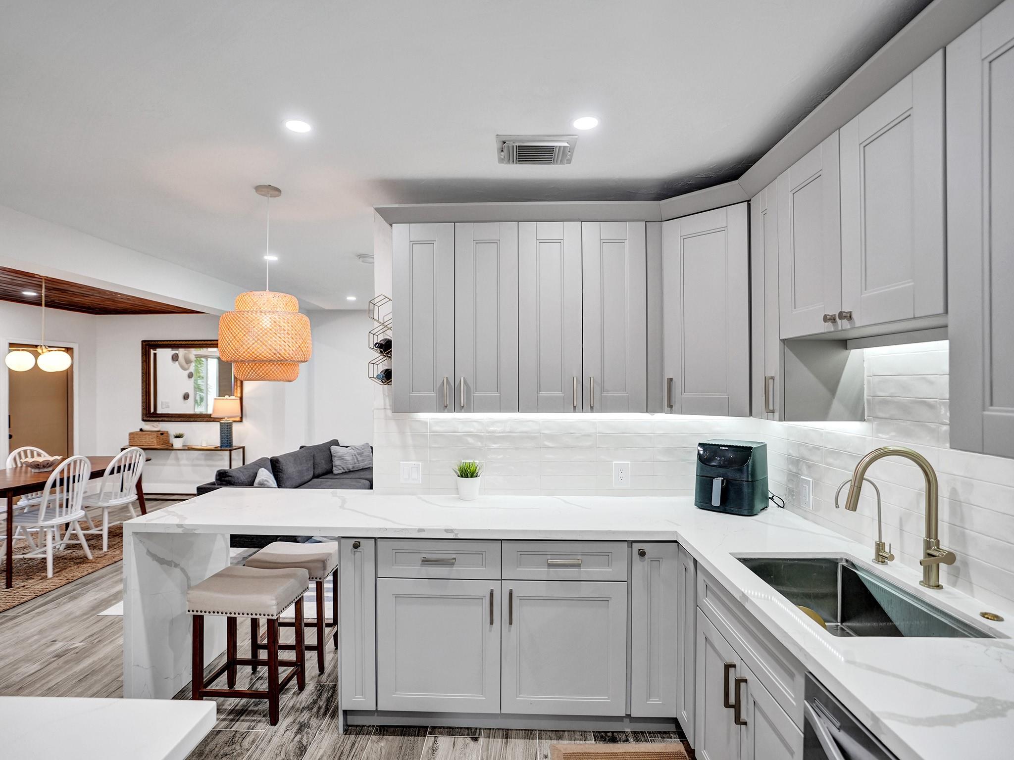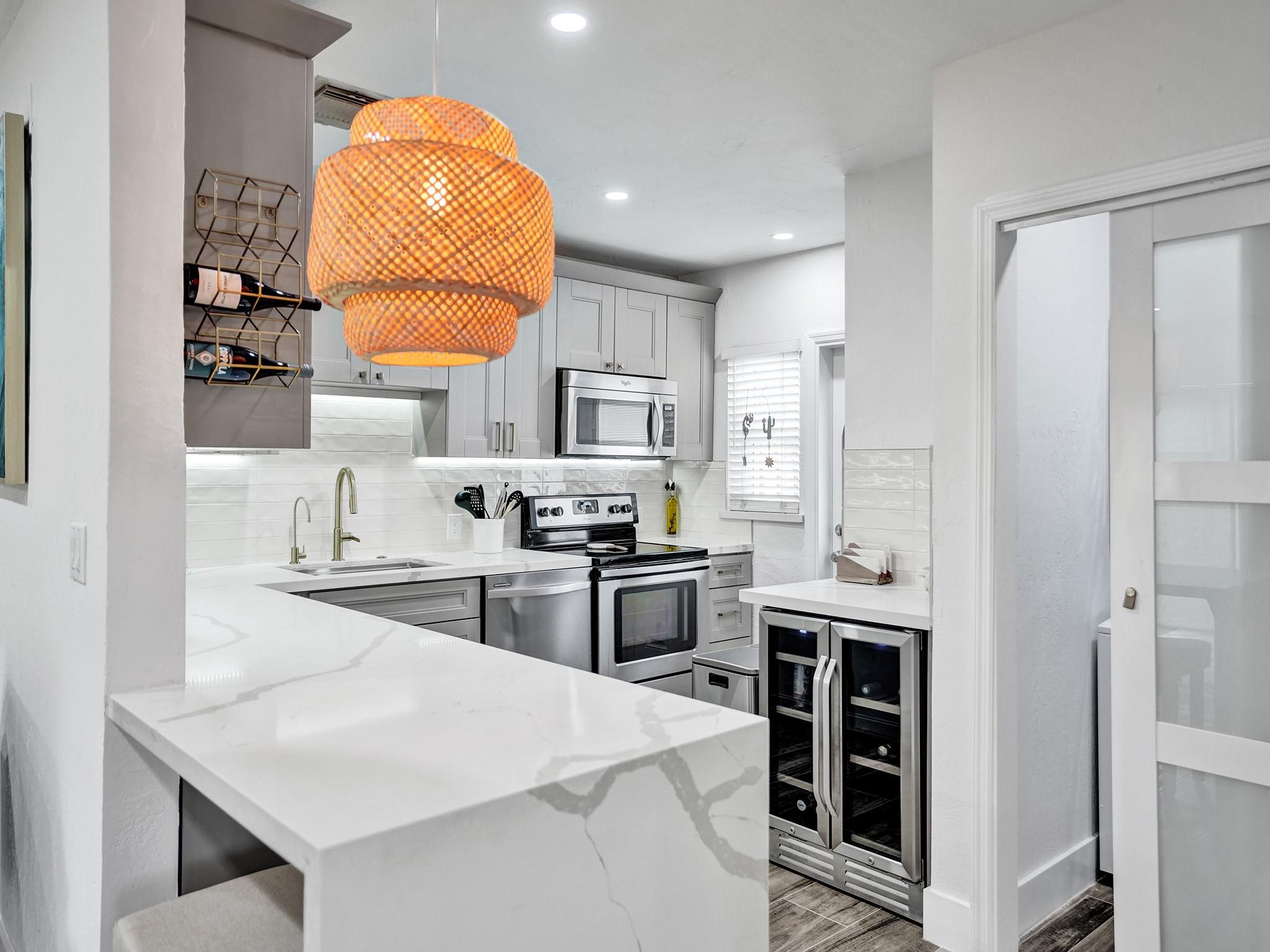 This stylish renovated expanded River Oaks home feels brand new. Addition includes an elegant and spacious carefully curated master suite featuring vaulted ceilings, modern chandelier, double vanity, massive shower and custom built walk in closet. Other updates make this home perfect for entertaining- such as expanded kitchen with peninsula open to living room and bar with beverage fridge. Details in cabinetry, backsplash and hardware set this home apart with a feeling of cozy contemporary charm. Screened front porch was enclosed to increase size and create separate dining area. Guest bedrooms share a large bath with soaking tub & separate shower. Guest bedrooms and living room provide easy access to yard through new hurricane sliders. Newly built workshop could be man cave/pool house.
