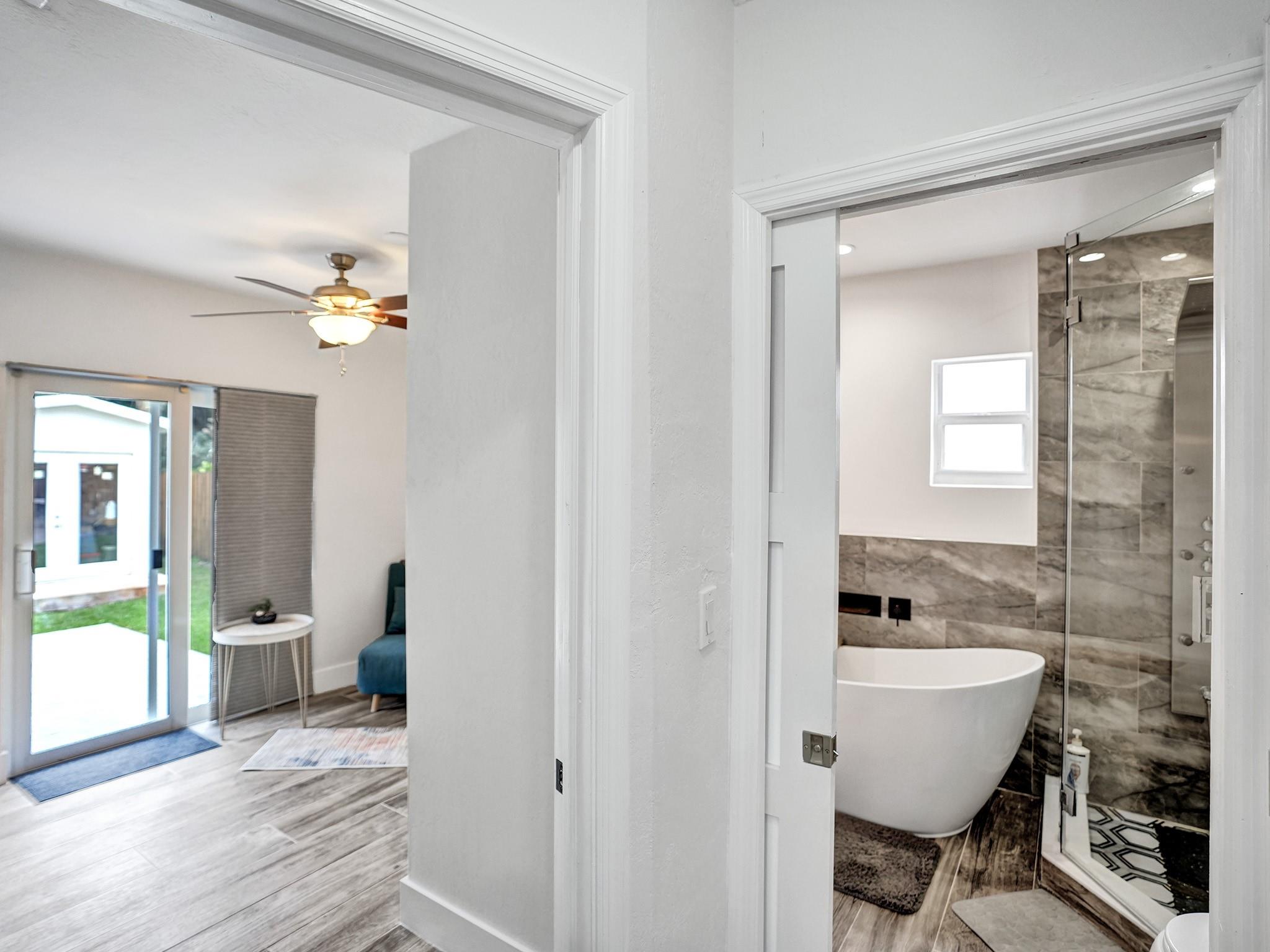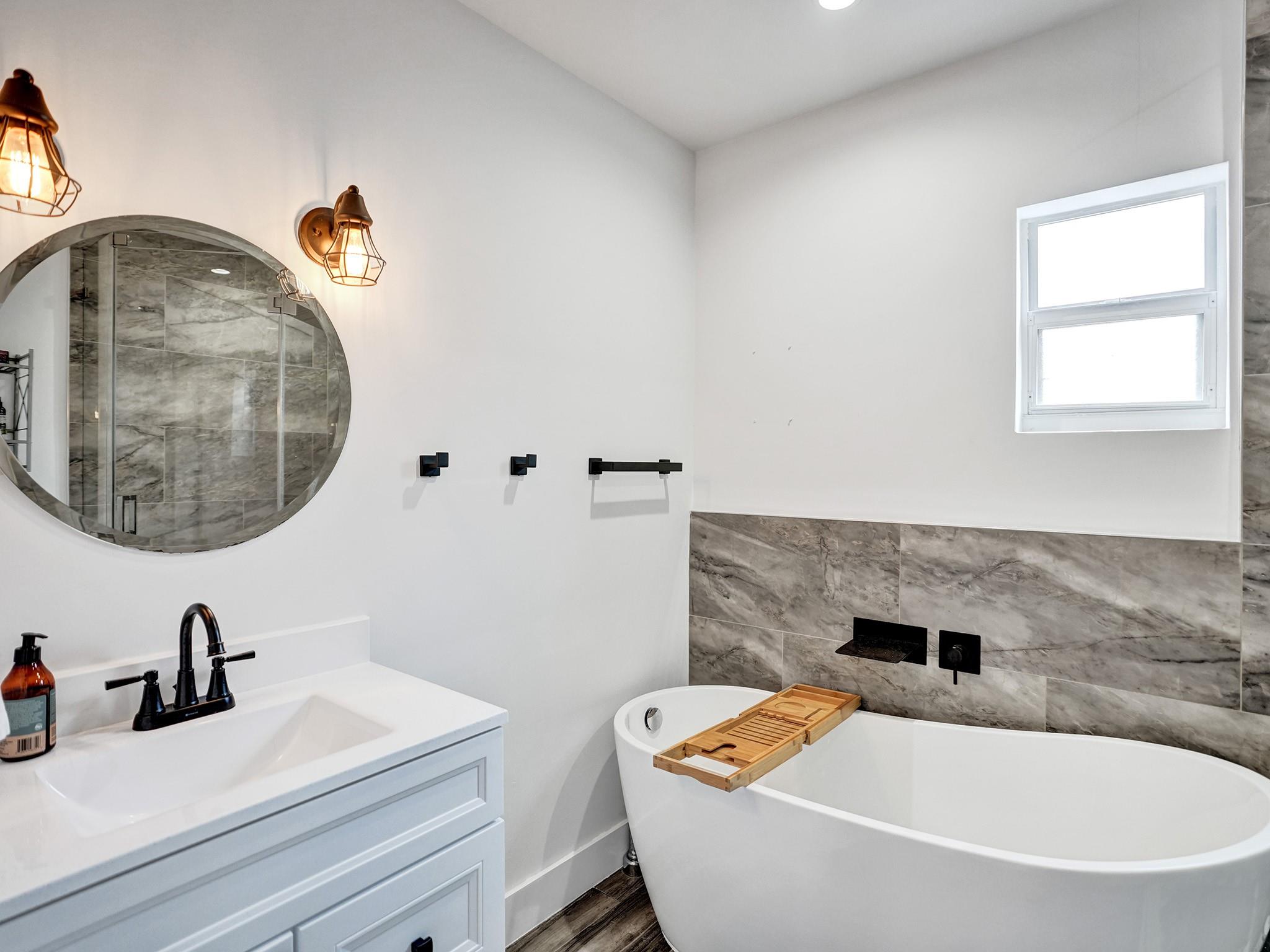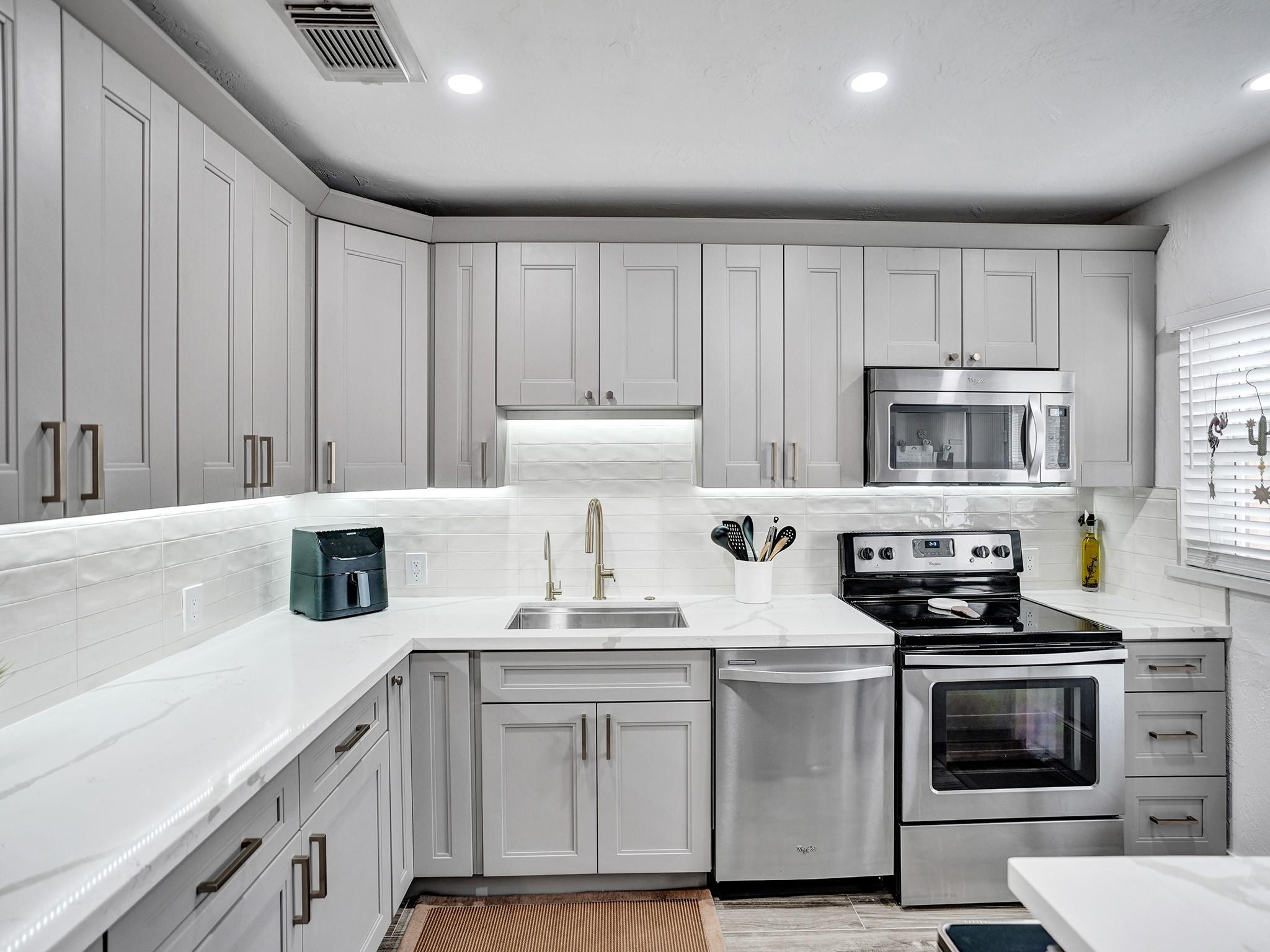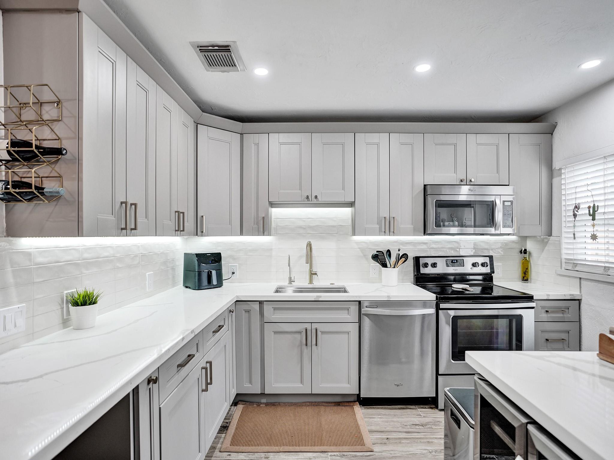 This stylish renovated expanded River Oaks home feels brand new. Addition includes an elegant and spacious carefully curated master suite featuring vaulted ceilings, modern chandelier, double vanity, massive shower and custom built walk in closet. Other updates make this home perfect for entertaining- such as expanded kitchen with peninsula open to living room and bar with beverage fridge. Details in cabinetry, backsplash and hardware set this home apart with a feeling of cozy contemporary charm. Screened front porch was enclosed to increase size and create separate dining area. Guest bedrooms share a large bath with soaking tub & separate shower. Guest bedrooms and living room provide easy access to yard through new hurricane sliders. Newly built workshop could be man cave/pool house.