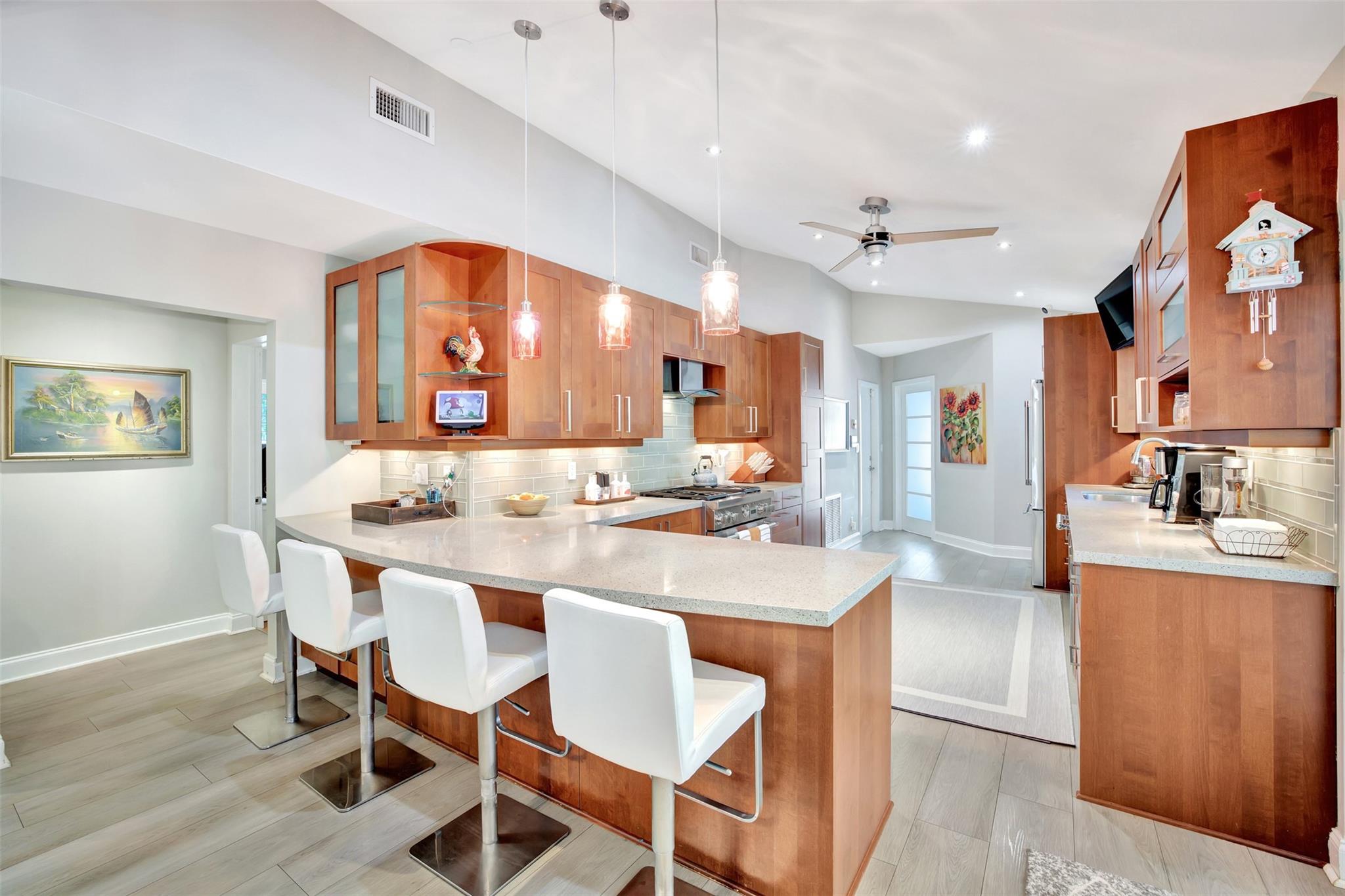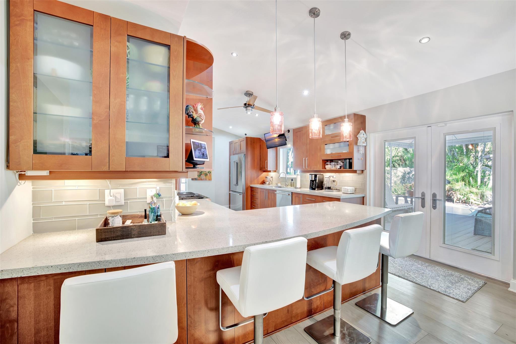 Tastefully updated 3 bedroom 3 bath plus den in desirable Coral Ridge. Spacious split floorplan with an abundance of natural light. Offering multiple living areas including large family room with custom tray ceilings. Contemporary open kitchen w/ vaulted ceilings, quartz counters, high-end appliances w/ gas range & expansive breakfast bar. Master suite offers bonus room for den, office or home gym. Master features tray ceilings, walk-in closet, bathroom w/ separate walk-in shower & freestanding tub. Second bedroom w/ ensuite bath. Tropical landscaped pool area, covered deck & sleek artificial turf. Ideal home for indoor/outdoor living. Impact windows/doors. Newer A/C & water heater. 2-car garage w/ circular drive. Bayview Elementary district. Close to Beaches, Shopping, Restaurants & More!