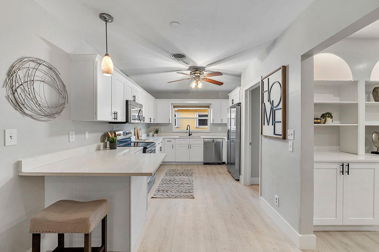 Welcome to this turnkey Coral Ridge Isles Oasis. This remodeled 4-bed, 2-bath pool home with a 2024 NEW ROOF features new luxury vinyl flooring throughout, recessed lighting, new paint and a skylight. The remodeled kitchen (2023) features sleek white shaker cabinets, quartz countertops, and a spacious walk-in pantry. Lots of storage with extra closets and an expansive two-car garage with an automatic hurricane-proof door. Stay comfortable year-round with dual air conditioners (new in 2021 and 2023) and full hurricane protection. This home offers additional upgrades including an upgraded sprinkler system (2023), replaced attic insulation (2023), and pool resurfaced with gemstone and adorned with new tile, filter, and skimmer (2024). Your relaxation awaits in the sprawling backyard.
