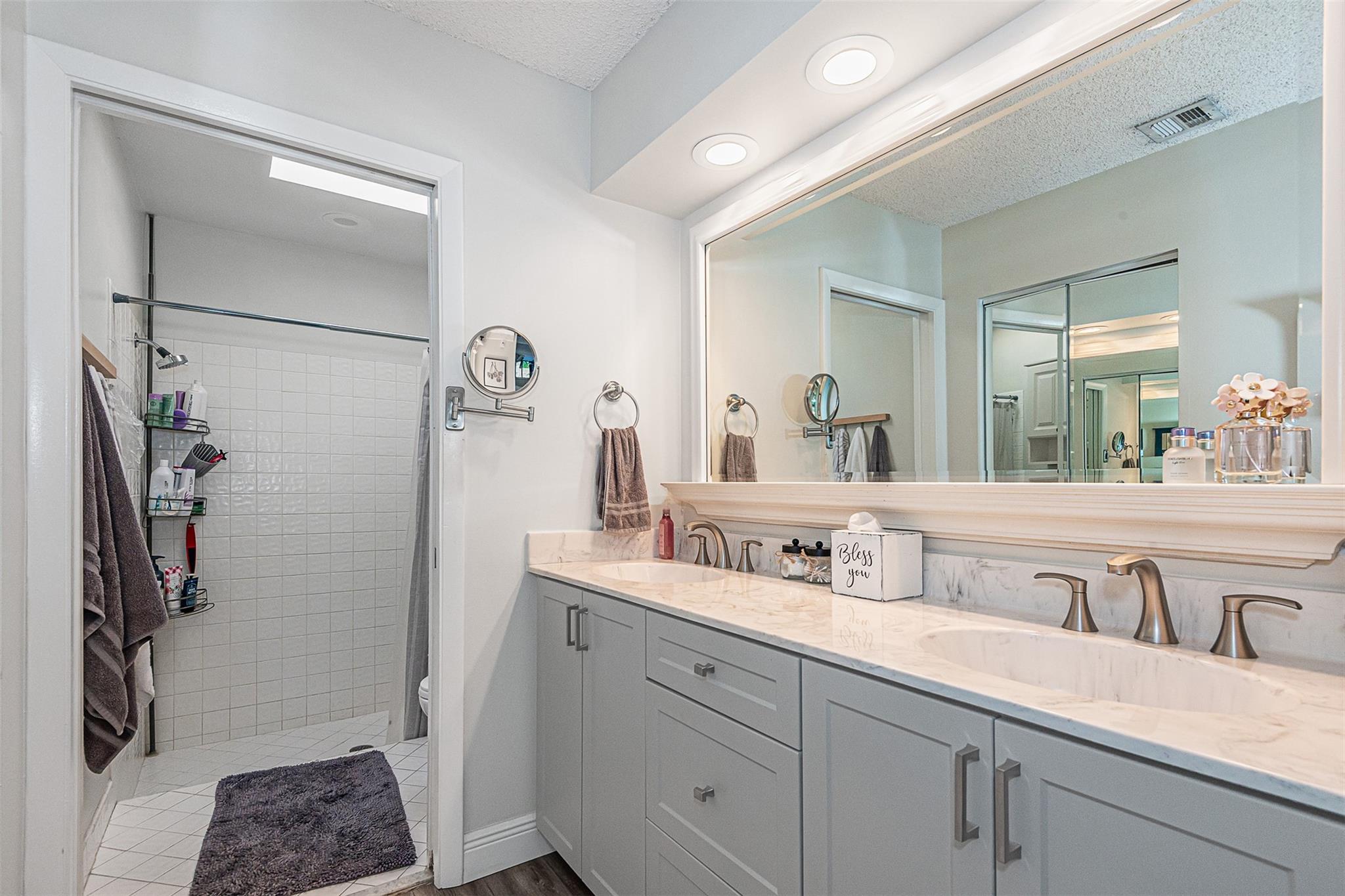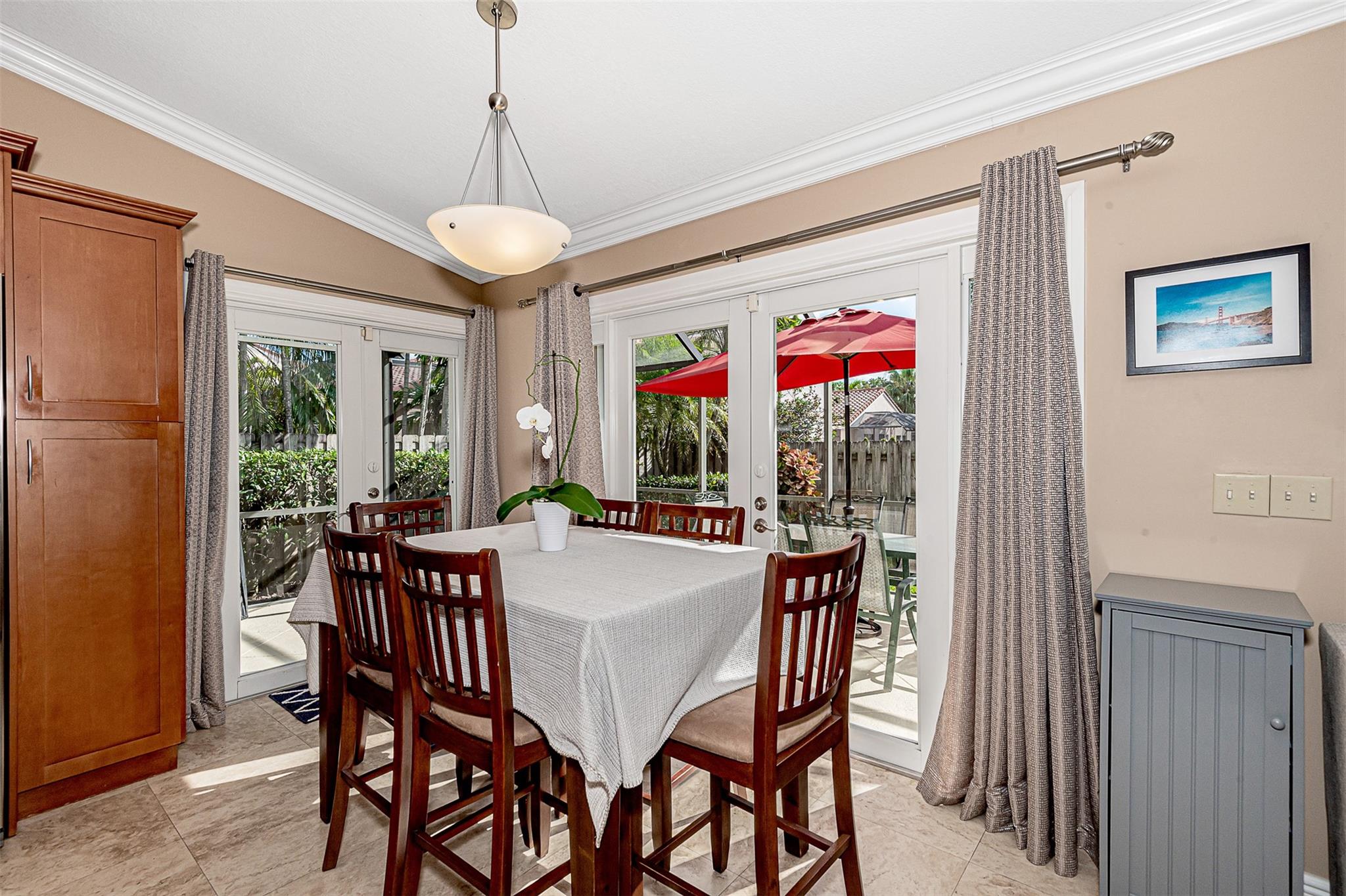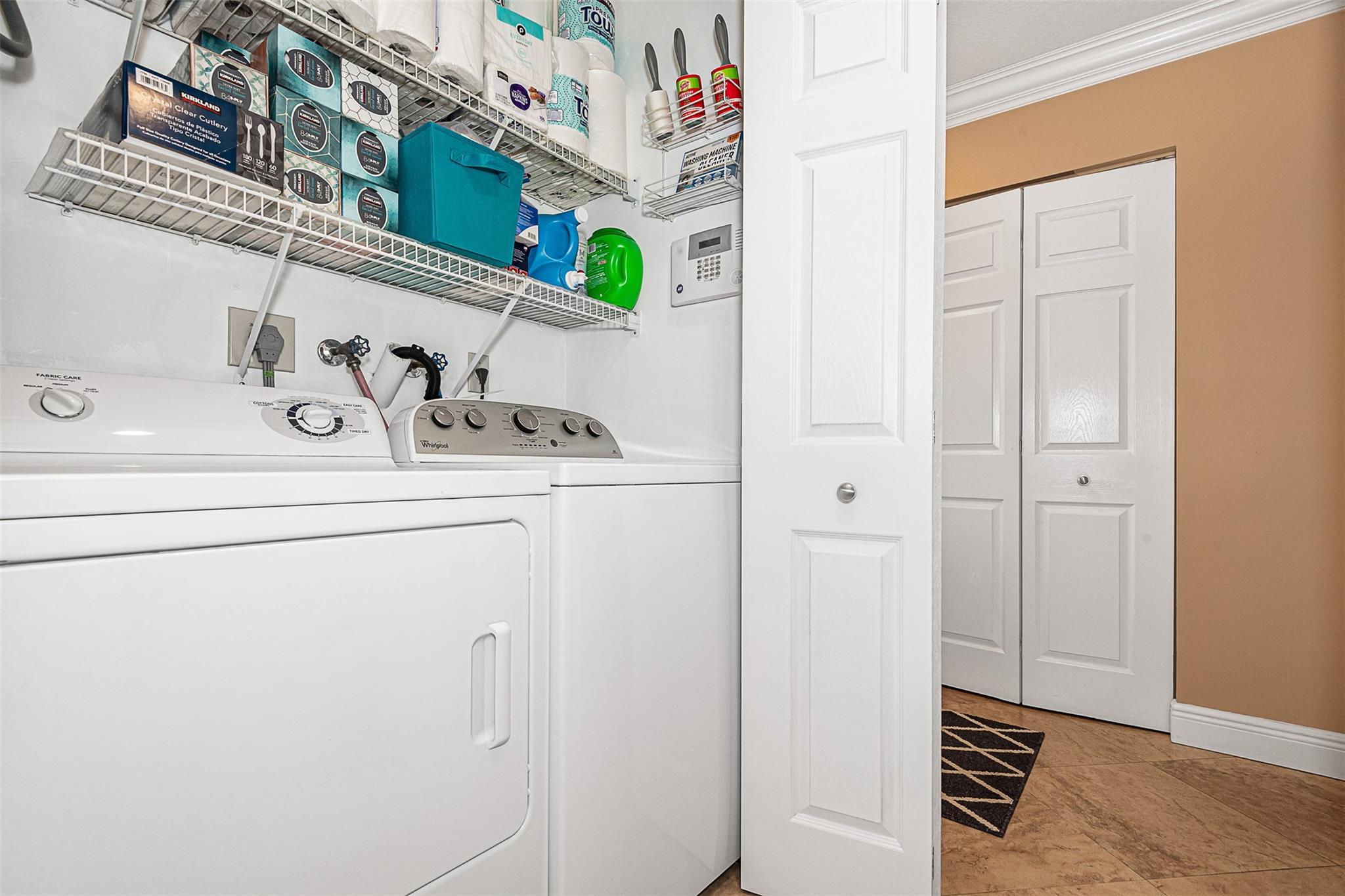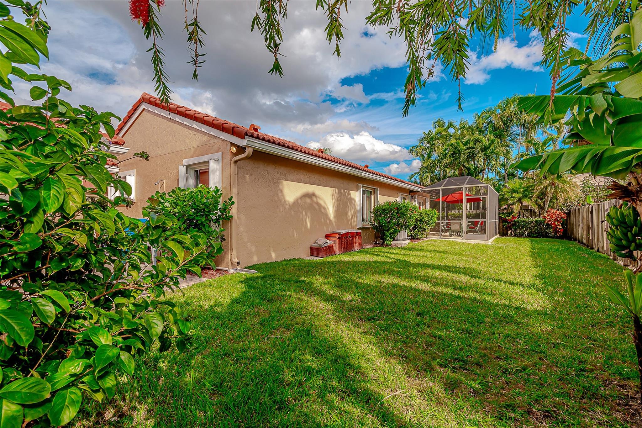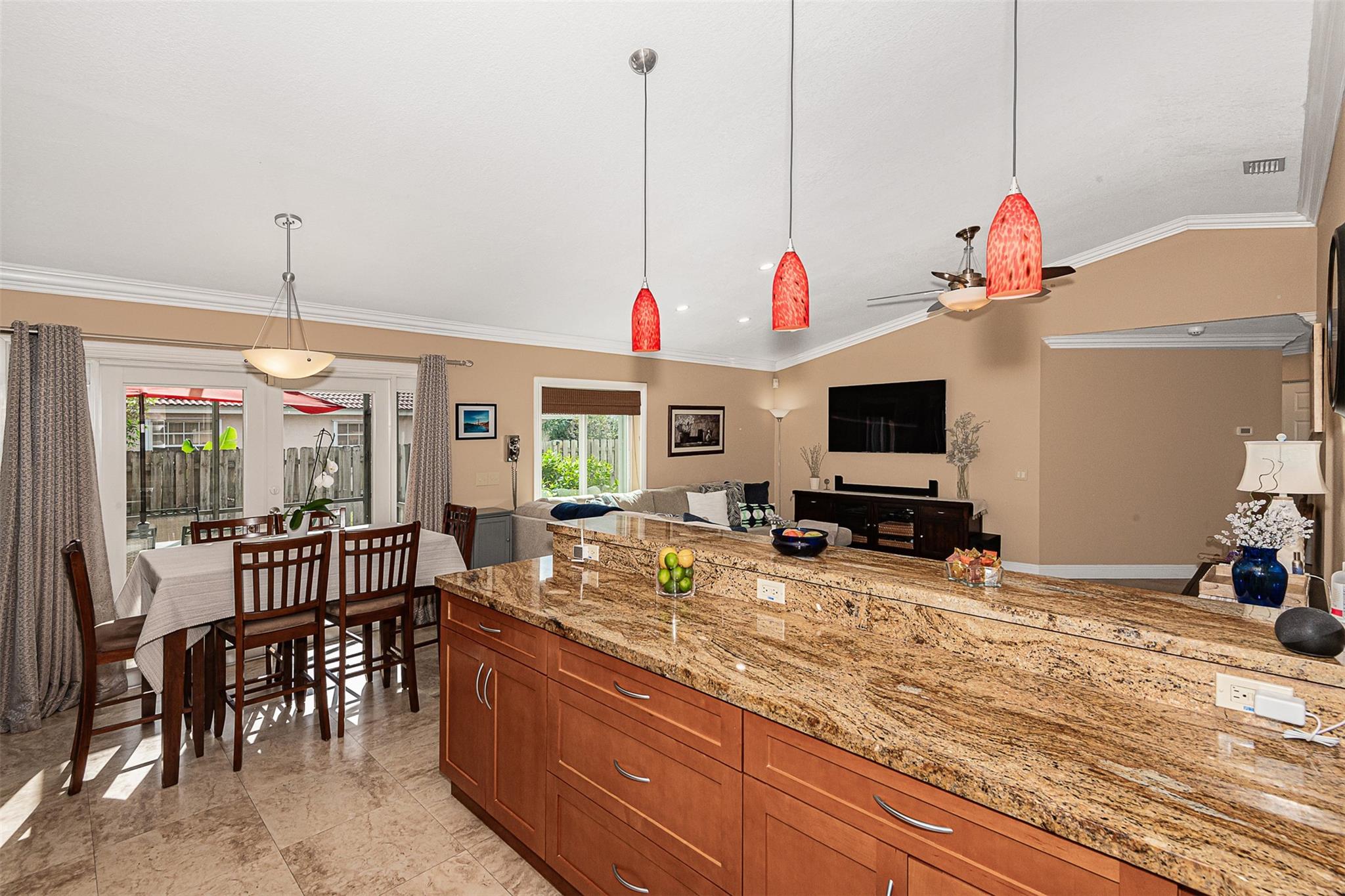Move in condition, with expanded, remodeled kitchen with tall cabinets w/pull outs, granite counter tops, KitchenAid stainless steel appliances. Upgraded bathroom vanities. 20" porcelain tiles and 6" baseboards. Crown molding throughout main living area. The following were installed or replaced 2023: impact skylight, impact widows and door, impact overhead garage door, exterior of home painted. In 2000-2002: water heater, Craftsman garage door opener, accordion shutters. Interior doors and hardware updated. Open floor plan and split bedrooms. Custom closets in all bedrooms. Oversized, fenced backyard features sprinkler system and various plants, plenty of room for dogs and swing sets. 600 sq. ft. screened patio. 6x10 shed included. 2 car driveway. Only 3 bedroom Garden Home available.