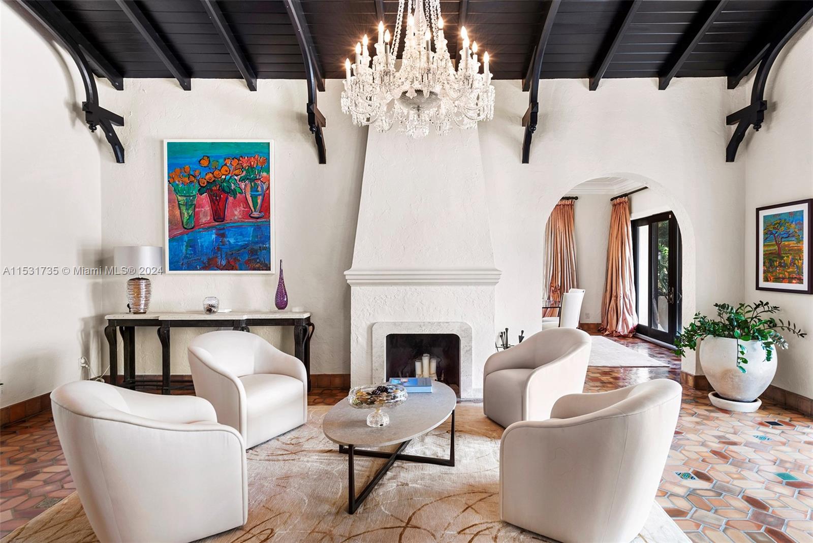 “El Escape” – an Italian Villa nestled within the lush Venetian Islands features stunning, original architectural details and panoramic vistas of Biscayne Bay from every angle! Step inside to discover majestic living spaces with soaring cathedral-beamed ceilings, oversized arched windows and doorways, fireplace, and original Arabesque tile floors. Oversized primary suite with modern bath, gourmet kitchen, family room, 3 beds in main house, “secret room”, guesthouse, and a 2-car garage awaiting discovery! Enjoy the tropical scenery of Venetian Islands and glistening water views from your secluded backyard! This home is a hidden tropical retreat offering a sanctuary for relaxation and entertainment, and ideal central location with access to all the wonders of Miami’s vibrant landscape.