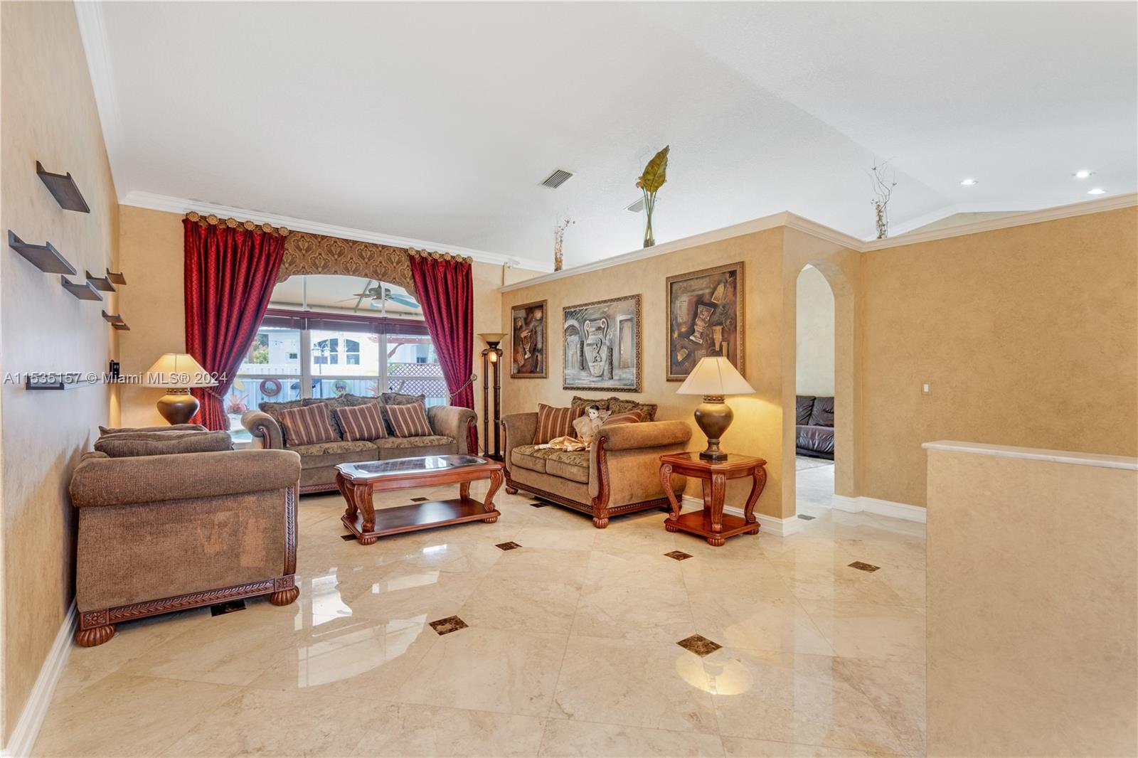 Rarely available home in Bristol Bay at Huntington. Nestled in a peaceful cul-de-sac, this beautiful 4-bedroom 2.5 bath home features marble flooring in living areas, wood floor in bedrooms, formal dining room, spacious kitchen connected to family room, double car garage, oversized lot (11,800 sq. ft.), and an incredible outdoor space. Kitchen boast tons of storage/cabinetry, stainless steel appliances, 2 separate sitting areas, great for entertaining. Impeccable backyard perfectly maintained and manicured, saltwater pool, large terrace with several covered areas to enjoy the space, irrigation system connected to well, impact windows/and or accordion shutter, and a fenced yard. Great family home, easy access from 1-75 and Turnpike - community has several parks and great schools.