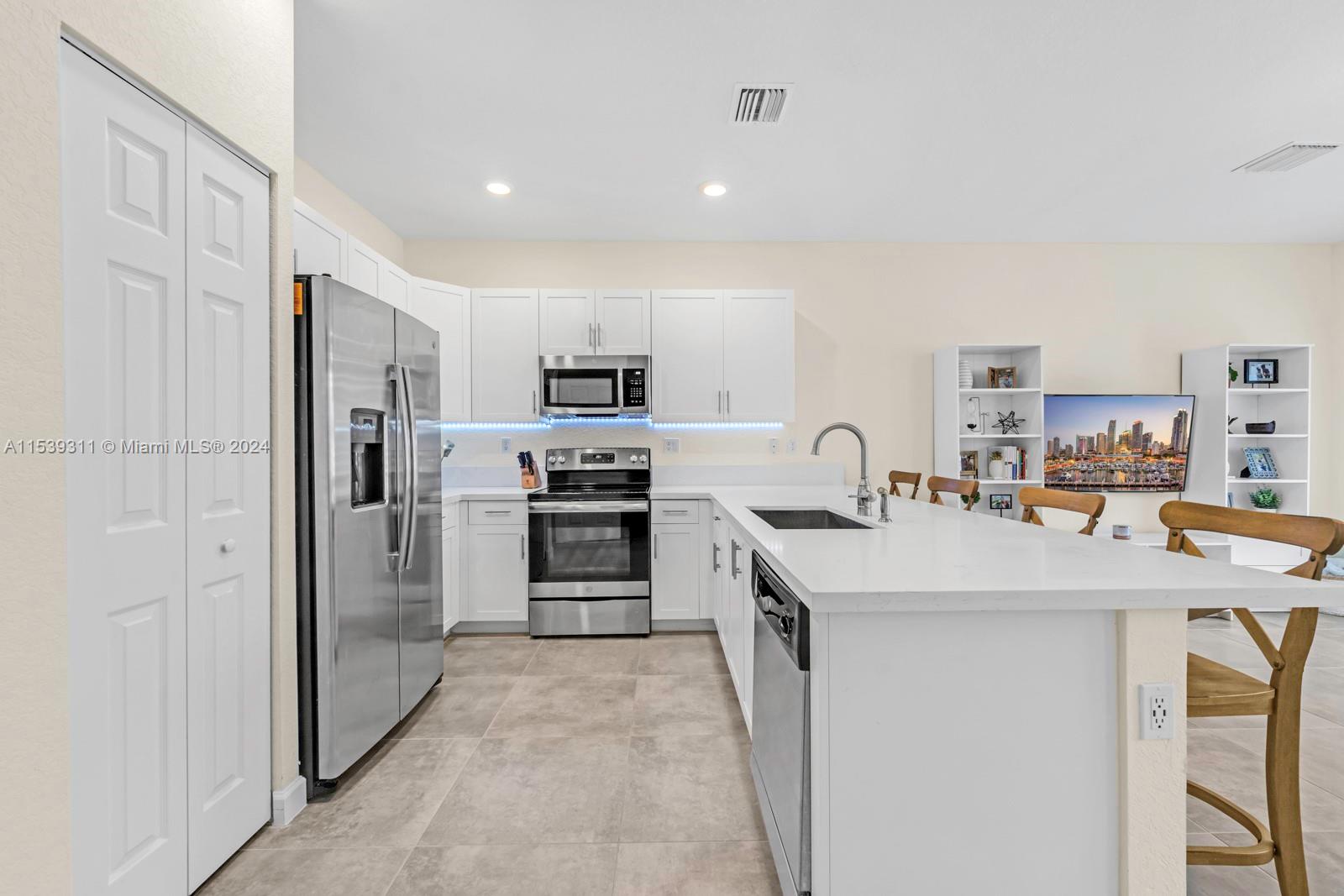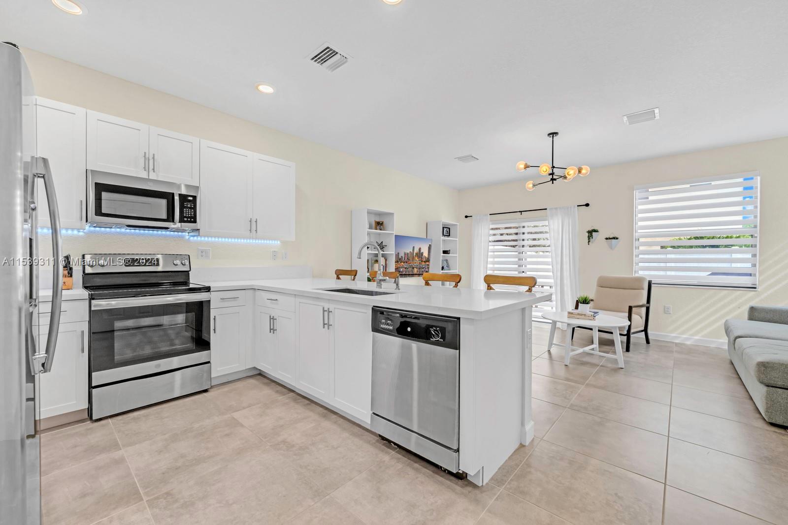 This home is located in the gorgeous gated community of Aquabella. The property sits on a corner lot featuring 3 bedrooms and 2.5 bathrooms with elegant touches throughout. The kitchen is fully renovated with stainless steel appliances and white quartz countertops overlooking a spacious family room. In the primary bedroom, you'll find a large walk-in closet with plenty of storage space. The backyard has cement and an entrance on the side fence for easy access to the yard. Enjoy resort-like amenities including swimming pools, children's park, fitness center, clubhouse and plenty of visitor parking spaces. Great location near major highways and a brand new shopping center featuring Publix, Homegoods, Five Below, and more. A + Rated Schools. Perfect home for first-time home buyers!