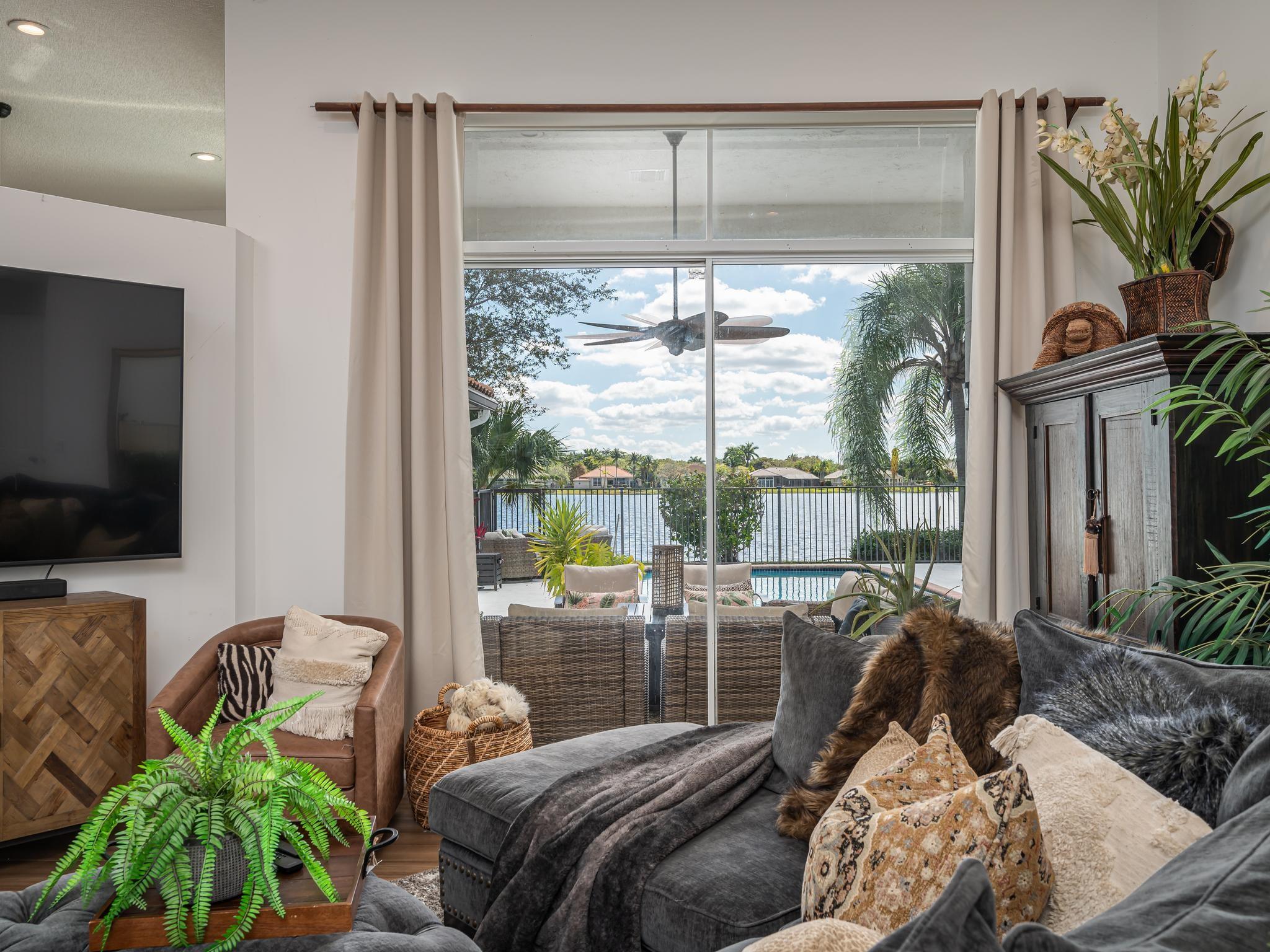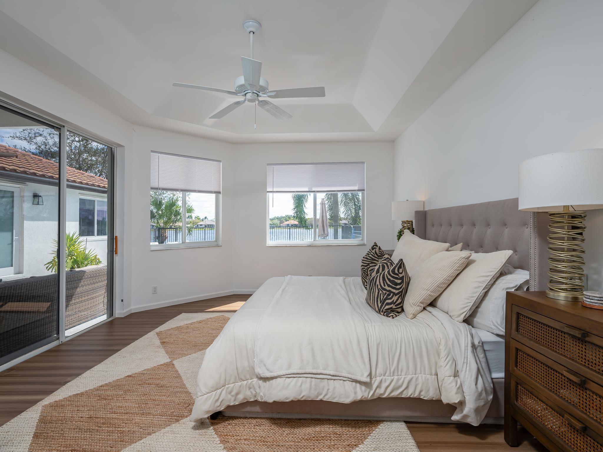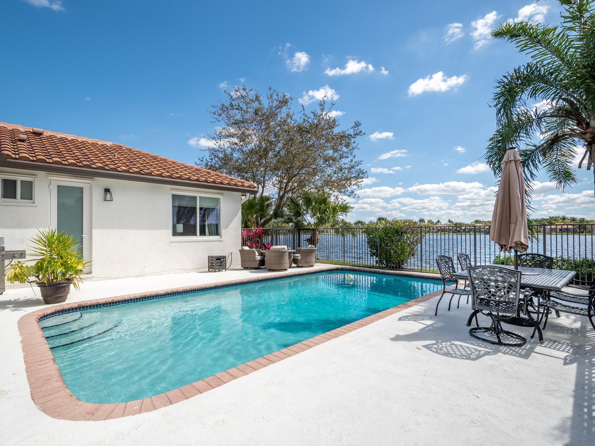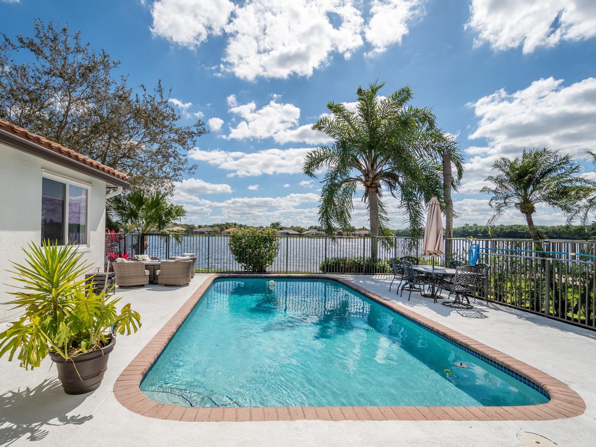 Tropical Paradise with a calming breeze from the endless water views of this 5 bedroom/3 bath pool home in Guard Gated community of the Islands. Brand New roof 2022 and Gutters!! 2022 Kitchen remodeled with all new appliances including wet bar wine fridge. Oversized Pantry!!! Hurricane Impact glass in several of the windows. 2022 Pool Motor. Fully fenced lot with doggy run. High ceilings. Cabana Bath remodeled out to the pool. Split floor plan where Master and 5th room/den(no closet) are one side of the home and 3 bedrooms on the other side. Community boasts covered playground, basketball court, and sand volleyball court. Walking distance to A rated middle and a bike ride away from A rated elementary. Cypress Bay HS zone as well. Sunrise and Sunsets are epic from this home.