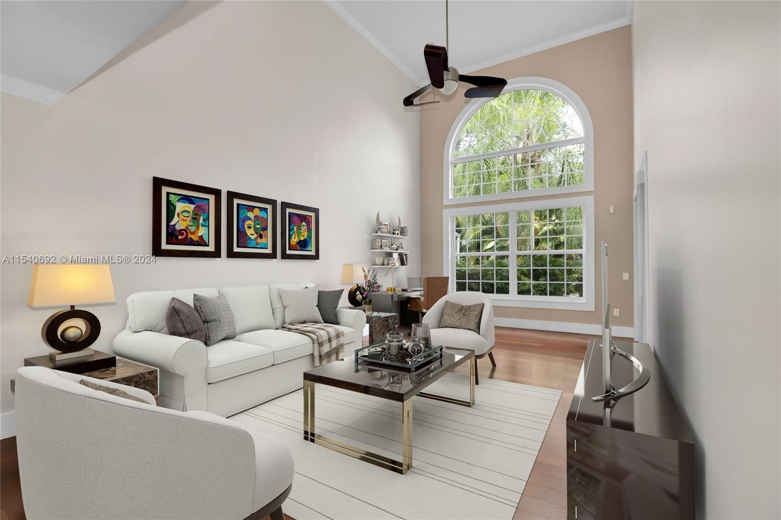 Discover the elegance of a 3-bedroom, 3-bathroom villa located in the prestigious Fairways area of Doral Estates Villas. This exquisite home welcomes you with a grand formal living room, accentuated by soaring 18-foot ceilings, luxurious Brazilian cherry wood floors, & sleek marble tile in the kitchen. The layout includes a convenient downstairs bedroom & bathroom, an indoor laundry room adjacent to the expansive two-car garage, & an outdoor screened terrace. Upstairs, find two ensuite bedrooms, featuring a spacious primary suite with a large walk-in closet, double vanity, Jacuzzi tub, & shower. The home is equipped with partial impact windows & accordion shutters. Residents enjoy access to Trump National Doral Golf & Spa Resort, 24 hour security with a gated entrance, & a community pool.