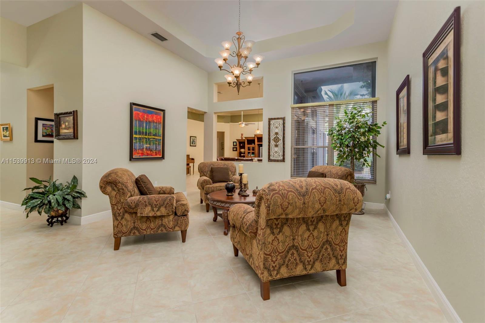 Impeccable one story home with wide lake views in the resort style community of Sunset Lakes. This triple split floor plan has 5 bedrooms, 3 bathrooms & 3 car garage, features volume ceilings and tile flooring in the main living areas. The large kitchen is complete with wood cabinetry, double ovens, wine cooler, granite countertops, snack bar & breakfast area. Covered outdoor sitting area & pavered patio overlooks the lake. This home is protected by accordion shutters.
