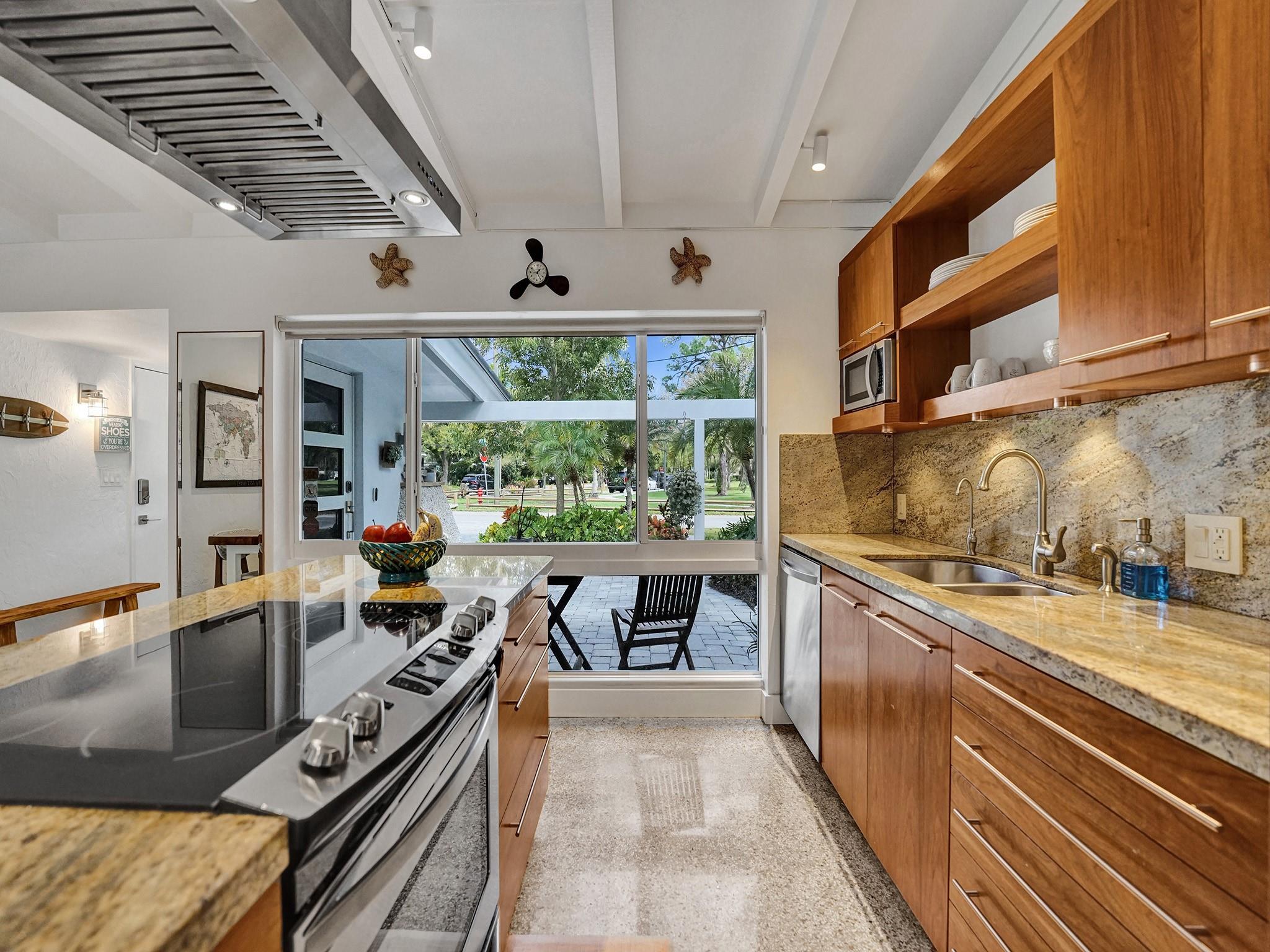 Amazing Opportunity to own a stunning, updated mid- century modern home on the water. Fantastic views of 6-acre park, plus tranquil water views. No Fixed Bridges, Ocean Access. 3 bed/2 bath. Polished Terrazzo Floors, Vaulted, Exposed Beam ceilings. Updated Open kitchen w/ granite countertop & backsplash. Updated bathrooms w/ designer finishes. Metal Roof, Impact Windows & Doors. Immaculate airconditioned garage. Screened porch to enjoy morning coffee /evening drinks & water views. Travertine pavers, walkway, patio- great entertaining areas. Finger Dock for 18-20ft boat. Corner Lot, Driveway w/ ample parking. Minutes to Downtown, Las Olas, & the Beach. Shady Banks has 2 parks w/ Tennis Courts, Volleyball, Playground & a Nature Preserve on the New River, w/walking paths & natural shoreline.