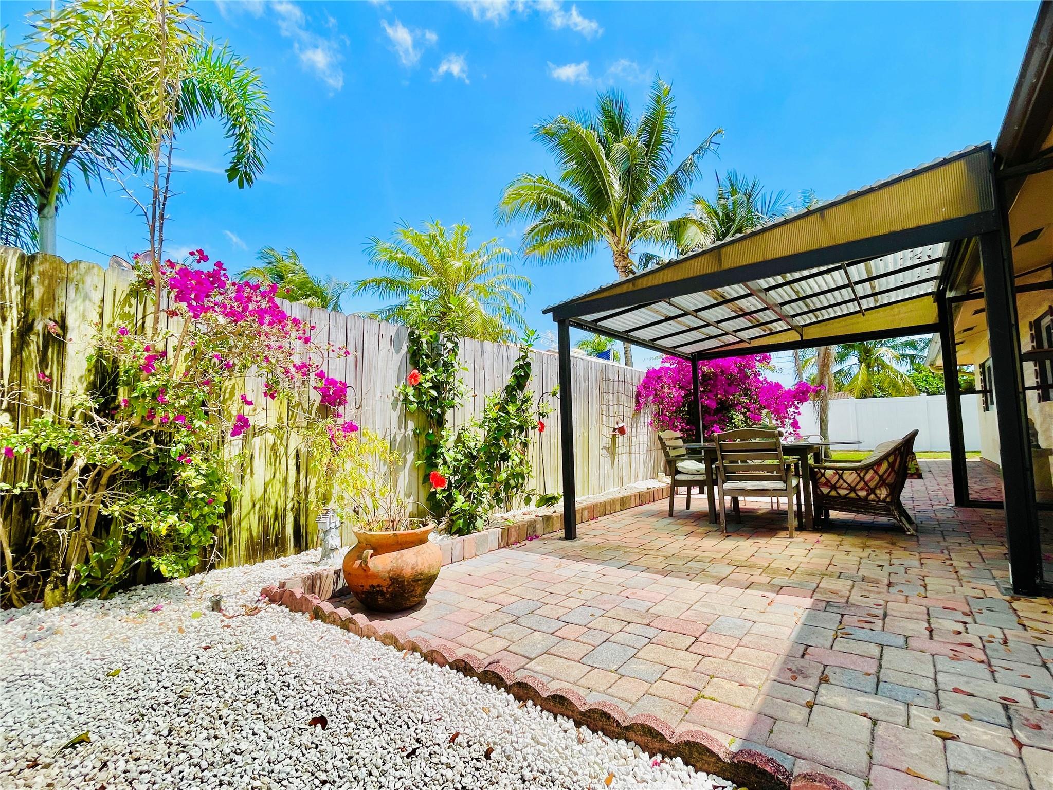 Welcome to this beautifully updated 2-bed/2-bath single-family home sitting on a corner lot. Featuring high-impact windows & doors, this home offers style. The dark brown wood kitchen cabinets complement the marble countertops, creating a sophisticated look. Inside, you'll find laminate floors throughout the house, adding warmth & charm to the living spaces. Both bathrooms have been updated & feature showers for your convenience. The covered back patio & totally fenced-in yard provide privacy. There is room for a pool $ a spacious shed for extra storage. The 1-car garage & circular driveway offer parking for many cars. Located in a great neighborhood, this home is just around the corner from Publix & less than 2 mi from the newly developed beach restaurants, shops & pier in Pompano Beach.