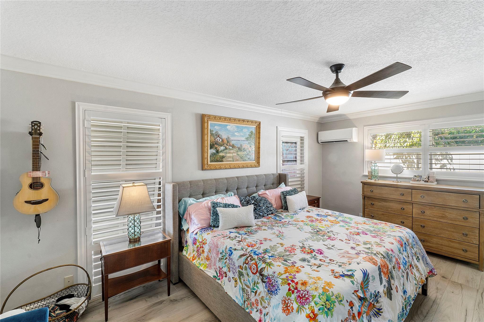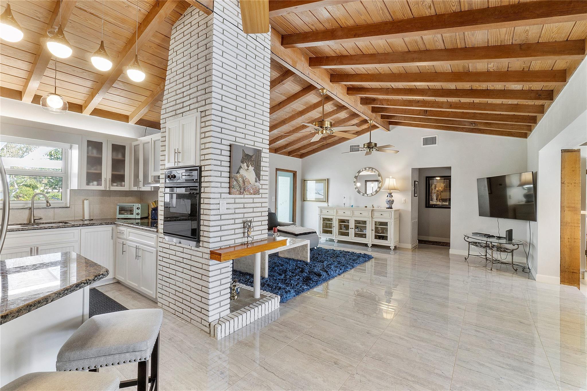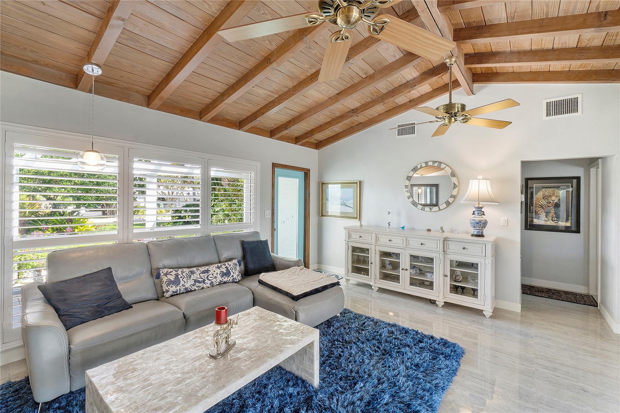 Immerse yourself in this charming 3BR/2BA split floor plan pool home in an East Side haven! Experience the warmth of vaulted ceilings, 24" tile floors, and abundant natural light. Enjoy the tropical oasis with a pool, freshly re-thatched Tiki hut & bar. Updated kitchen, impact windows, and more. The 2.5-car garage boasts a separate laundry/storage room and durable resin flooring. Additional features include A/C (2015), updated electrical panels, 3-zone sprinkler system, and a newer PVC fence. Nestled on a shaded street with a unique median street divider, it's your ideal retreat that's only a short bike or golf cart ride near restaurants, beach, and entertainment!