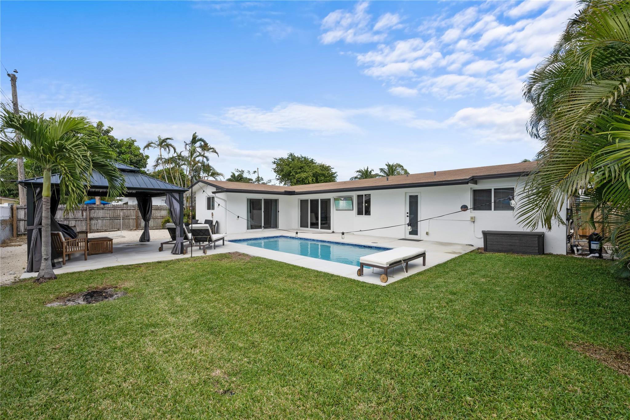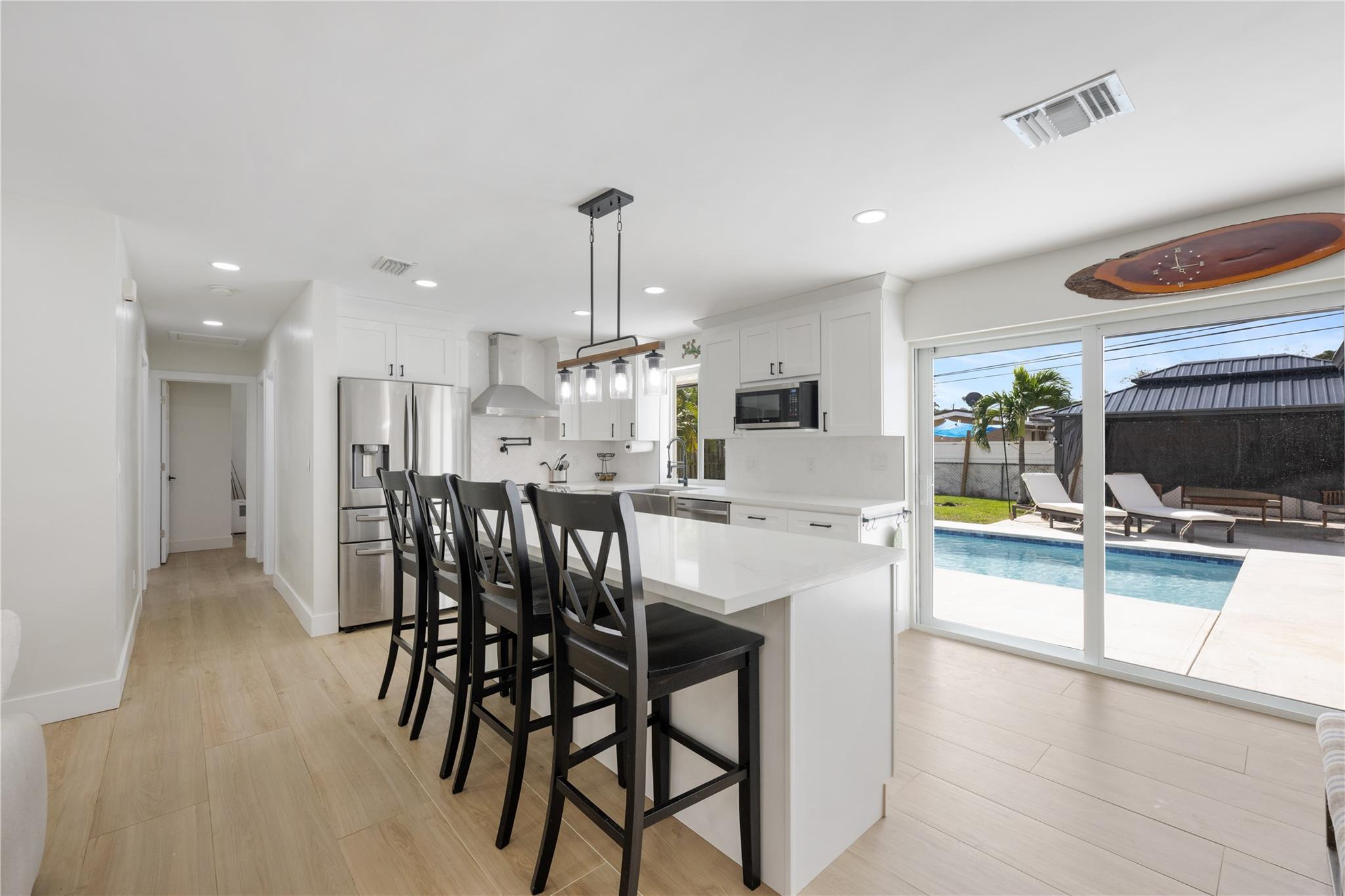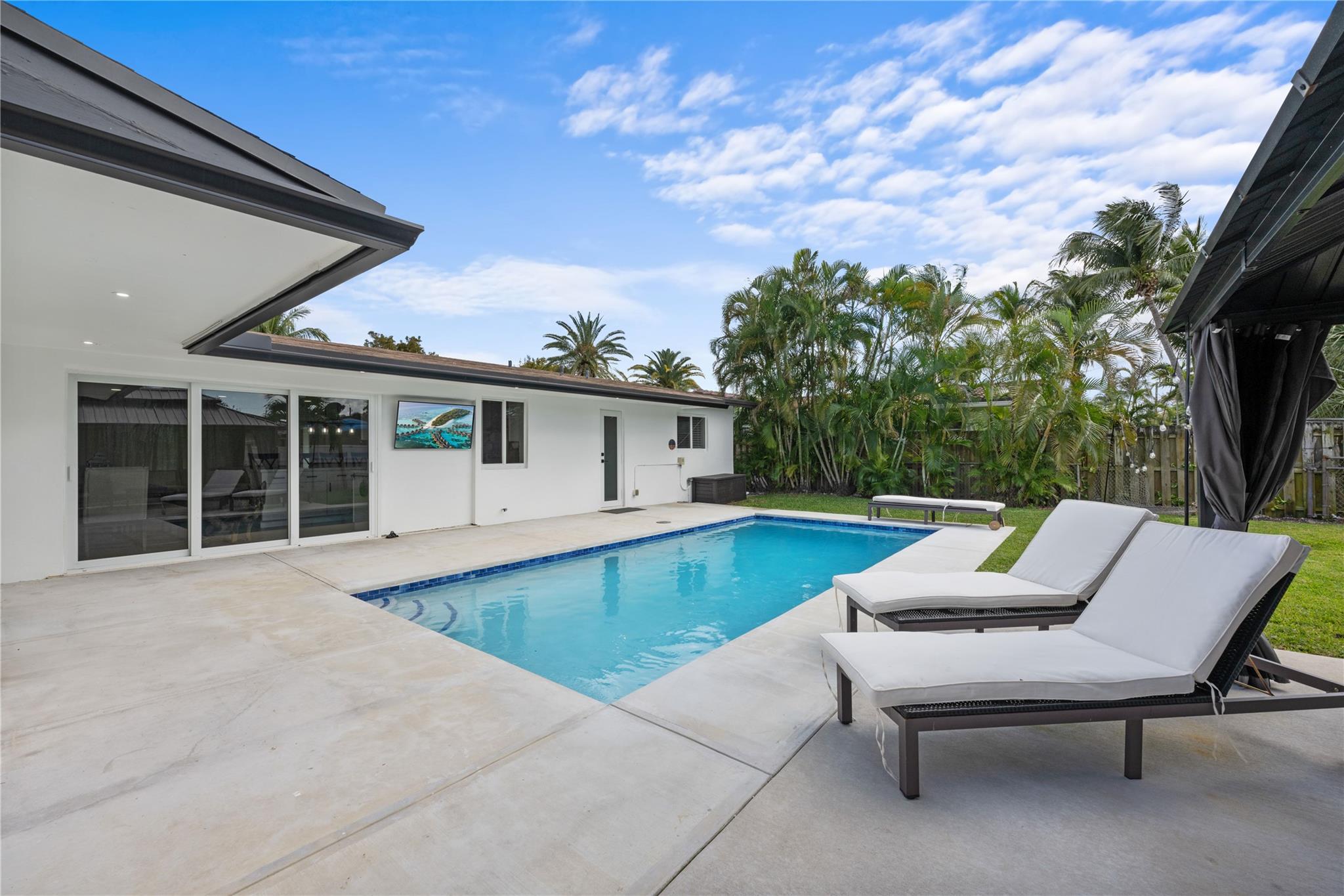 Stunning 4-bedroom, 2-bathroom home in the sought after Garden Isles neighborhood of East Pompano! Open floorplan connecting the kitchen, dining room, and living room areas with sliding glass doors to the recently updated saltwater pool creating a perfect indoor/outdoor space for entertaining. The kitchen has custom shaker cabinets, quartz countertops, stainless-steel appliances, and features a large island with additional storage. Tile floors throughout. Master bath has dual sinks and extra-large shower. Guest bath has a cabana door for easy access from the pool/backyard. Impact doors and windows. The garage and circular driveway can accommodate approximately 6 vehicles. Less than a 10-minute drive to Pompano Pier and close to intracoastal waterways. Roof 2020. AC 2021.