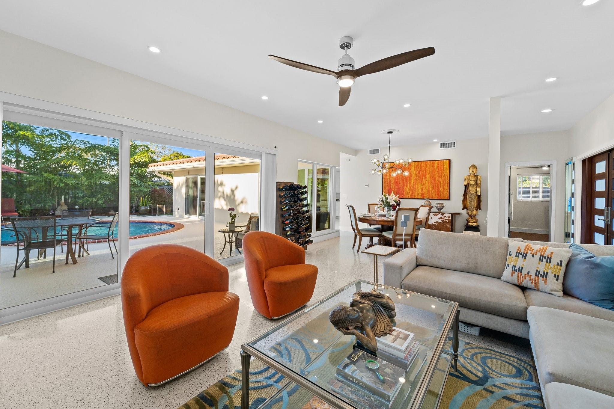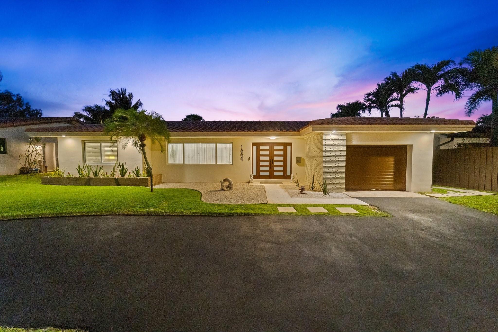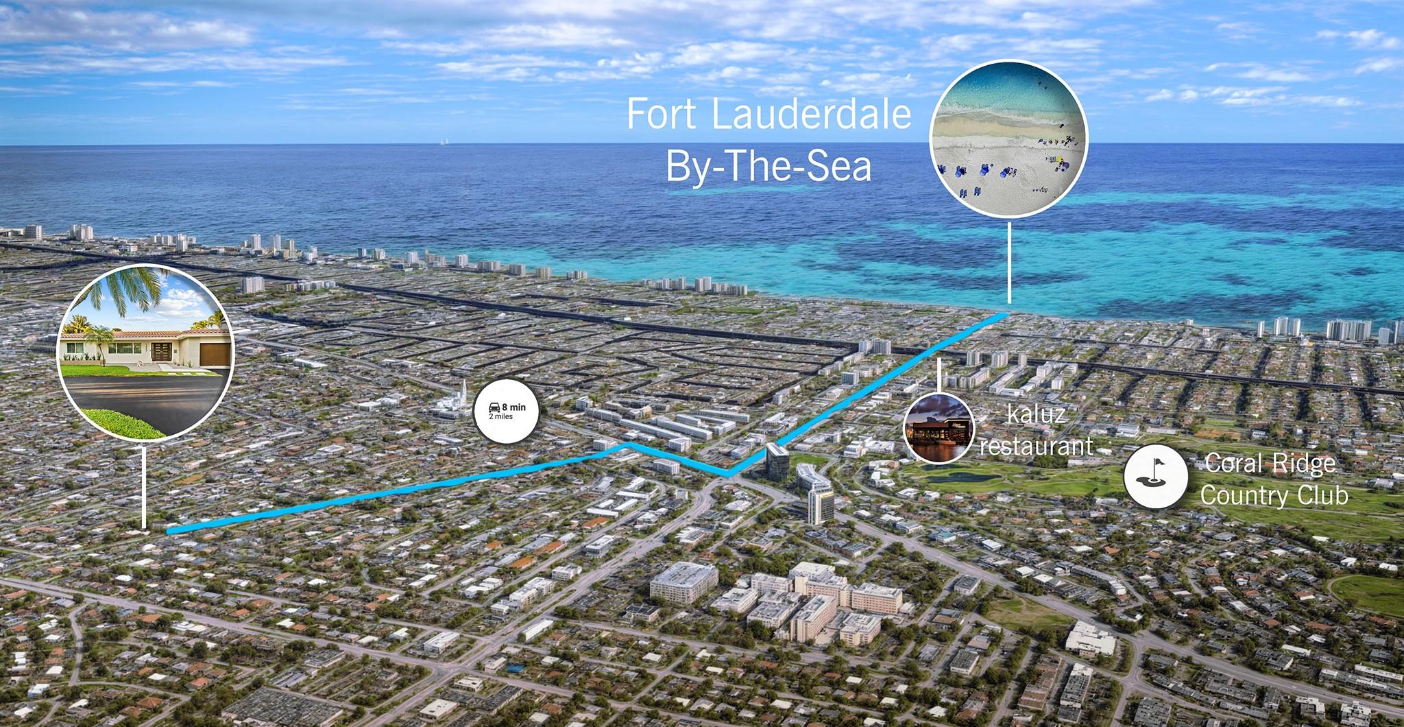 Experience the epitome of mid-century charm blended with modern luxury in the prestigious Coral Ridge neighborhood, just minutes from the pristine beaches and the vibrant heart of Fort Lauderdale. This exquisite fully renovated residence, nestled within a tranquil setting, offers an unparalleled lifestyle with proximity to the Coral Ridge Golf and Country Club, Wilton Manors, Las Olas's shopping and dining delights. The home's thoughtful split floor plan includes an adaptable office space, seamlessly doubling as a fourth bedroom. Interior spaces are bathed in natural light, thanks to expansive walls of glass that forge a harmonious connection between the indoors and a mesmerizing outdoor courtyard and saltwater pool.