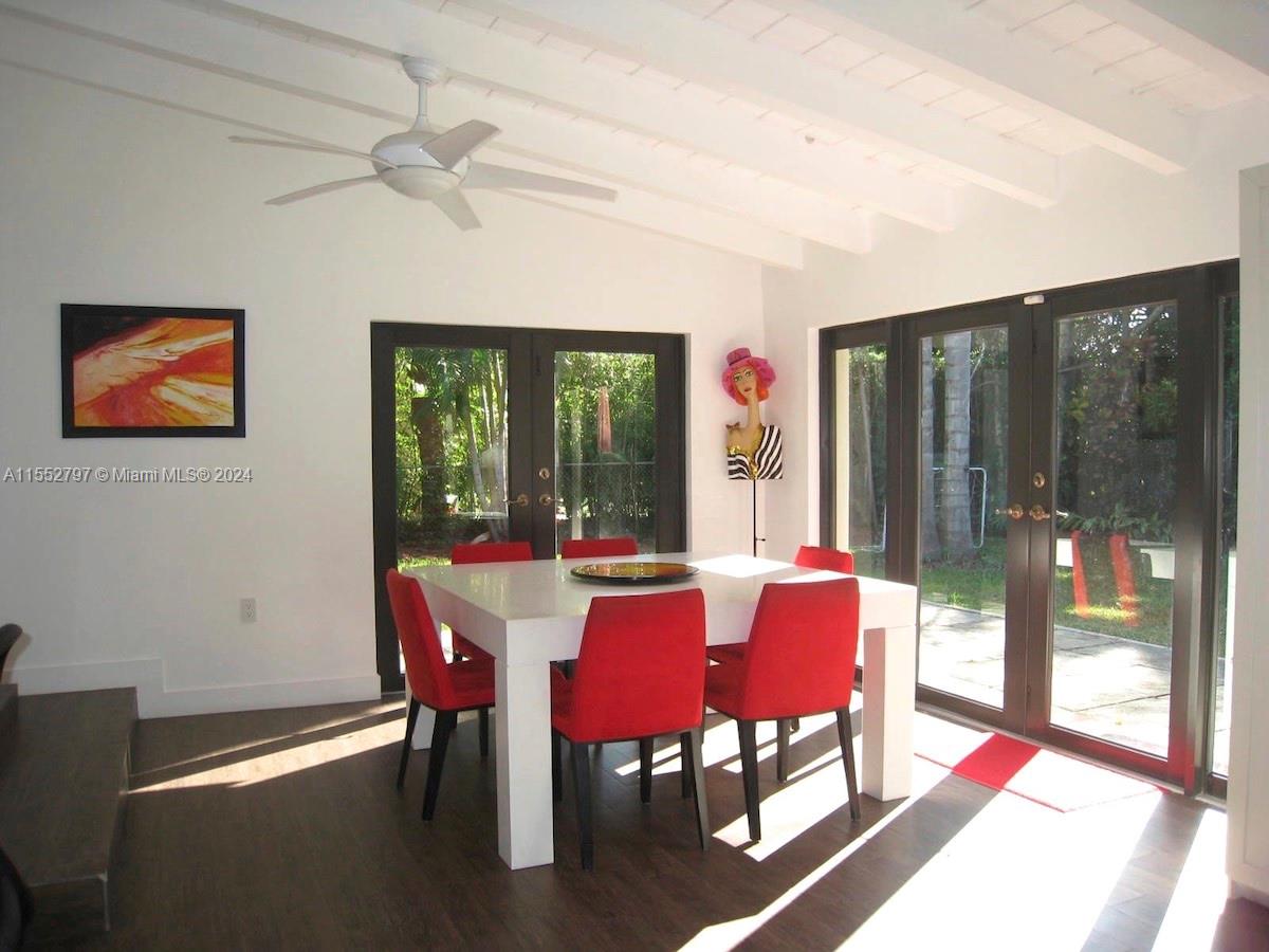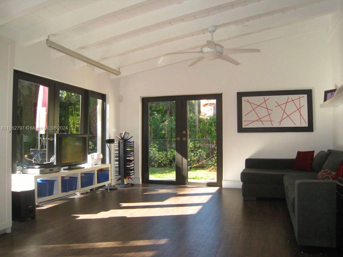 Excellent location! Tastefully updated modern home in South Gables on tree lined street. Open floor plan with large windows bringing in plenty of light. Large family room with French doors opening to landscaped, spacious and private backyard. Sleek modern kitchen and bathrooms. 4th bedroom off of kitchen for office/playroom/maid's room. One block away from coveted Jaycee Park for playground, tennis & basketball. Newer roof and PVC pipes. Living Area = 2,369 per building plan