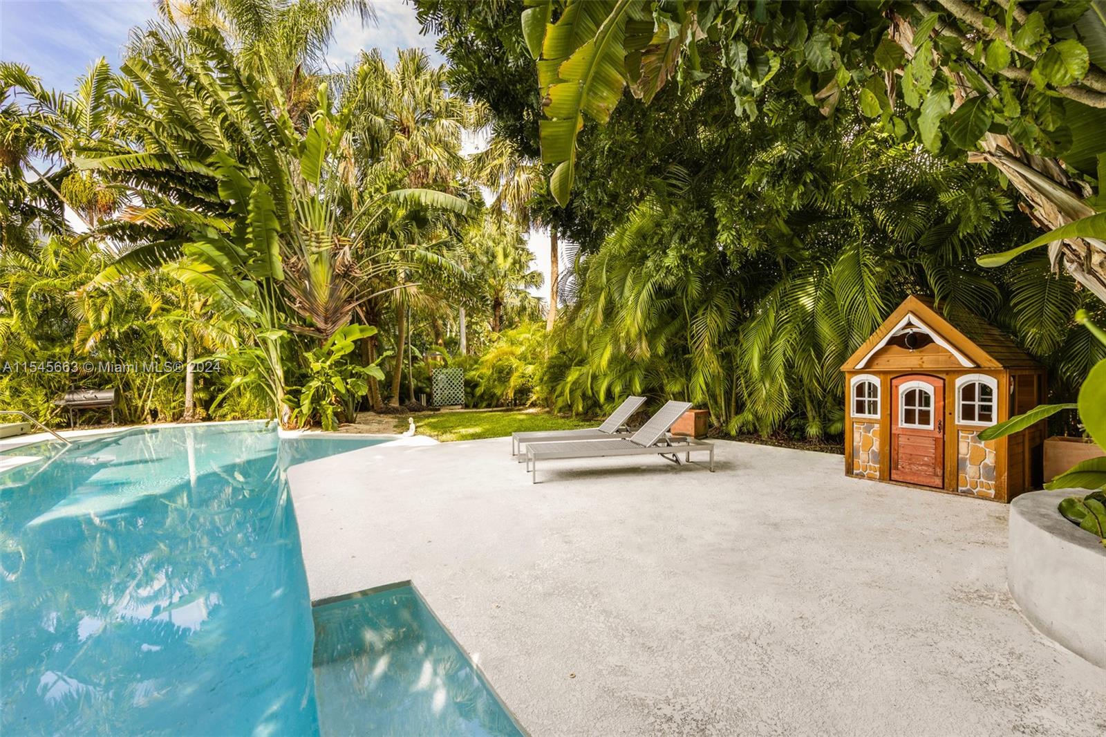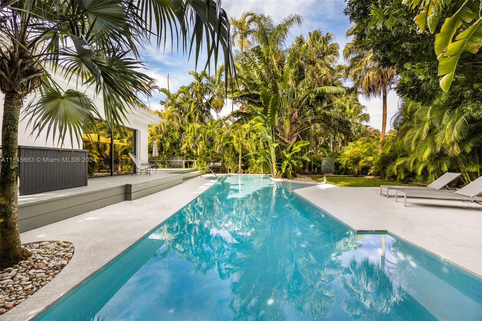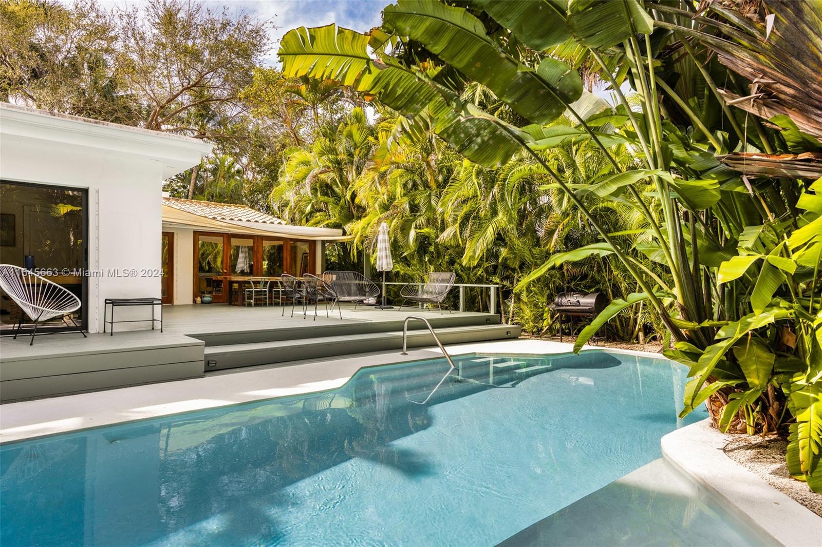 Lovely renovated dream home! This property has been completely updated from top to bottom. Original wood floors have been refinished and beautiful white porcelain tile has been placed throughout the home. Entertain in your stunning, European-style kitchen with Samsung appliances (including a steam oven).Custom kitchen features a quartz waterfall island and rose gold faucet. Each bedroom offers an en-suite bathroom. Primary bedroom looks out to your private, tropical backyard oasis with a true-lap pool (recently resurfaced), The expansive deck is perfect for outdoor living & entertaining. New irrigation system & exterior lighting. Walk to Merrie Christmas Park and enjoy a true Grove lifestyle in this quintessential gem!
