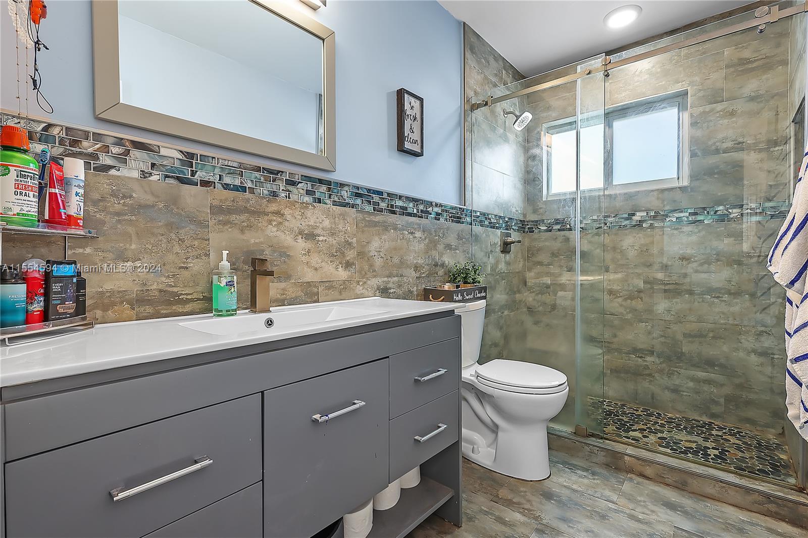 Step into this charming 4-bedroom, 2-bathroom home boasting an inviting open floor plan with beautiful tile flooring and baseboards. This home's beautiful kitchen has custom cabinets, quartz counter-tops, and newer appliances. The bathrooms are modern and offer a stylish vanity and mater bath has a sleek glass shower enclosure. Relax and entertain in style with the spacious back yard and patio which offers a serene tropical retreat at your doorstep. The back yard also offers additional parking. Convenience is key with ample parking provided by the expansive driveway and garage. This home is situated in Country Lakes Manors which is just moments away from shopping, dining, parks, and schools, ensuring that every necessity and amenity is within easy reach.
