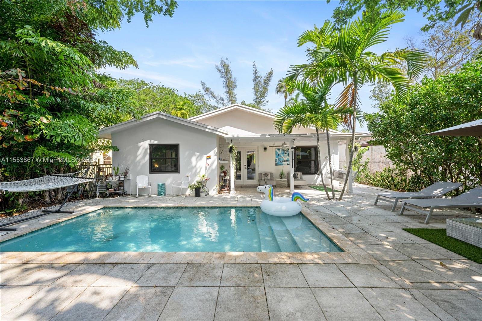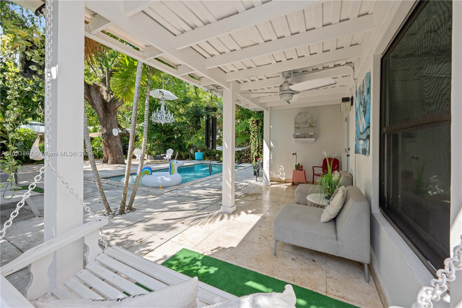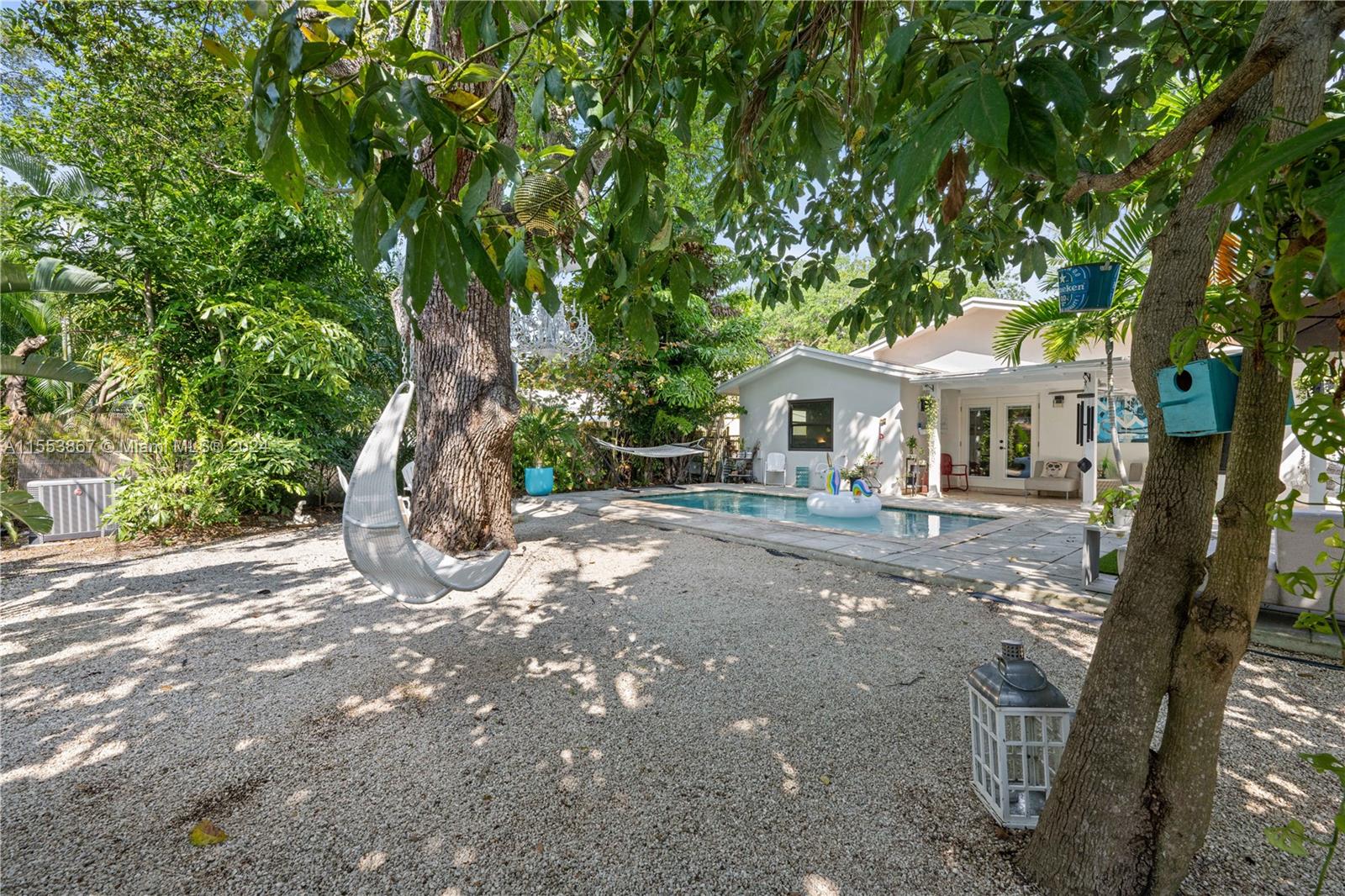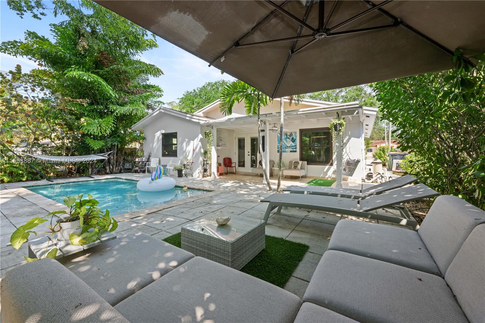This renovated home showcases three bedrooms and two bathrooms, emanating Palm Springs charm from its inviting facade. Step into a whimsical outdoor oasis reminiscent of Alice in Wonderland, where a tranquil pool sits beneath the shade of a majestic oak tree in a lush backyard. Indoors, revel in spacious living accommodations, boasting two distinct living areas and a designated dining space. Enhanced with impact windows for both security and durability, this home also presents a primary bedroom offering serene pool vistas and a sizable walk-in closet. Completing the ensemble, a separate laundry room adds practical convenience to the mix. Constructed in 1986, this home stands as one of the newer residences in the vicinity, blending modern comforts with timeless appeal.