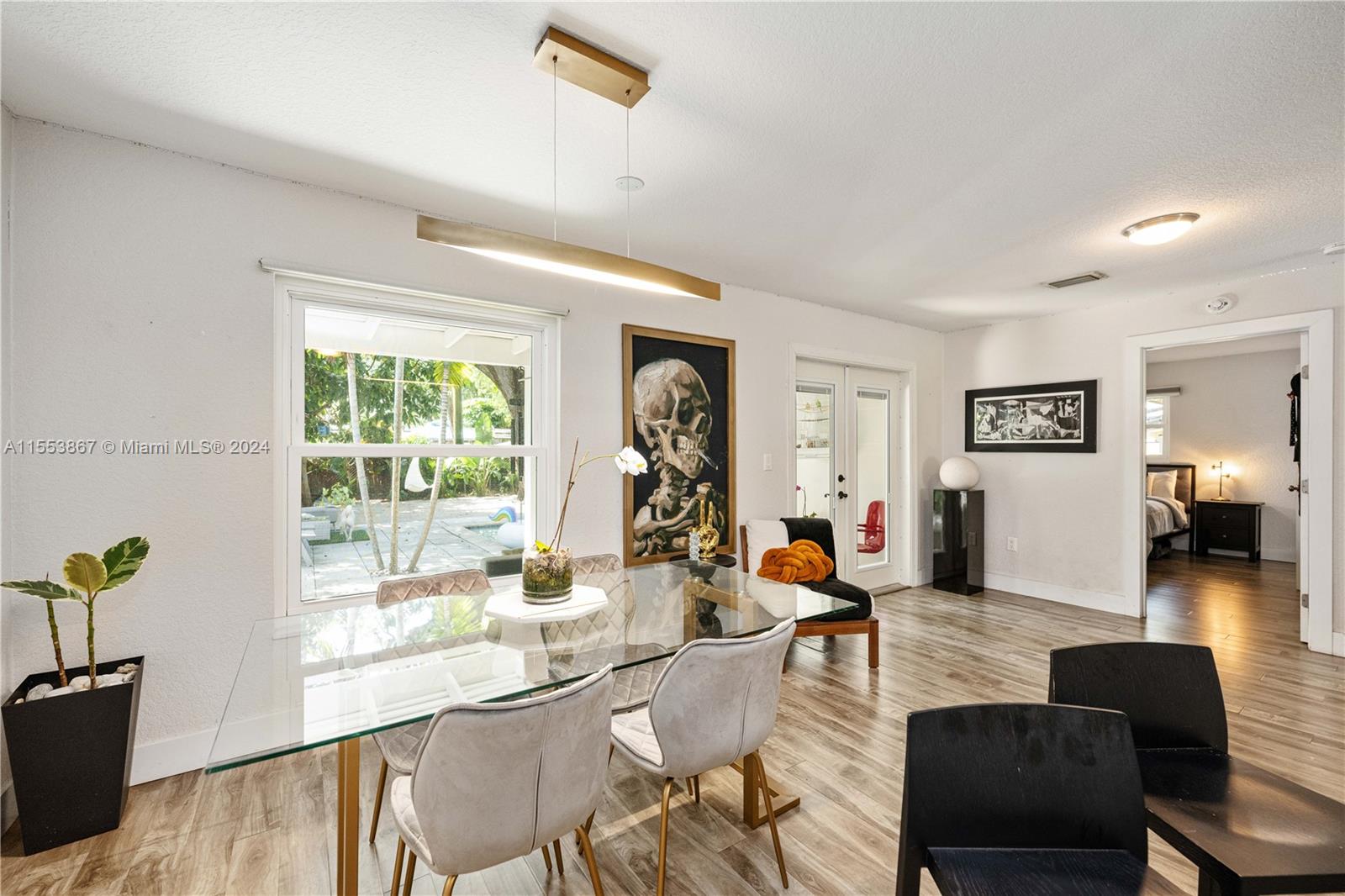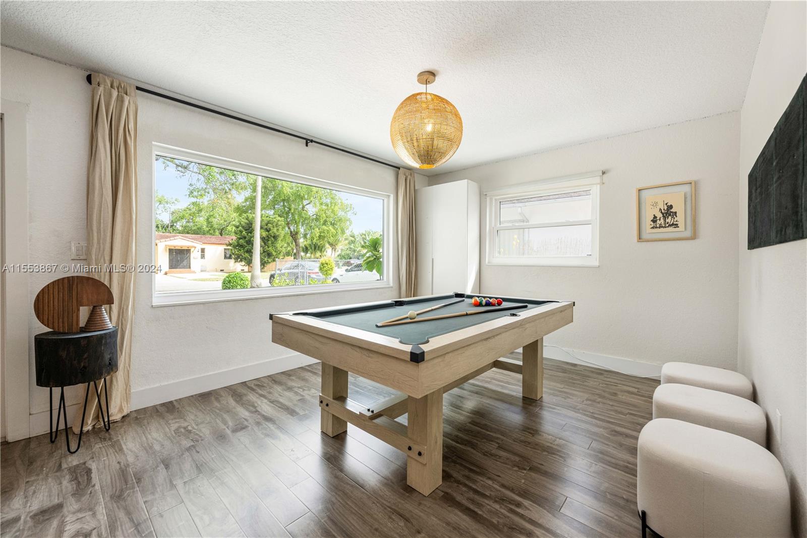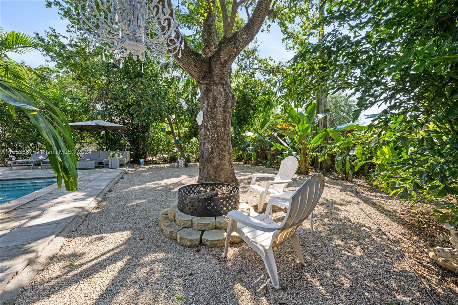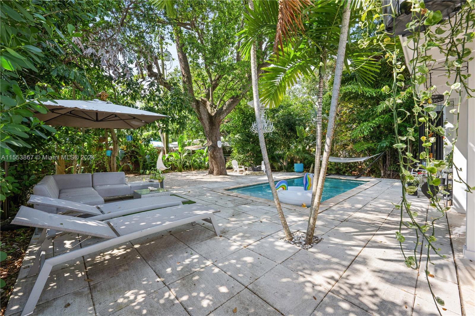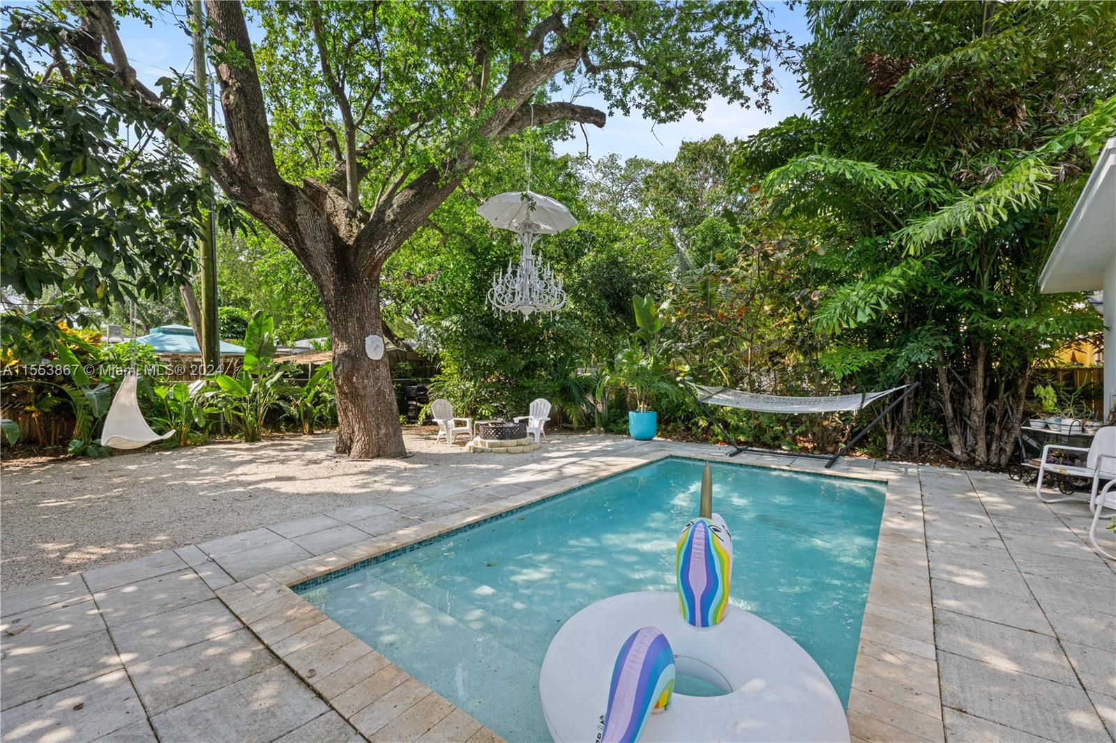 This renovated home showcases three bedrooms and two bathrooms, emanating Palm Springs charm from its inviting facade. Step into a whimsical outdoor oasis reminiscent of Alice in Wonderland, where a tranquil pool sits beneath the shade of a majestic oak tree in a lush backyard. Indoors, revel in spacious living accommodations, boasting two distinct living areas and a designated dining space. Enhanced with impact windows for both security and durability, this home also presents a primary bedroom offering serene pool vistas and a sizable walk-in closet. Completing the ensemble, a separate laundry room adds practical convenience to the mix. Constructed in 1986, this home stands as one of the newer residences in the vicinity, blending modern comforts with timeless appeal.