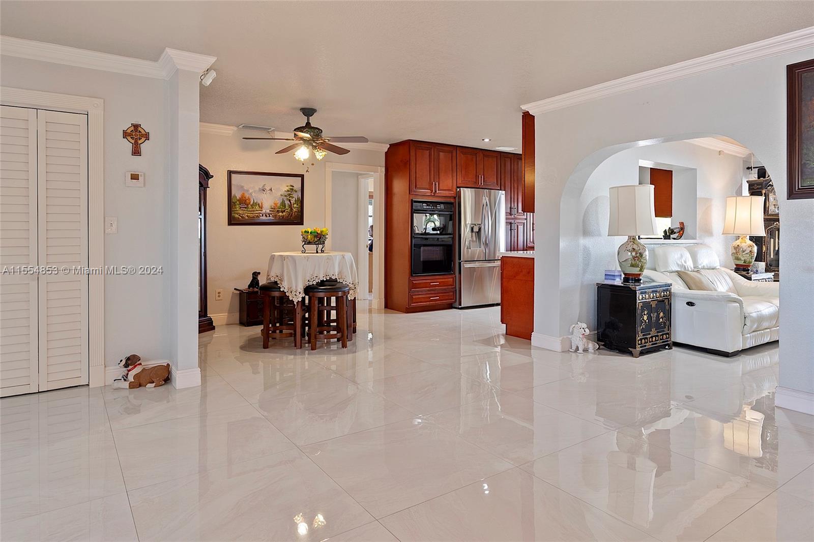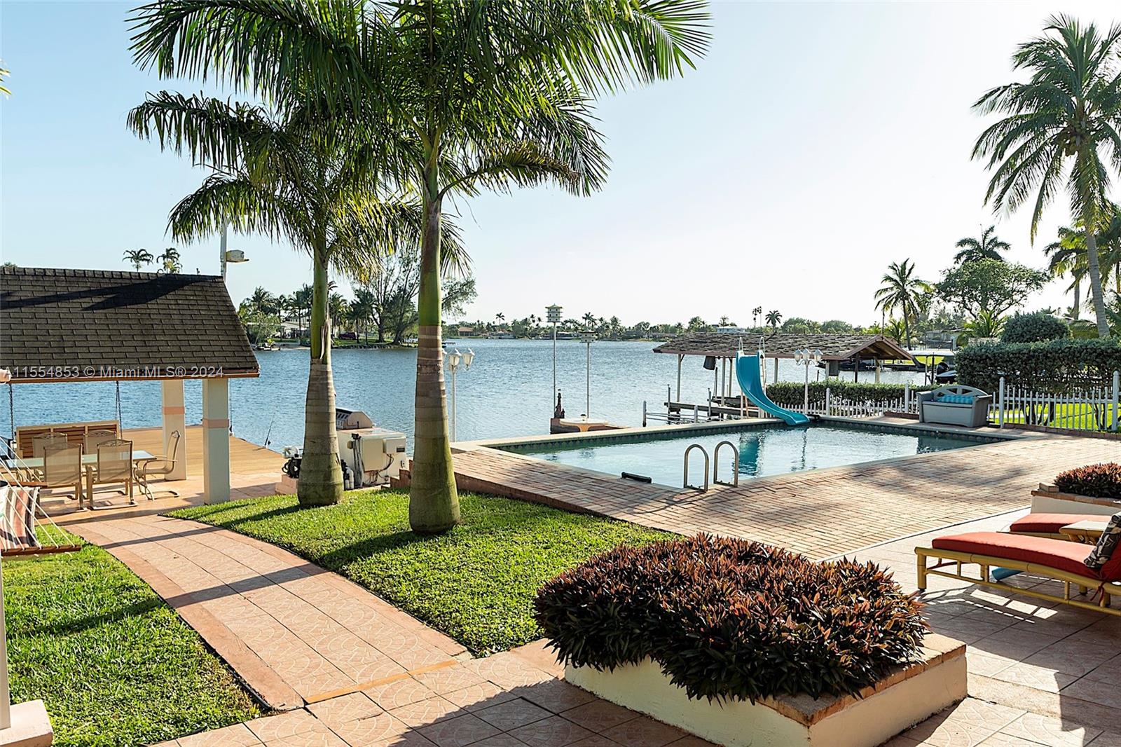Beautiful lakefront home in Palm Springs North! Spacious 3BR/2BA with 1-car garage, circular driveway, porcelain tile, updated kitchen/baths, SS appliances, reverse osmosis system, partial impact windows and full size accordion shutters to supplement. Enjoy a covered patio with bar, saltwater pool, beach area, gazebo/wet bar with grill, and private dock with boat lifts. Prime location near I-75/Turnpike & 826. A must-see paradise!
