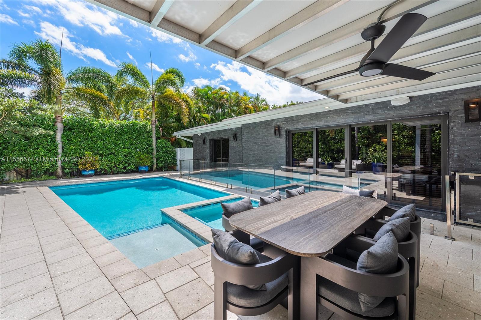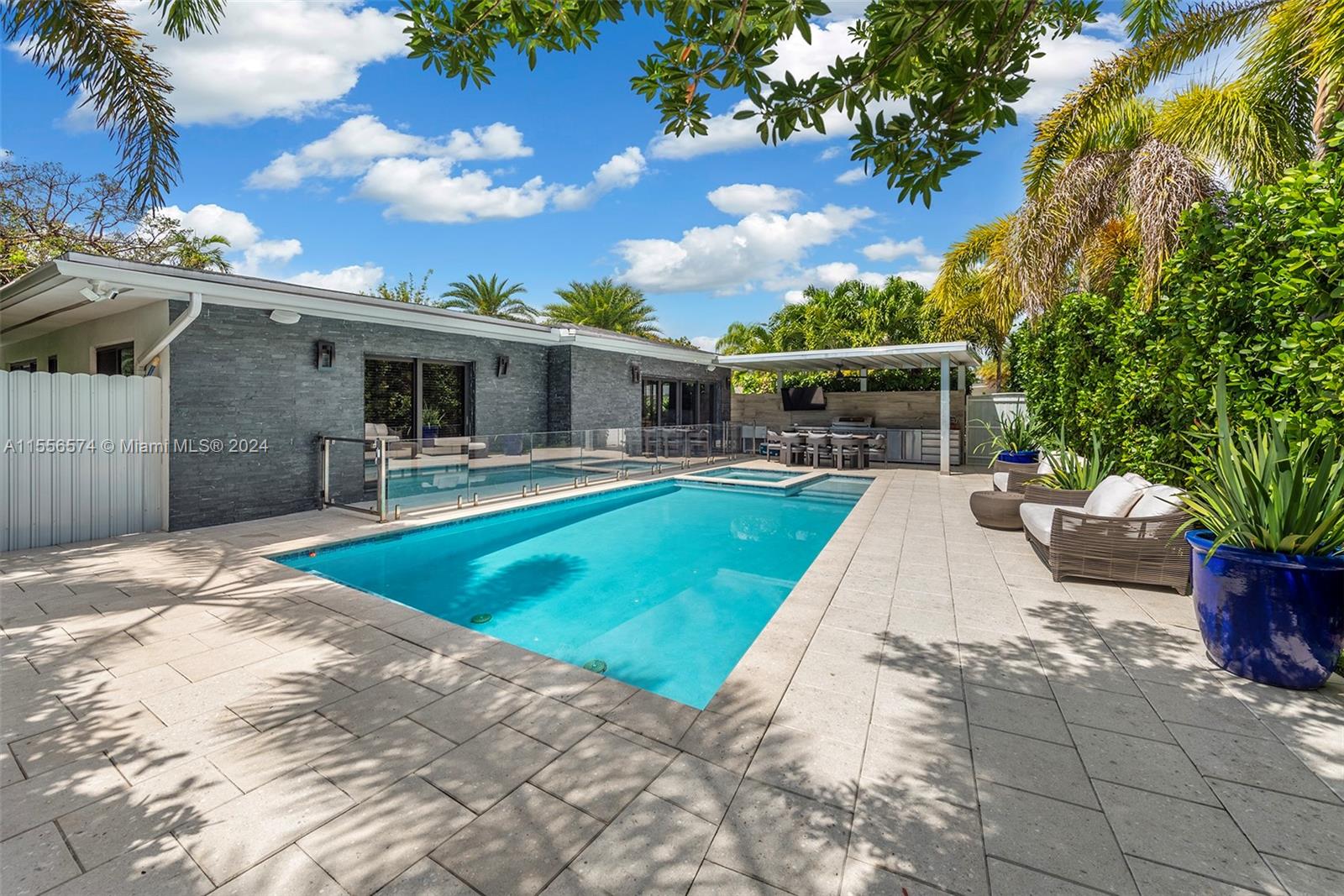 Luxury living in this highly desirable Sky Lake community, where family and schools are paramount. This one-story home is completely renovated and is situated on a spacious corner lot, with lush / mature landscaping offering a tranquil tropical oasis and unparalleled privacy. The outdoor space is an entertainer's delight, featuring an expansive pool, jacuzzi, a well-appointed summer kitchen, and ample side yard for gatherings and relaxation. Meticulously crafted, including motorized blinds, impact windows/doors and porcelain flooring throughout. Italkraft Italian custom kitchen, Miele and Sub-Zero appliances, serves as the heart of the home. Located near top-rated schools, places of worship, shopping and dining, this property offers the epitome of luxurious yet convenient living.