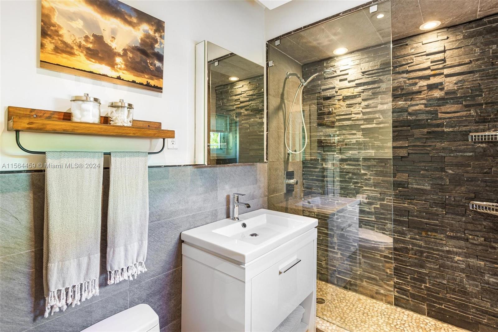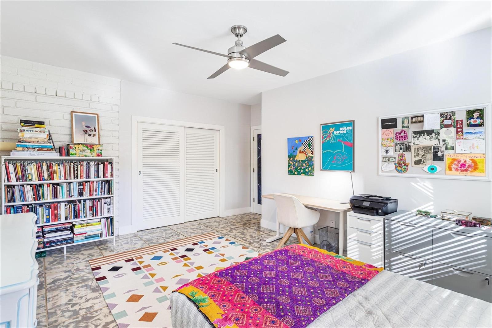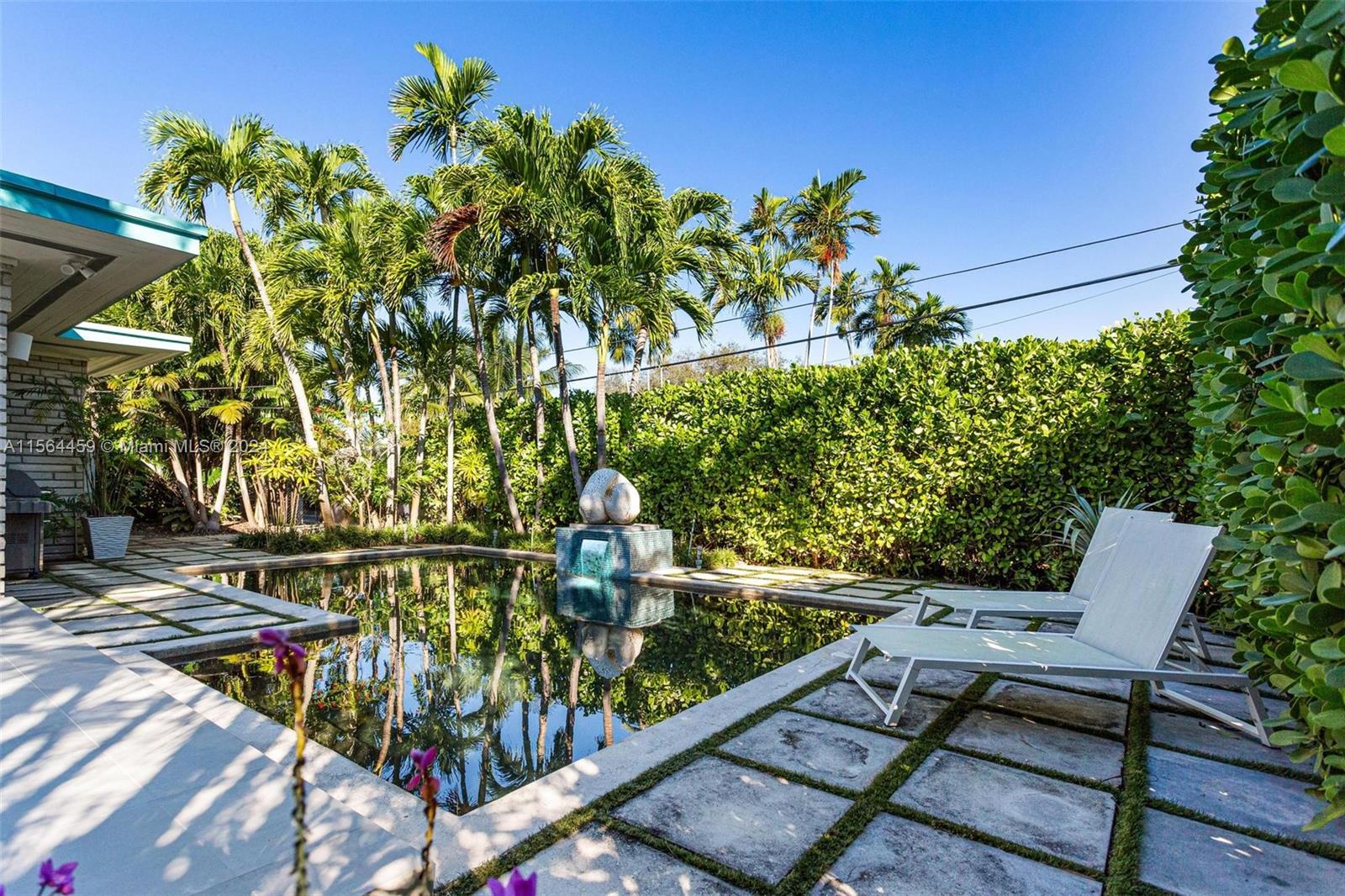 Mid-century gem by Florida tropical modern architect Alfred Browning Parker. A truly special house in Eastern Miami Shores, one block from the bay. Built in 1949, the house features original Cuban tile, cathedral ceilings, soffits, cove lighting, and concrete brick walls. Light filled with garden paradise views. 3 good sized bedrooms, 2 bathrooms. Primary is en suite. The eat-in kitchen features a large island, wood cabinets, and stainless steel appliances including a large sub zero. Outdoor kitchen, patio, and zen pool give a resort feel. Large 2 car garage with storage, laundry, and AC. Impact windows and doors, newer roof and AC units, outdoor lights and sprinklers. Front and rear 2 car driveways and gated backyard. This historically designated design-lover’s dream won't last!