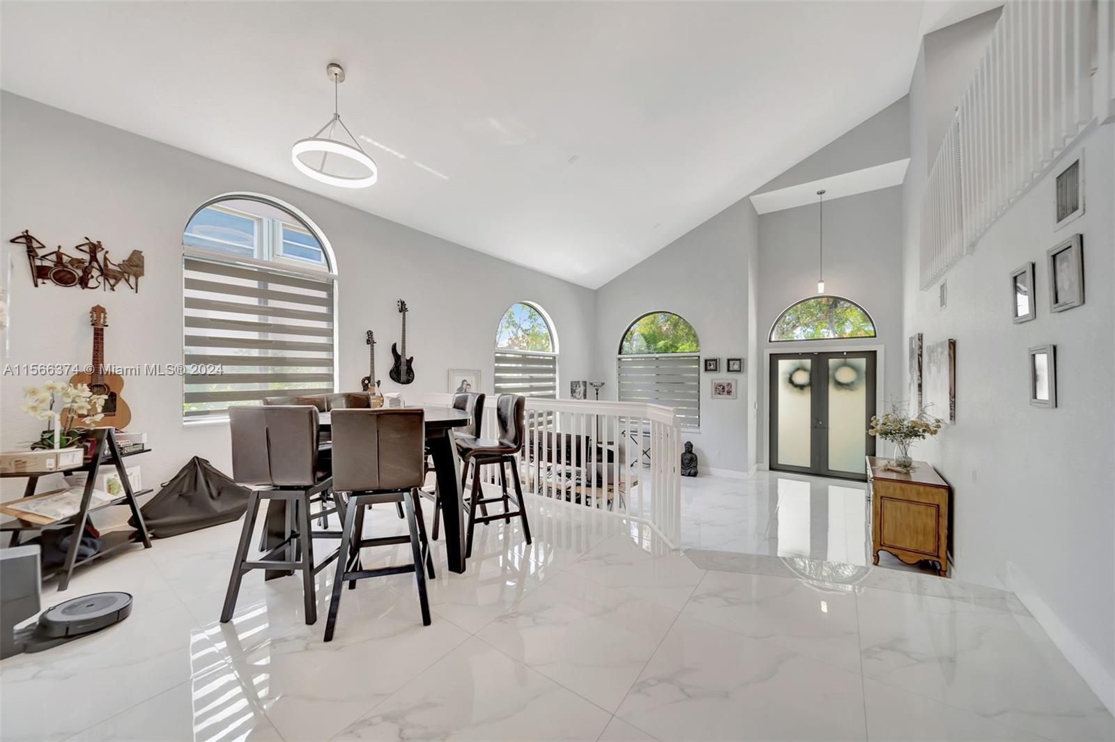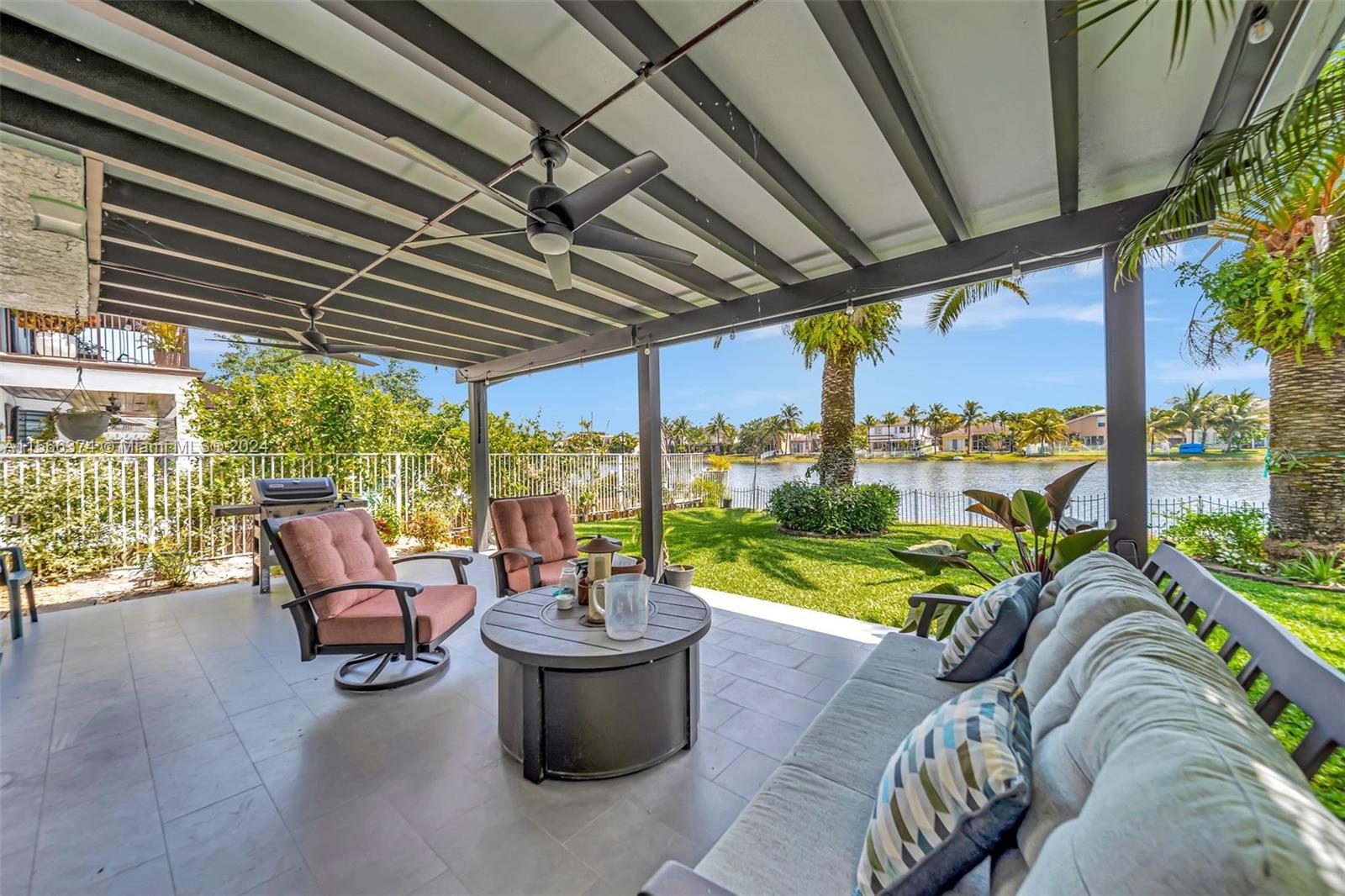 Gorgeous two story, lakefront home in Capri section of Riviera Isles Cambria Model. Very open and bright! Large, remodeled kitchen and new Porcelain tile flooring downstairs with vaulted ceilings. New Impact Windows and Doors thru-out. Original Roof. One Full bedroom & totally remodeled full bath downstairs. Formal dining room, living room and large family room are Perfect for family gatherings. Primary BR upstairs with separate sitting area. Could be office/den. New Covered Gazebo & patio in the waterfront backyard. Serene Tropical Setting. Additional upgrades include New Solar Water Heater, New Water Filter/Softener, Attic insulation & solar attic fan keep the house nice & cool. Separate Laundry Room in house. Riviera Isles has a 24/7 manned guard gate & amazing community pool.