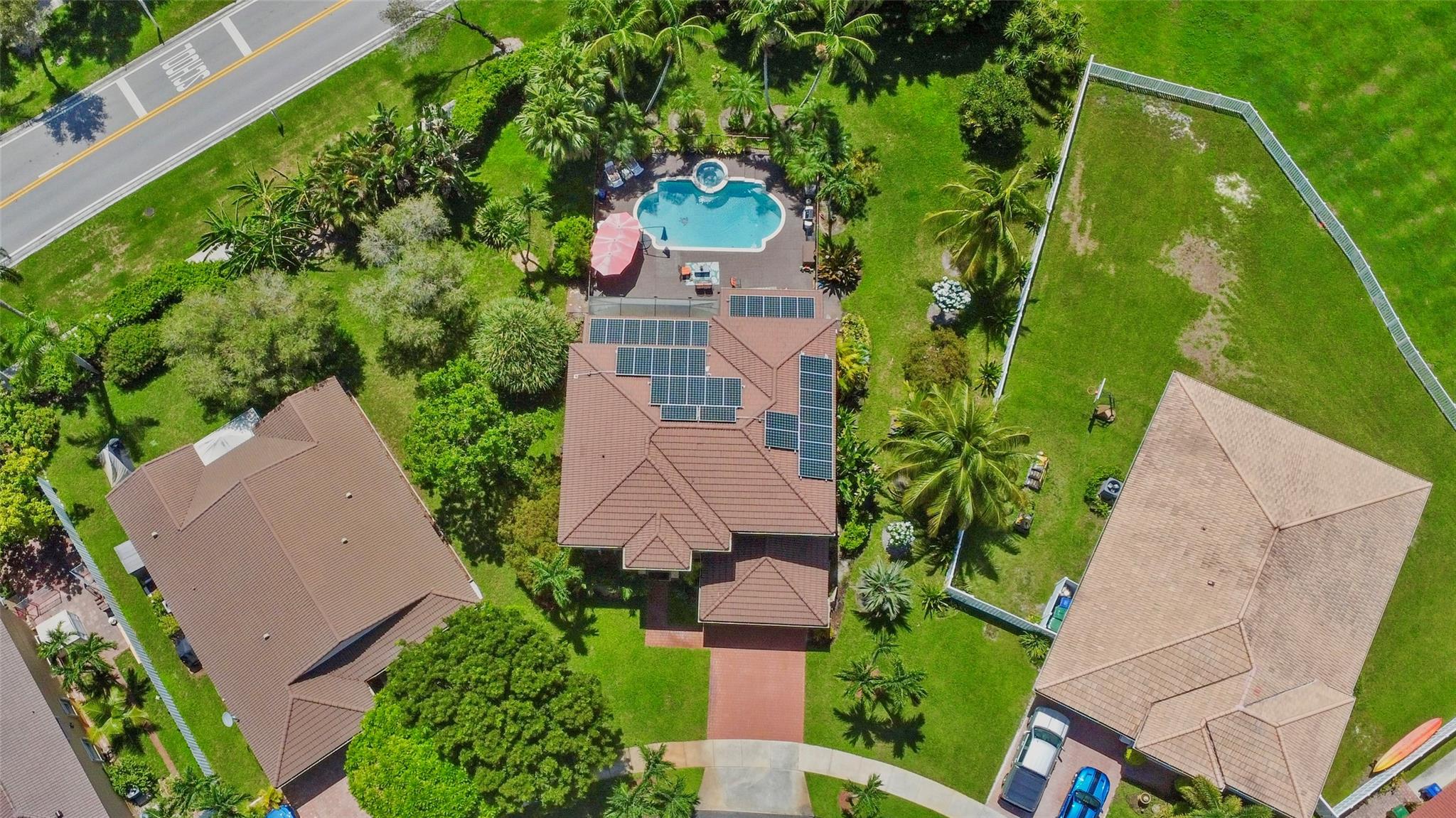 Price to sell!!! Sought-after Monarch Lakes/ Tequesta Cove gated community, this two-story gem boasts 4 beds plus a den (easily convertible to a 5th bedroom) Plus 3 full bathrooms and 1/2 Bath for guest. Situated on an expansive lot with a heated pool and jacuzzi, as well as a screened covered patio ideal for entertaining, beautifully landscaped tropical oasis complete with palm, coconut, mango and avocado trees. Featuring two master bedrooms, one conveniently located downstairs with its own private entrance and bath, this home offers luxurious touches like Zebra blinds, an alarm system, Recently renovated, the home boasts a chef's dream kitchen with double oven and gas stove, plus enjoy significant energy savings with 31 solar panels and a tankless hot water heater.