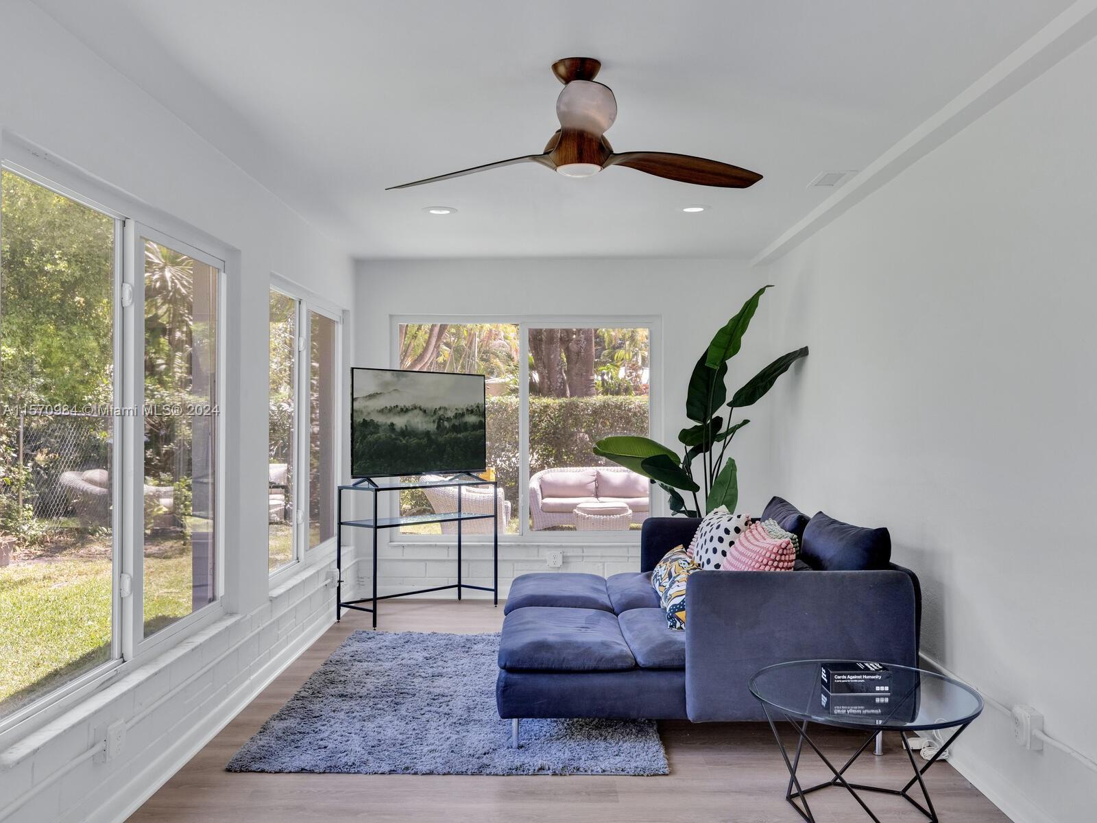 Welcome to the Sunny Modern Ranch! Discover timeless comfortable luxury in this beautifully-updated sun-soaked mid-century modern home. Enter into a fantastic open-flow floor plan with multiple living areas, large updated designer kitchen with breakfast bar, separate dining, and bonus media-sunroom-den flex space with wrap-around windows overlooking the green gardens. Sleep easy in two bright spacious bedrooms with generous closets. Great features: gorgeous brand new “white oak” LVT floors; updated designer double-vanity bathroom; and impact windows-doors. All on a large, non-flood zone corner lot with a private, peaceful two-zone backyard with room for a pool, just a few blocks to downtown Miami Shores shops and restaurants. You’ll agree— it’s always sunny at the Sunny Modern Ranch!
