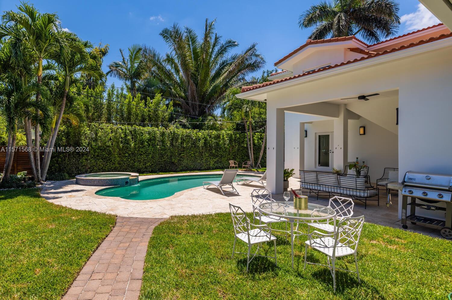Welcome to Watersong! This magical, rare, five-bedroom secluded East Miami Shores mid-century modern pool home flows like a poem and will be music to your ears! Enter through a welcoming front porch into multiple cascading living areas with high ceilings, a designer eat-in kitchen and dining, opening through sliding doors to a grand vaulted covered terrace, lush fenced private gardens and sparkling pool and spa with soothing fountain feature—perfect for entertaining or relaxing. Great open-flow plan with five split spacious bedrooms (three are full ensuites). Fantastic features: modern designer kitchen and baths; hardwood floors; newer concrete tile roof; impact windows-doors; upgraded electrical-plumbing; and new smart-zoned AC system. All in one of The Shores’ most prestigious locations!