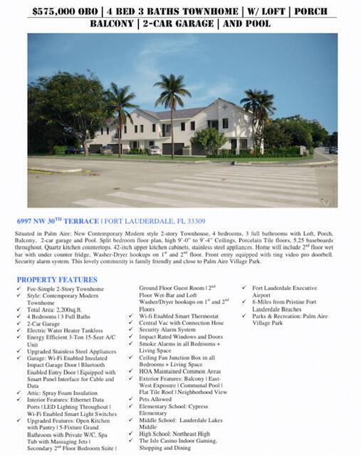 New Townhomes just broke ground! This contemporary 2-story townhouse is located in Palm Aire and has 4 bedrooms and 3 full bathrooms. This modern home comes with a loft, porch, balcony, 2-car garage, and community pool. The split bedroom floor plan features high 9'-0'' to 9'-4'' ceilings and porcelain tile floors throughout. Equipped with state of the stainless steel appliances, ring pro door bell, washer/dryer hookup, and much much more. This is a must see! Owner will pay $10k towards closing costs!