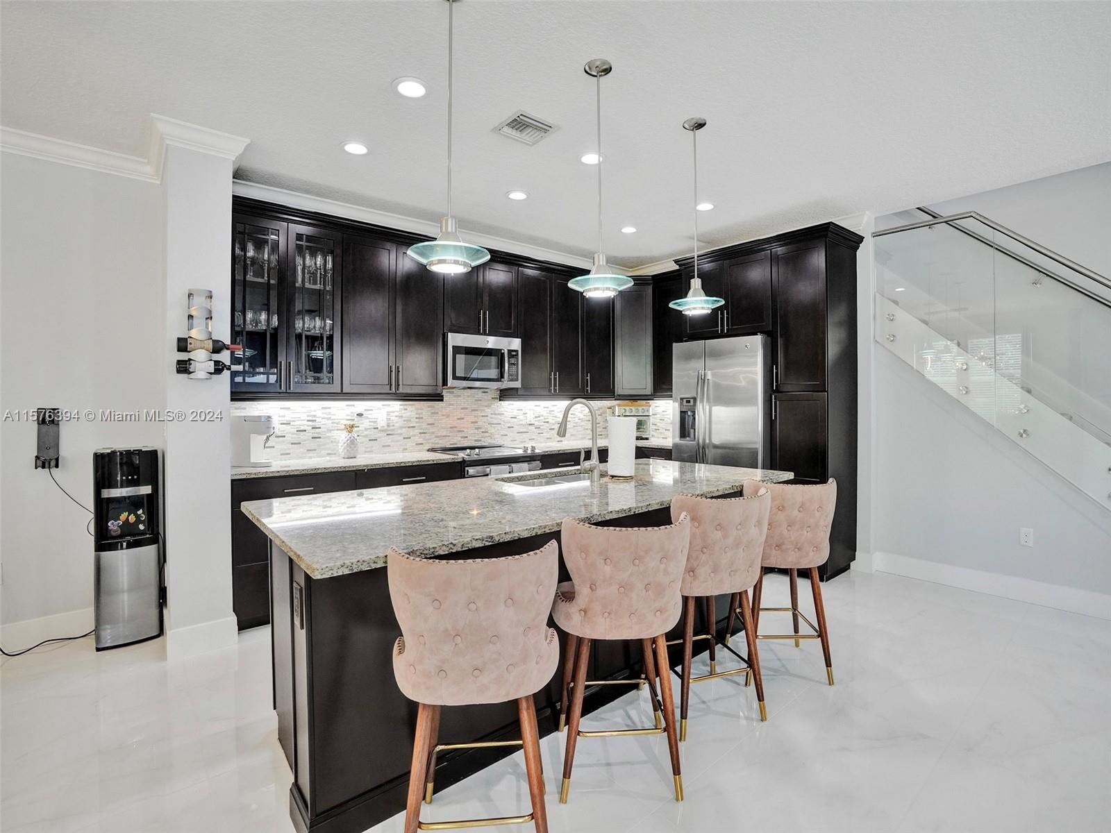 This beauty is located in the heart of Davie. The home was built in 2017 and sits on a highly sought after corner lot with a double length driveway. The homeowners have taken meticulous care of the property and spent countless dollars improving the home. Some of the improvements include 24X48 Porcelain tiles, Glass stairs, Crown molding throughout entire home; Complete full home LED light conversion; Frameless showers; Travertine patio w/ Artificial grass back yard. Kitchen features 42” cabinets with crown molding & Under cabinet LED lights. Home also has a custom feature wall, California closet built ins. Features a large Master bedroom with a spacious master bath w/ Jacuzzi tub.Amenities include community pool,Playground and Cardio room. This home is truly move in ready for you to enjoy!