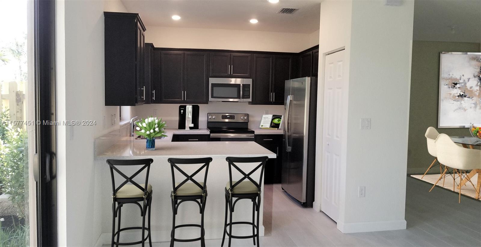 Luxury Townhouse in the heart of Davie! Townhouse is located on a spacious corner lot. Built in 2019 with 3 Bedrooms and 2.5 Bathrooms, with family room. Inside gated community of Magnolia Trails, No Neighbors on back or left side of house. Blinds included, Impact windows and one car garage and driveway w/fenced back patio. Energy Efficient A/C and water heater. All bedrms with closets including a walk in closet in Primary Bedrm. Kitchen is custom finished with contemporary white Quartz countertops and Stainless steel appliances. Porcelain tile floors throughout 1st and 2nd floors. Close to A Rated Schools, supermarkets, shopping ctr, restaurants and minutes away from Turnpike,I-595 and I-95. Across from community pool and guest parking.Staged Fotos