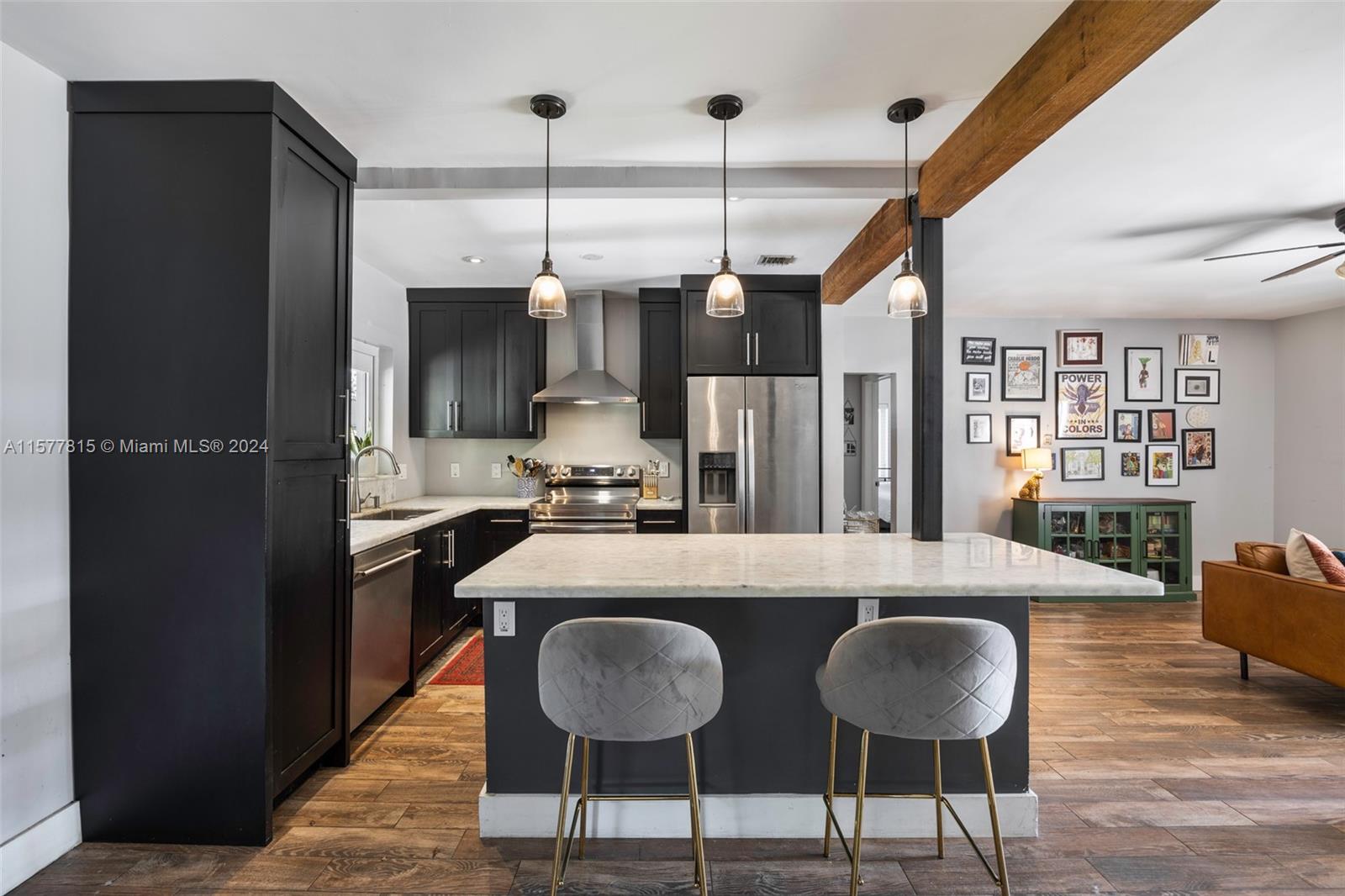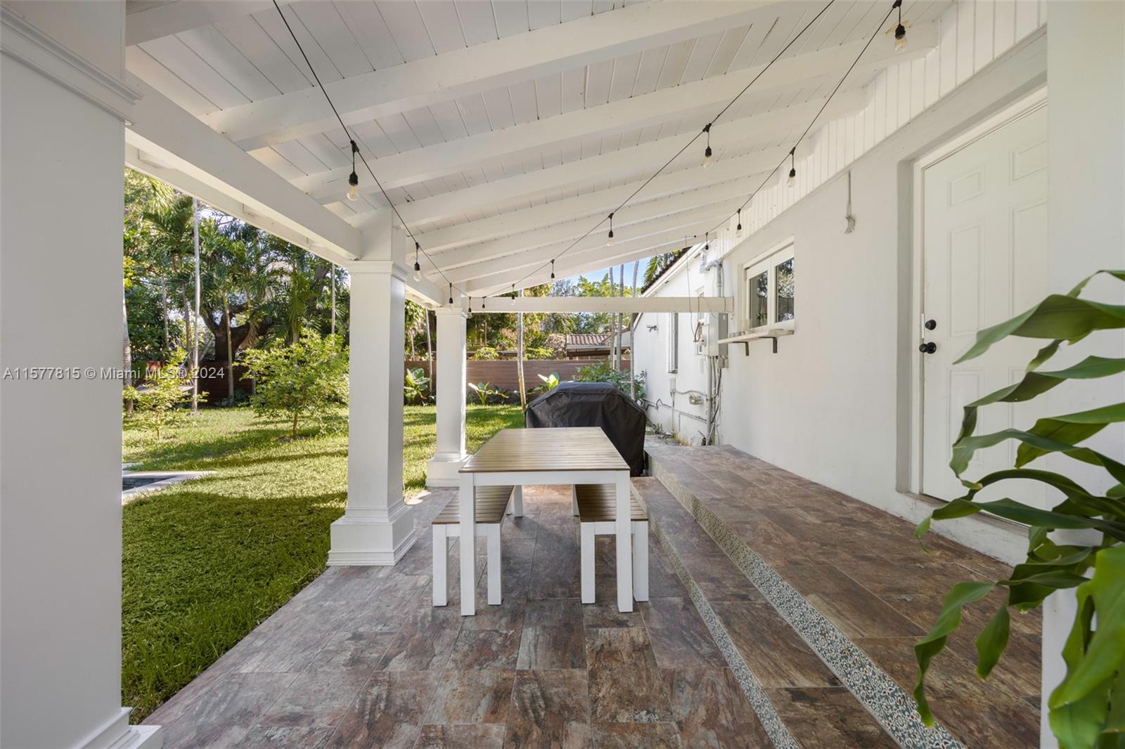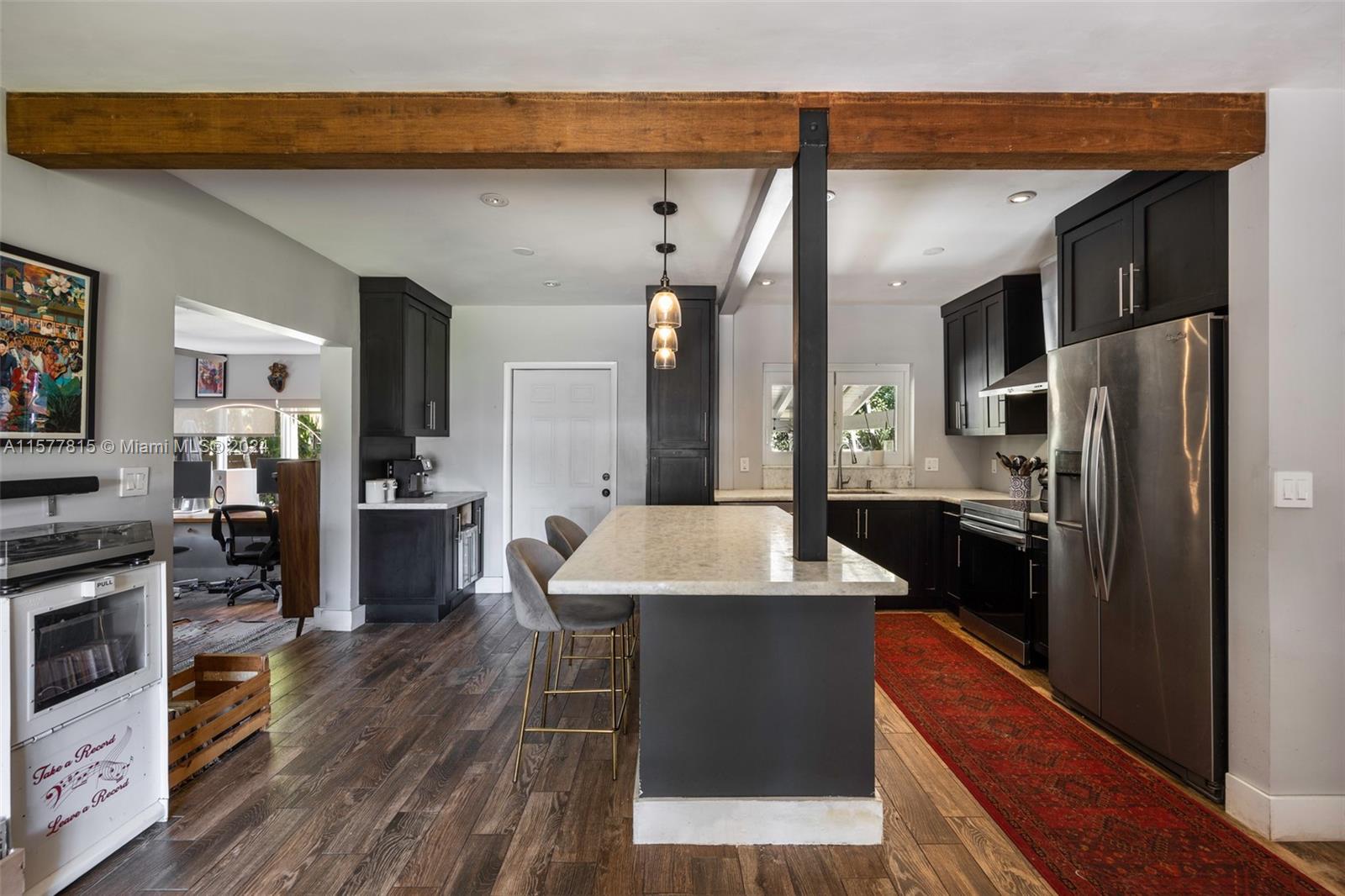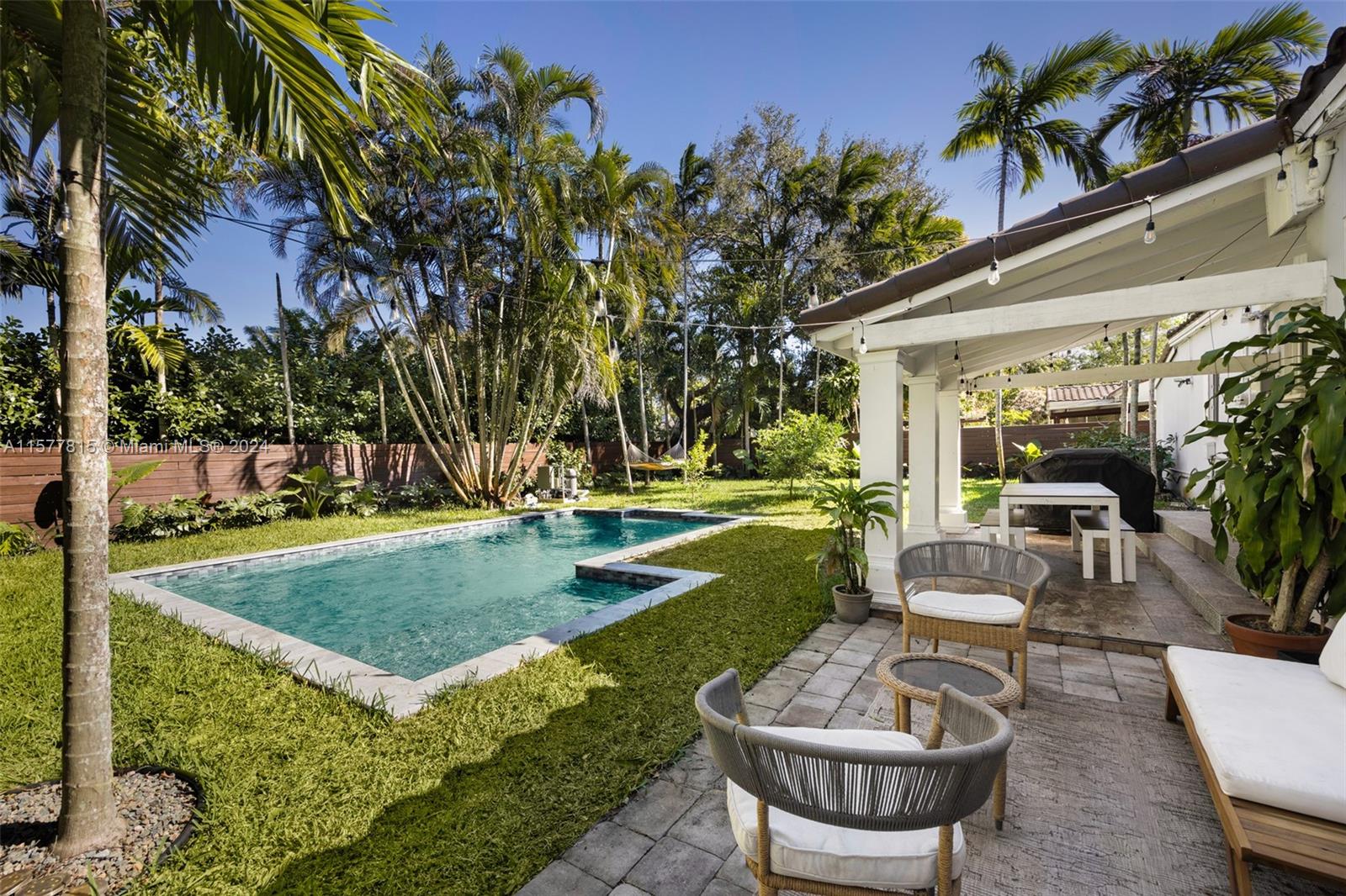 Welcome to your dream Miami Shores oasis that effortlessly blends the cool, laid-back vibes of LA with the vibrant energy of Miami. Set on a quiet street, this 2/2 + den home is where modern renovations meet original charm. Step inside the light-filled living area highlighted by the cozy fireplace and open beams. Enjoy a completely updated kitchen with a large island and quartz countertops, separate Florida Room overlooking the dreamy patio + pool, primary bedroom with spacious closet + en-suite bathroom and 1-car garage. The covered patio is an entertainer's dream and overlooks a new (2023) salt water pool and tropical landscaping. Impact windows, new roof (2020), PVC plumbing and oodles of curb appeal...this home truly has it all.